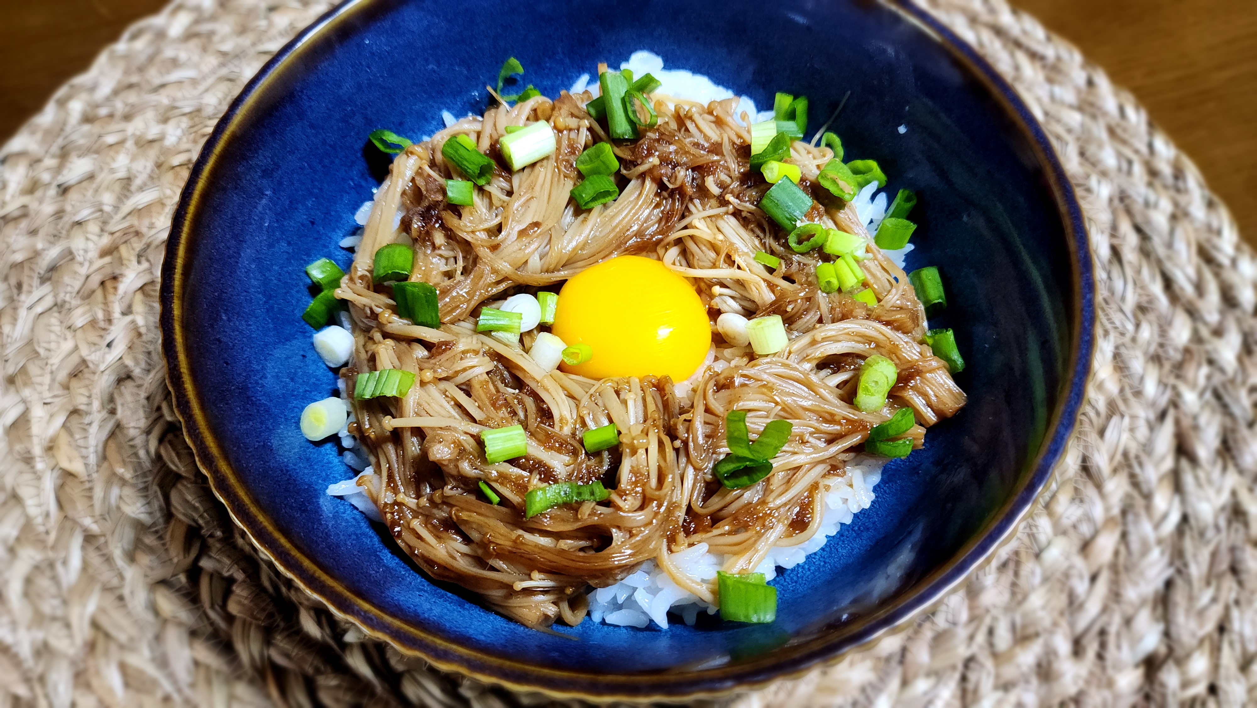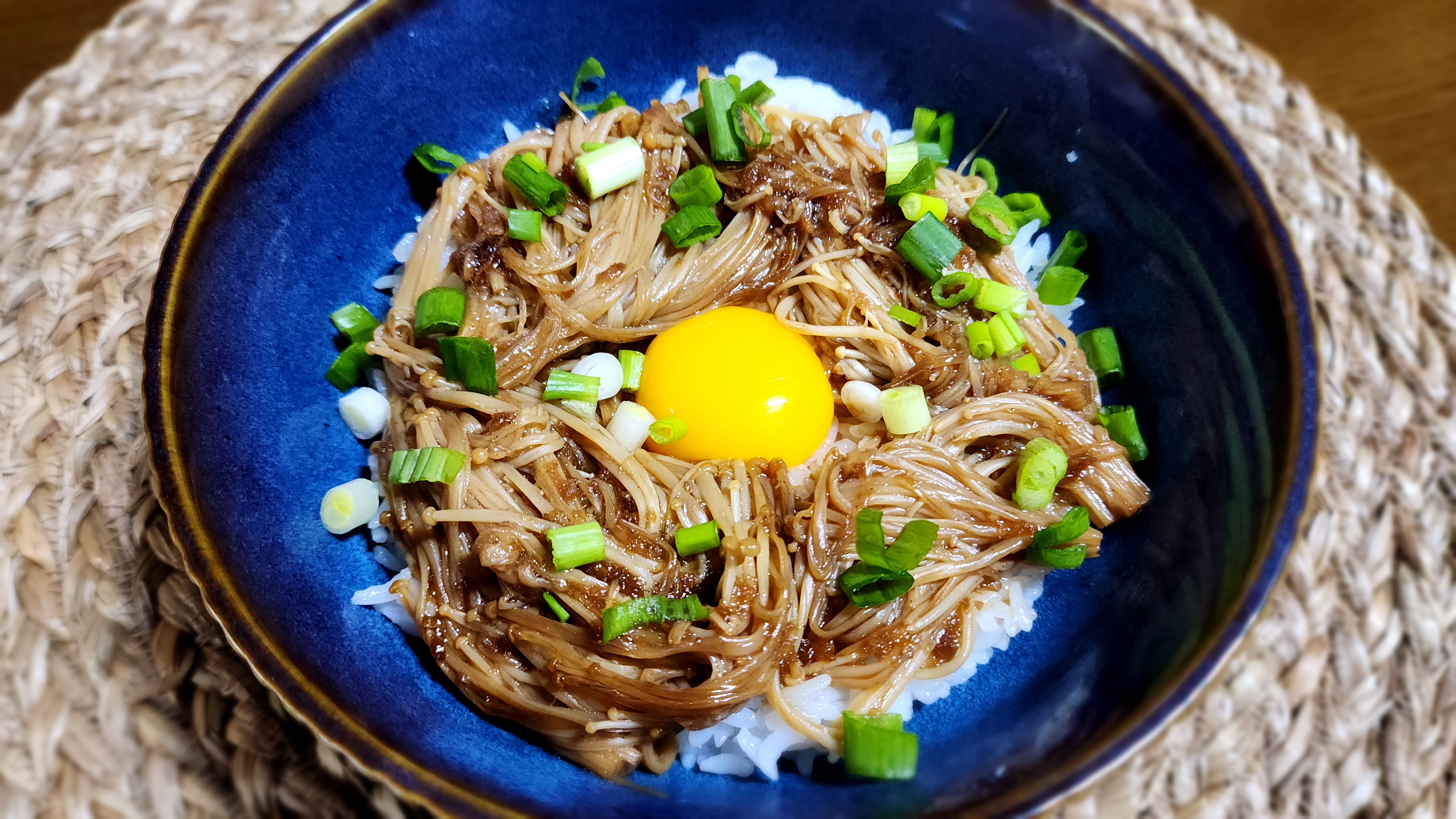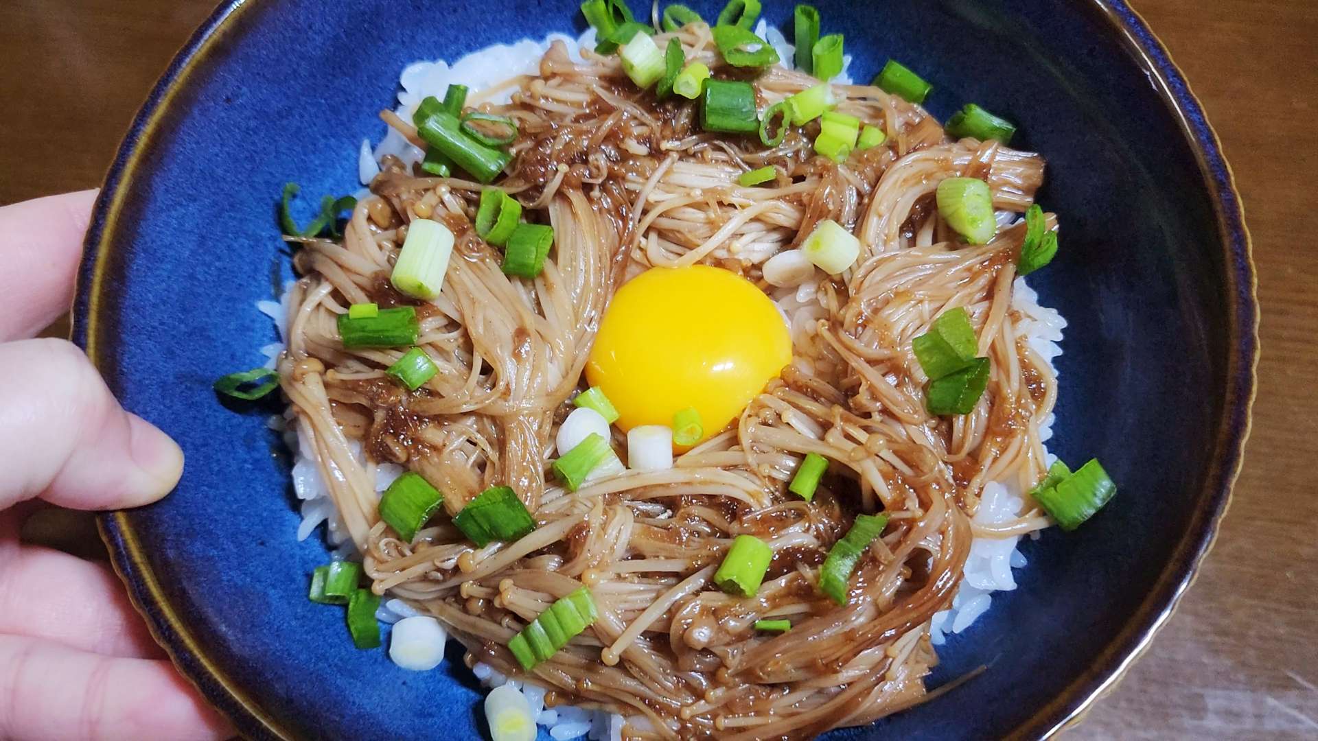 재료: 팽이버섯 1줌, 시판 불고기 소스 2T, 간장 1T, 참기름 1T, 밥 1공기, 달걀노른자 1개, 쪽파 1줄기