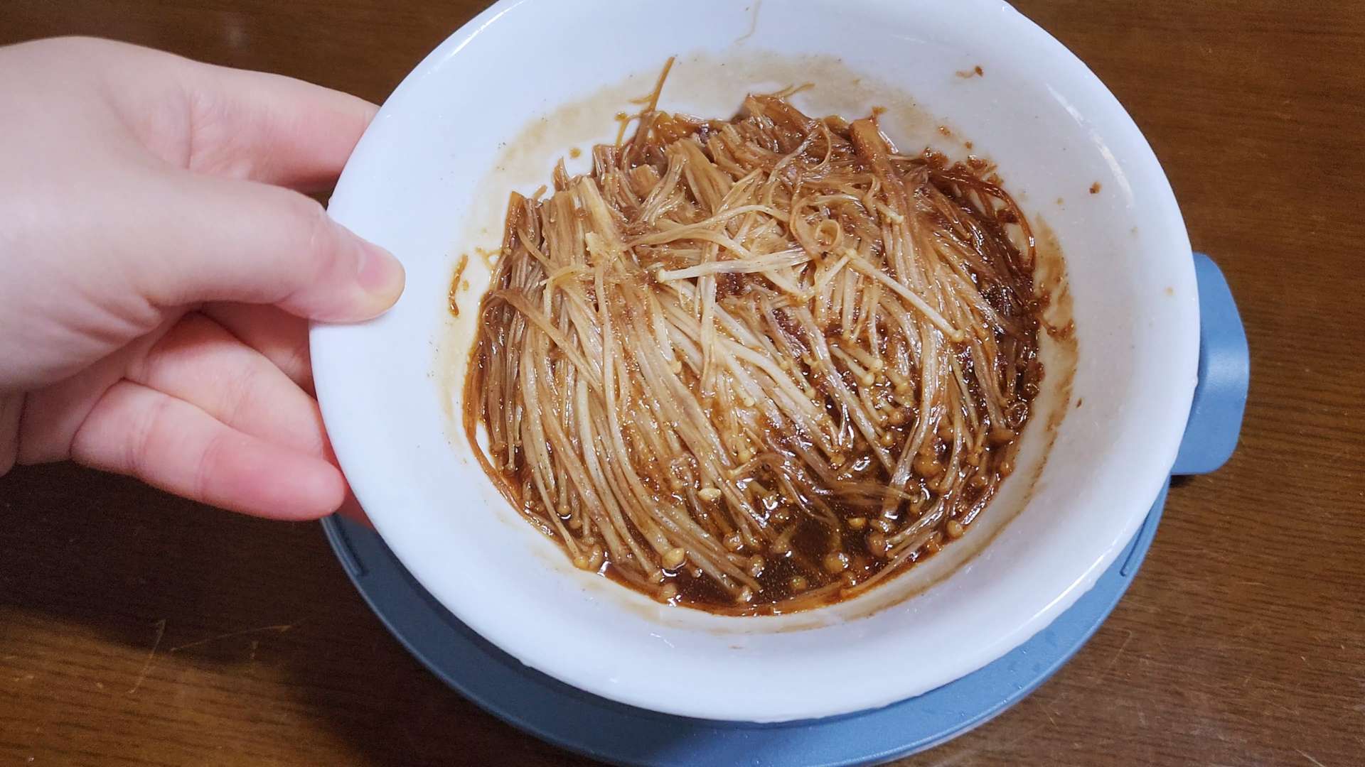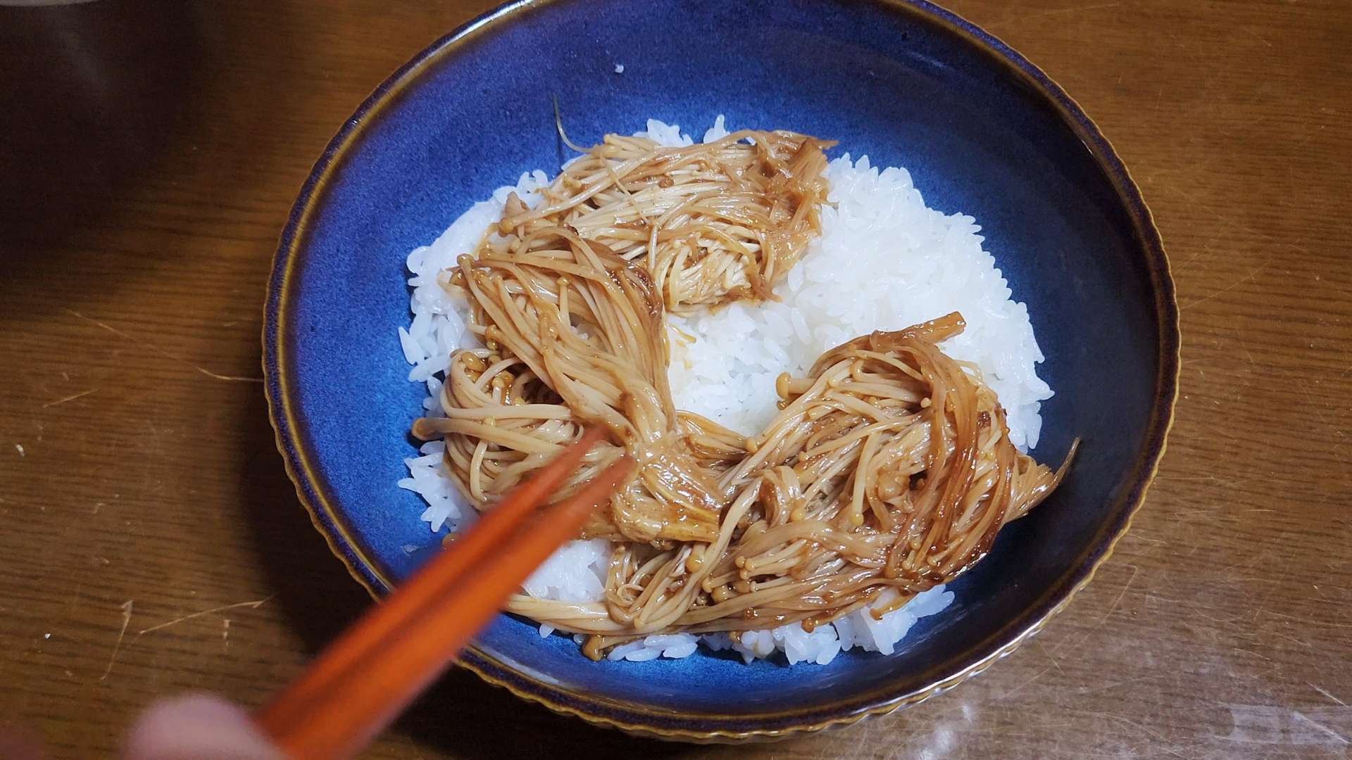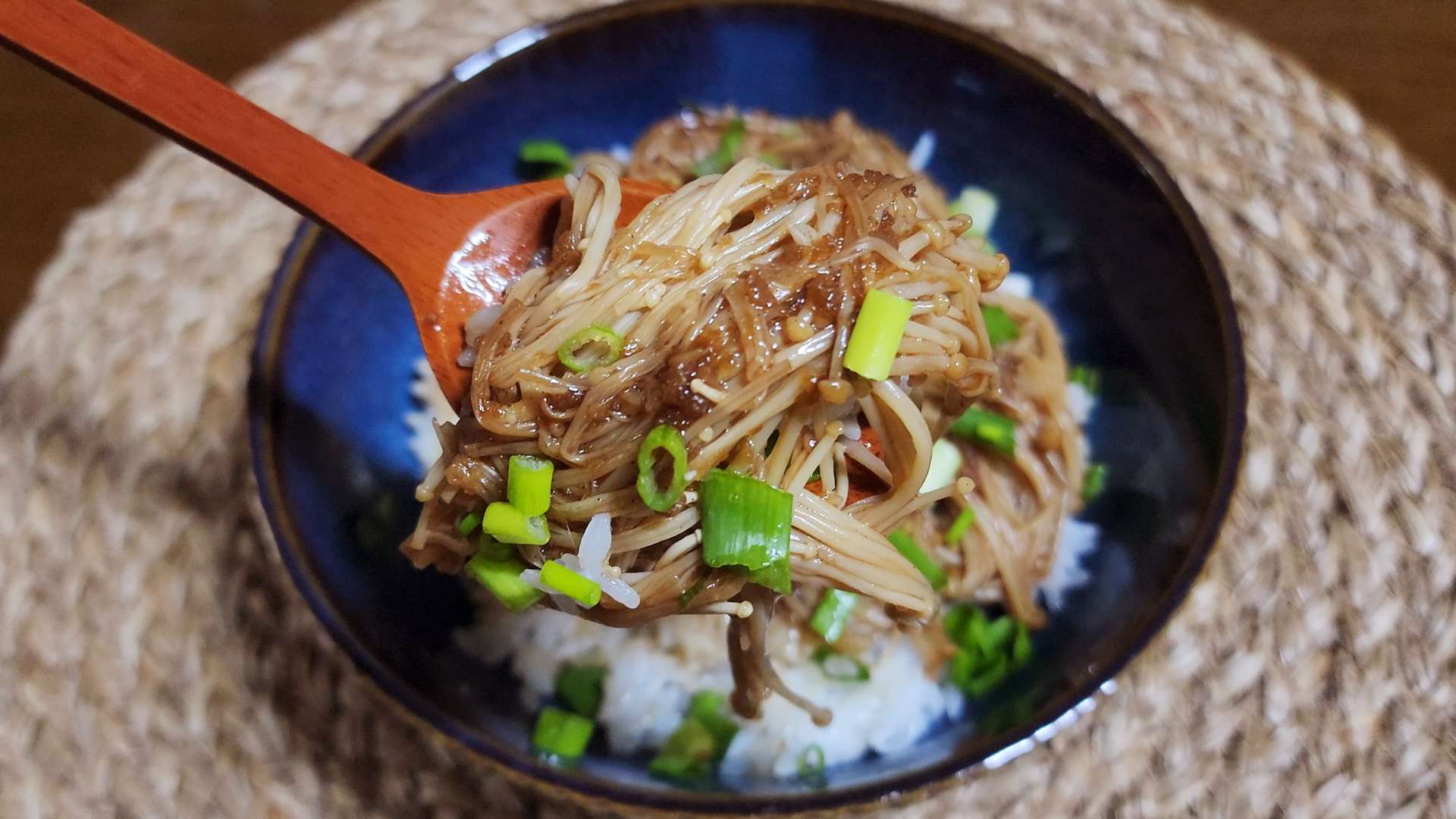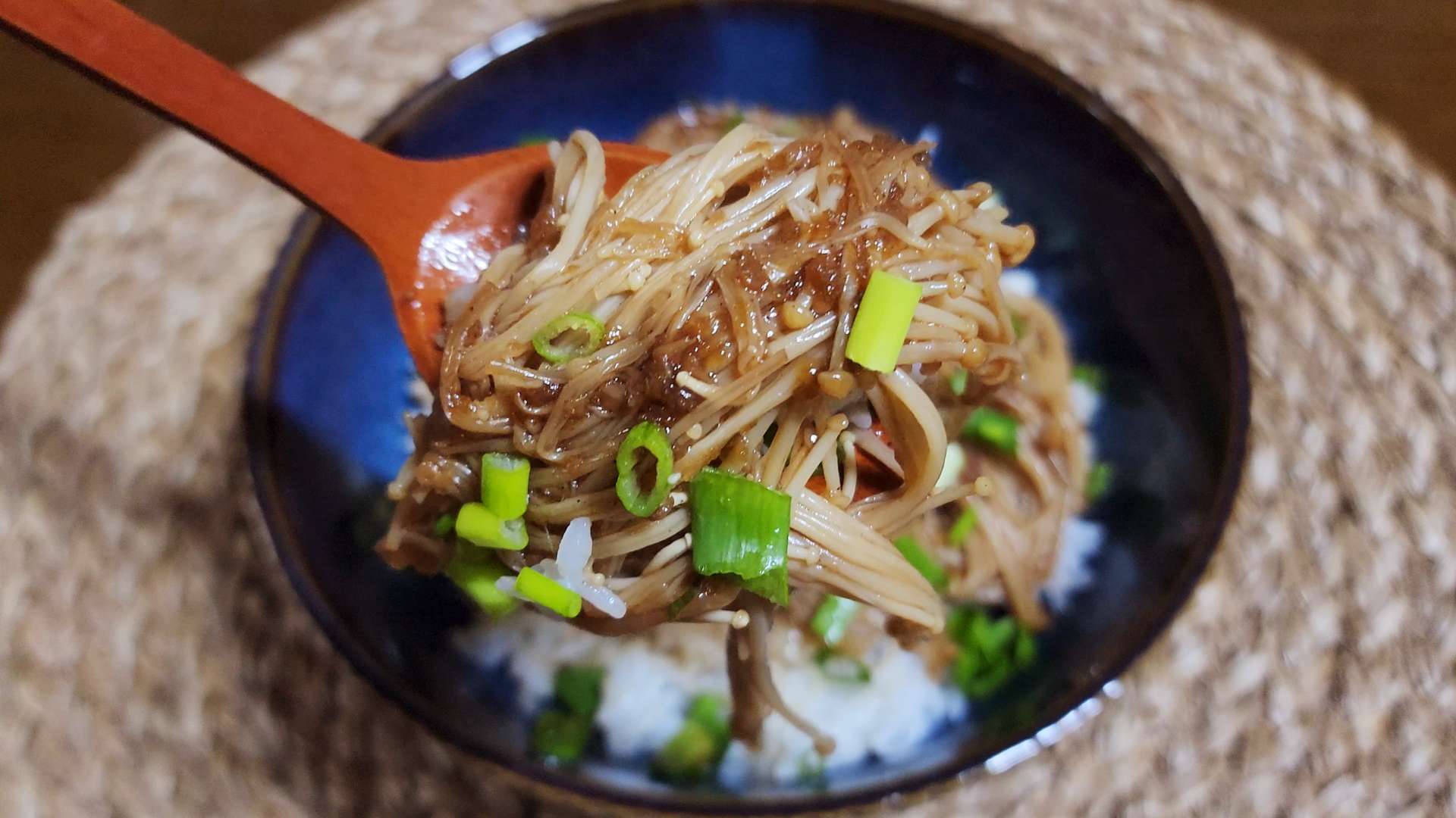 재료: 팽이버섯 1줌, 시판 불고기 소스 2T, 간장 1T, 참기름 1T, 밥 1공기, 달걀노른자 1개, 쪽파 1줄기
