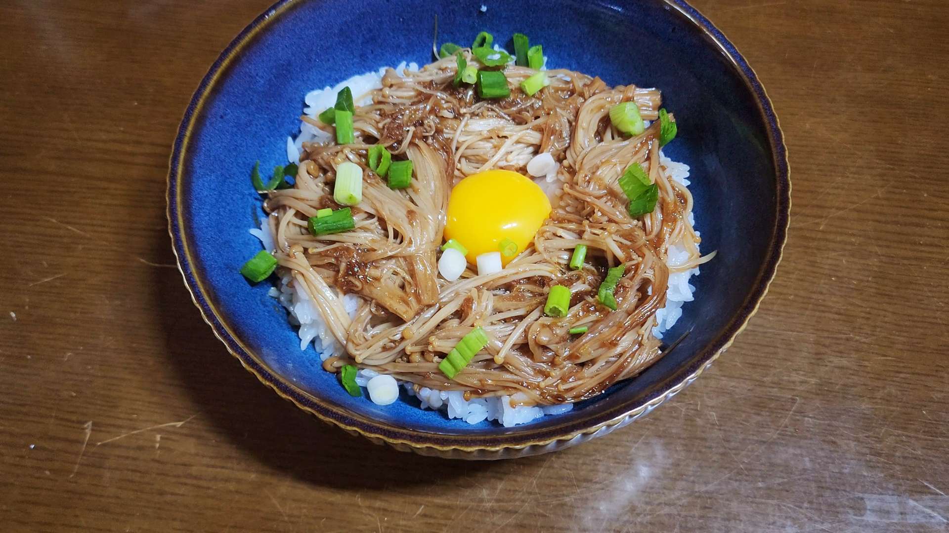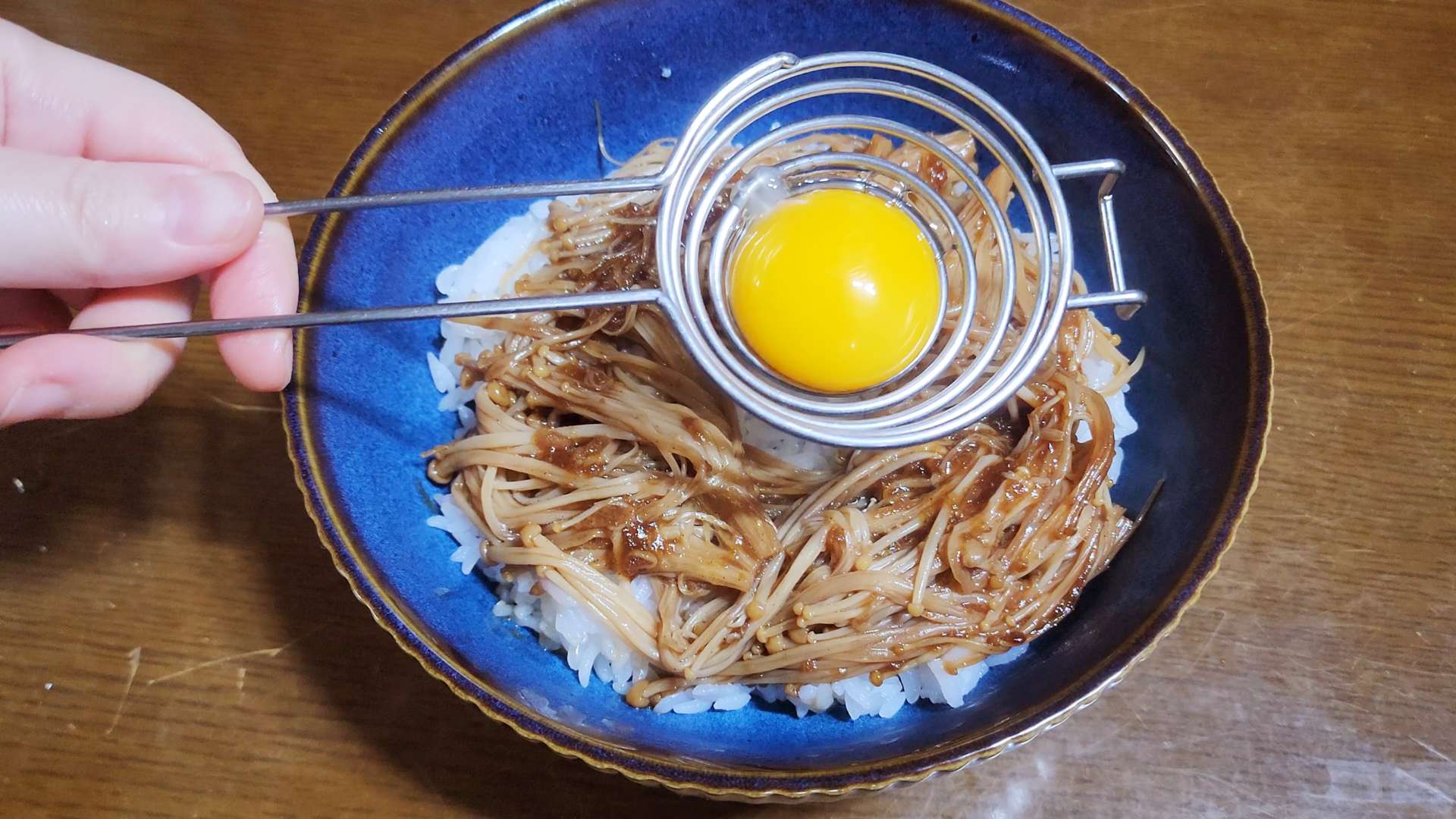 그릇에 밥을 담고 팽이버섯을 올린 뒤, 달걀노른자를 올리고 쪽파를 뿌려줍니다.
