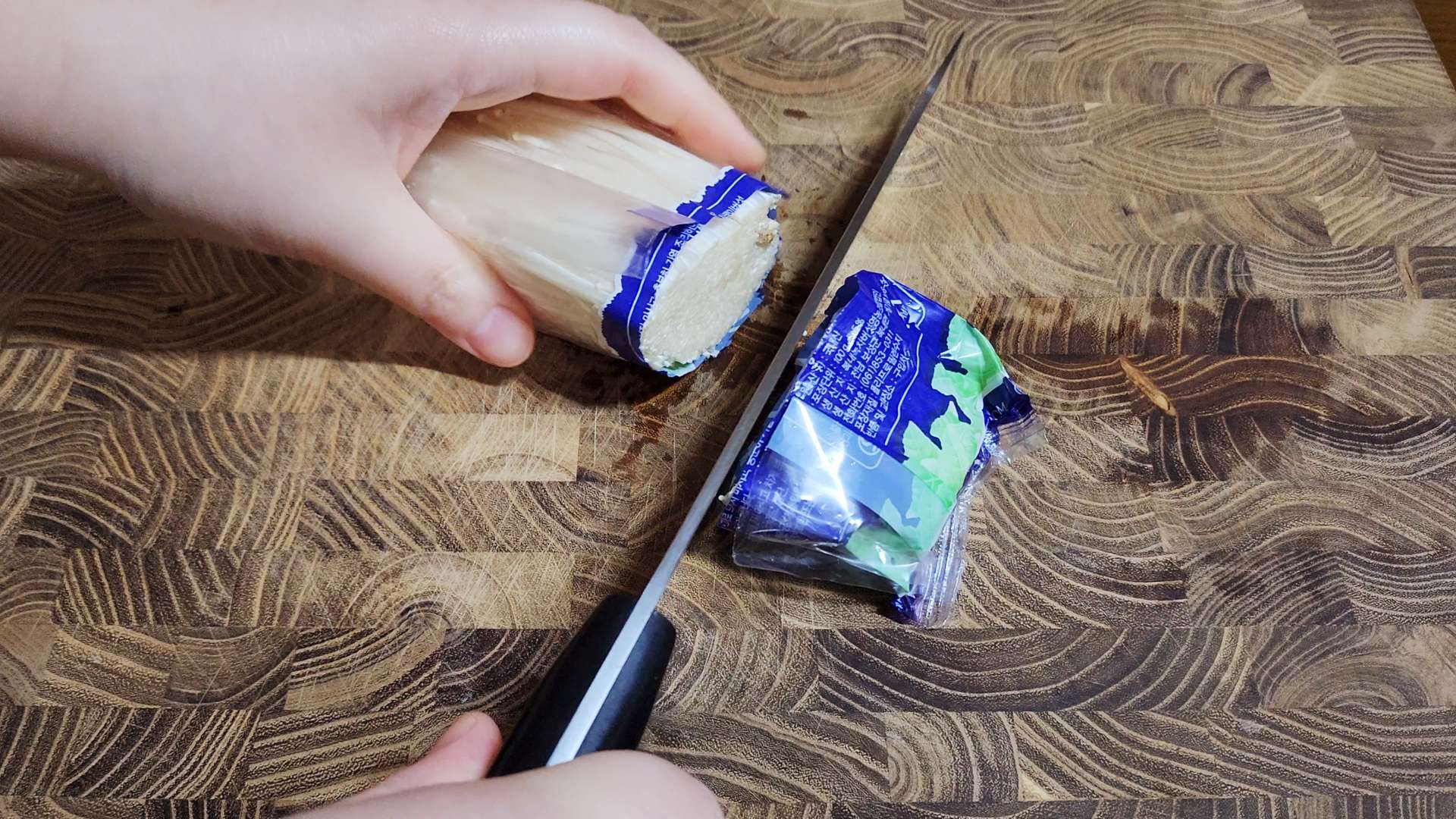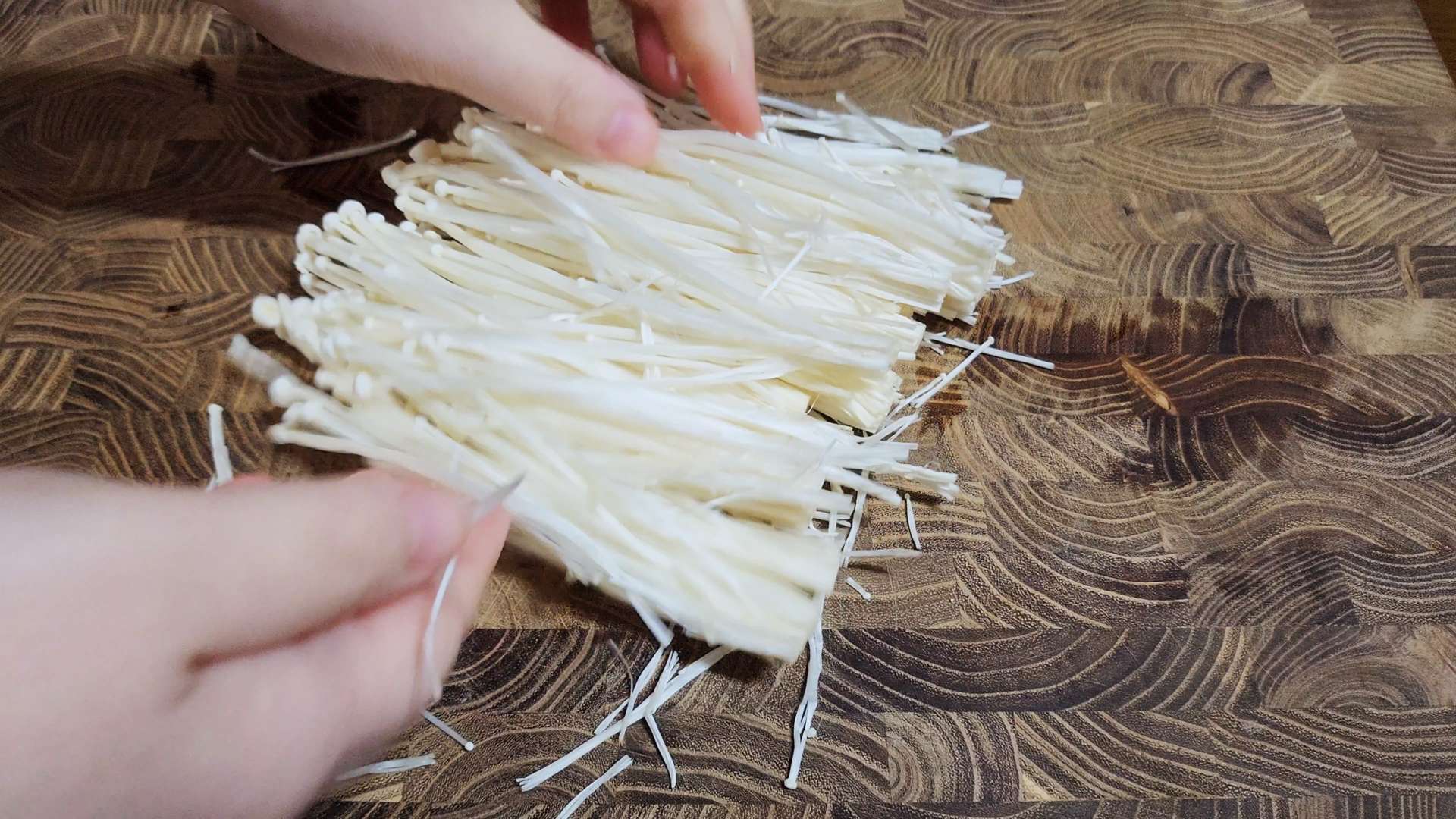 팽이버섯은 밑동을 자르고 먹기 좋게 찢어줍니다.