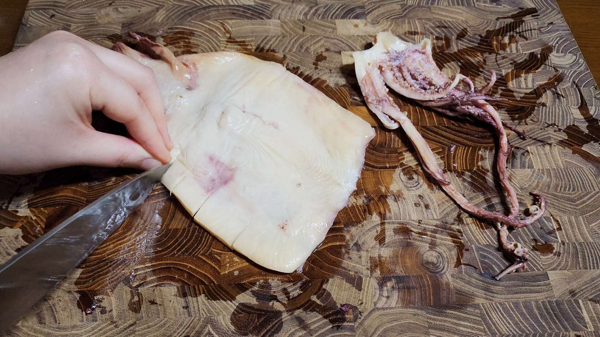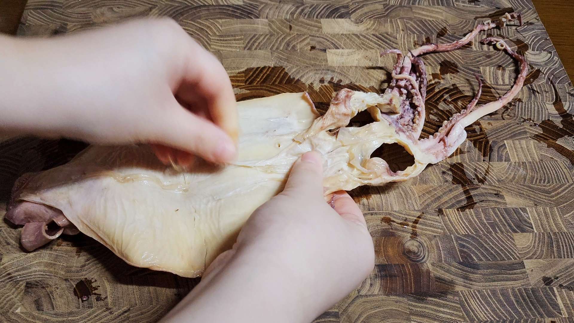 불린 오징어의 가운데 뼈 부분과 다리 쪽 입 부분을 제거해줍니다.