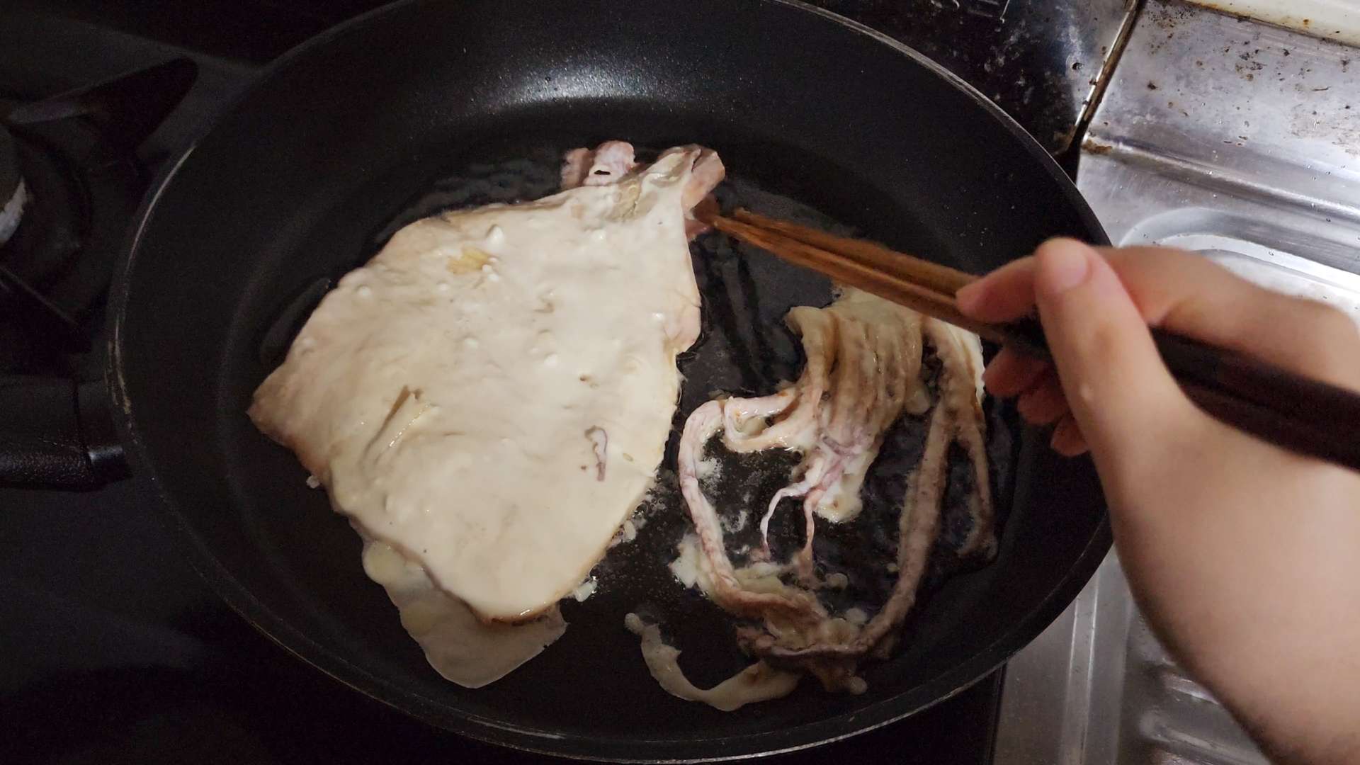 중불로 달군팬에 식용유를 넉넉히 넣고 오징어는 튀기듯이 구워줍니다.