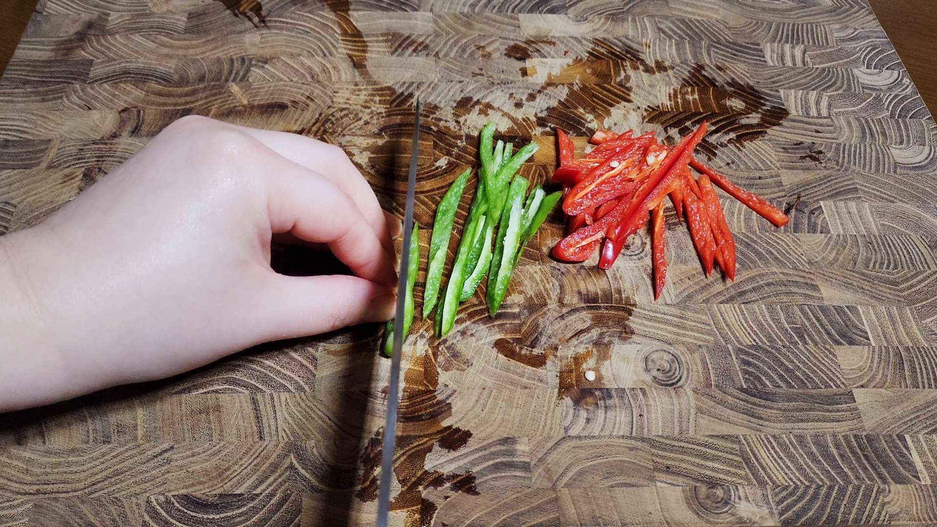 청양고추, 홍고추는 반으로 잘라 씨를 제거하고 채 썰어줍니다.