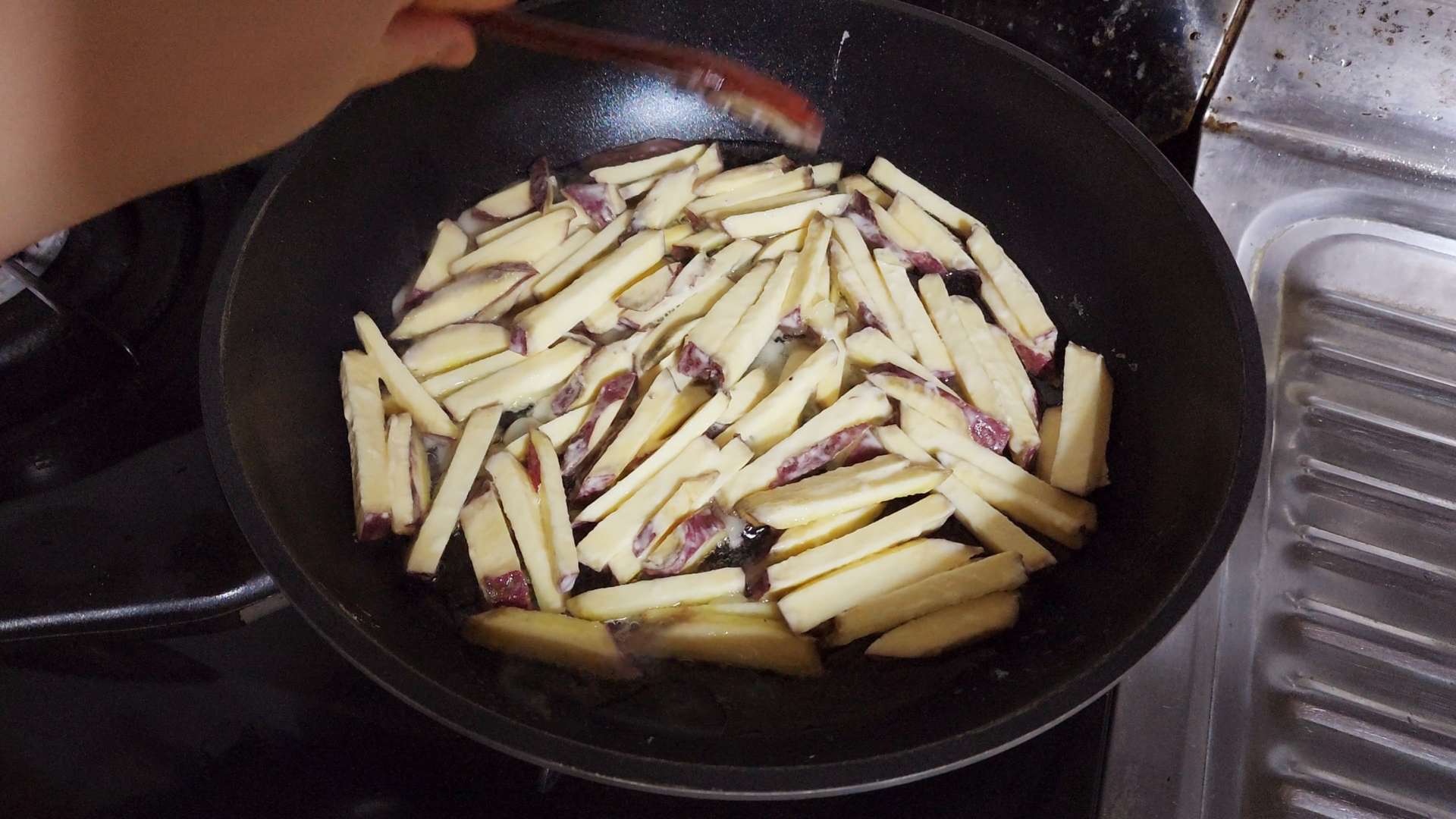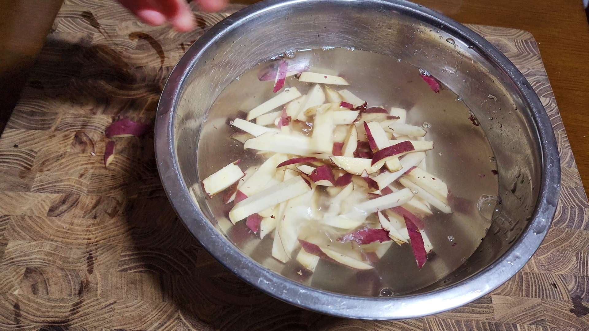 고구마는 깨끗이 씻어 굵게 채 썰어줍니다.