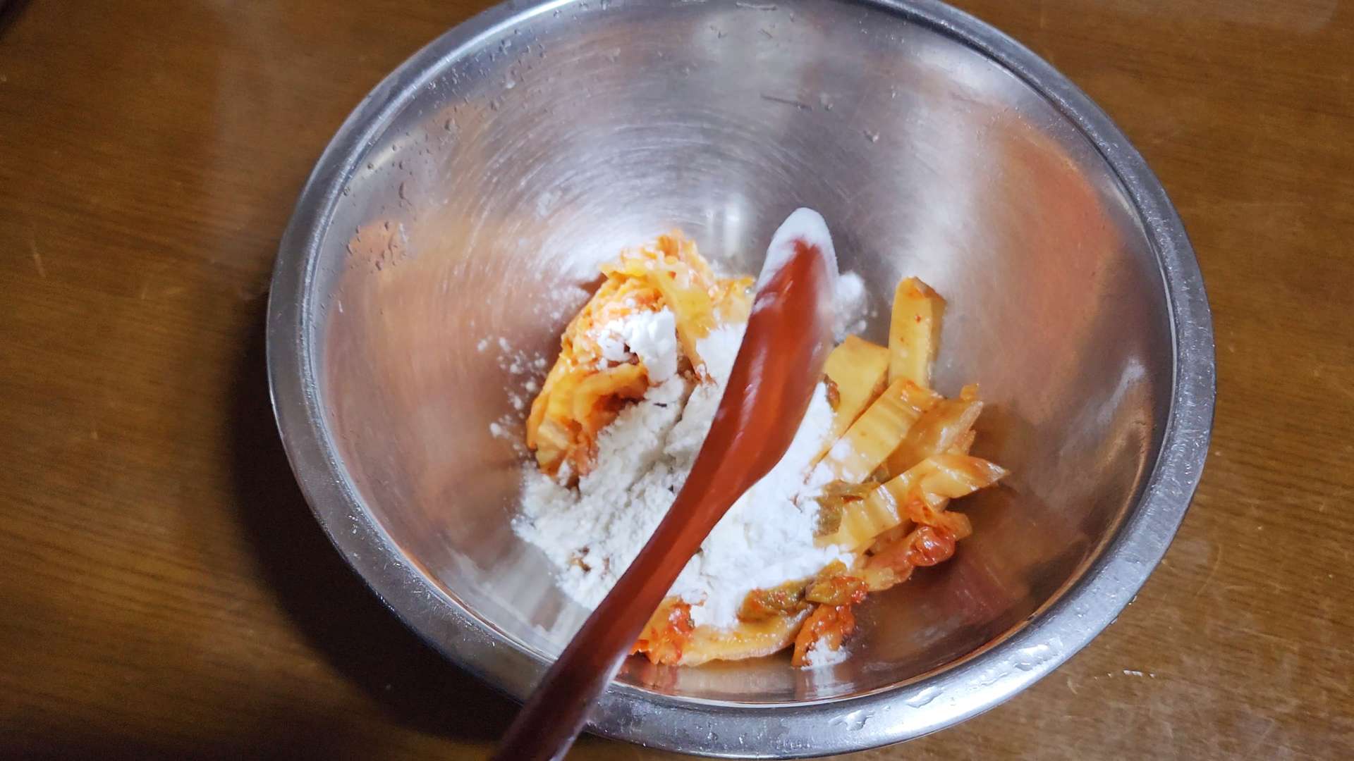 묵은지, 전분 1T, 부침가루 1T, 물 1T를 넣고 섞어줍니다.