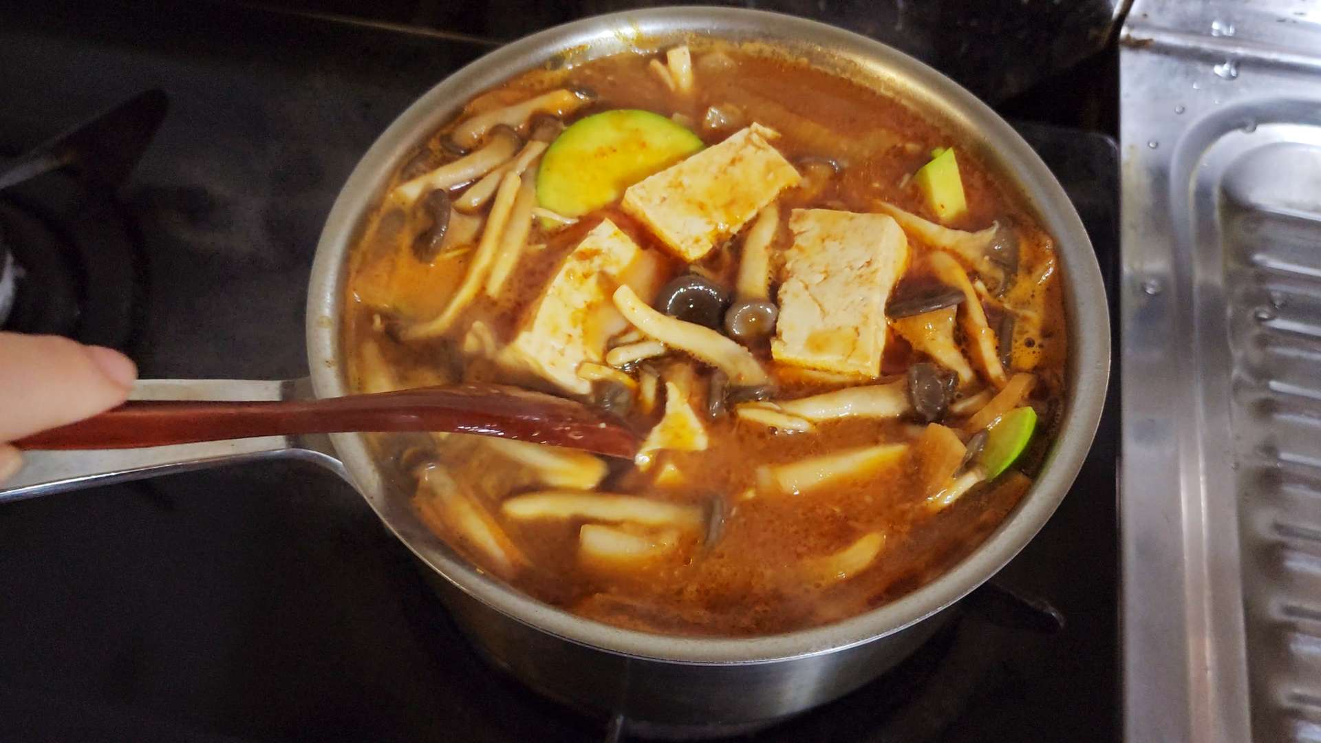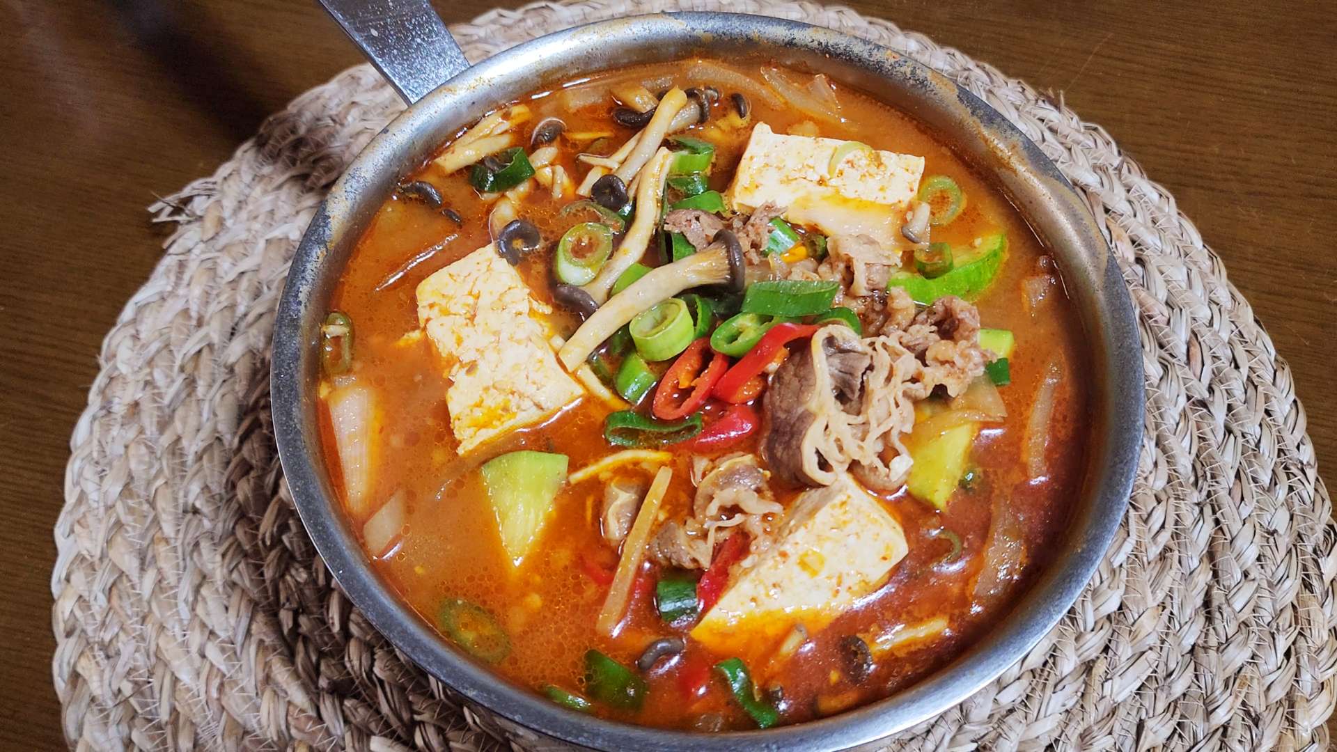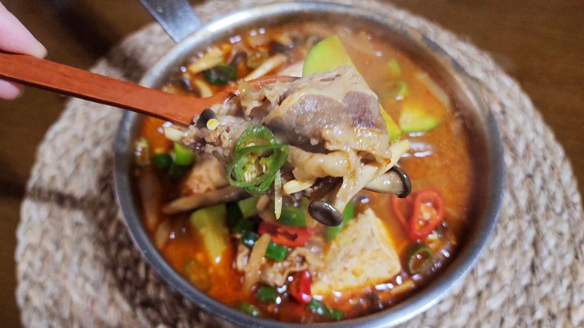 재료: 우삼겹 120g, 무 100g, 양파 1/2개, 감자 2개, 애호박 1/2개, 느타리버섯, 두부 1/2모, 대파 1/2대, 청양고추 1개, 홍고추 1개, 물 800ml