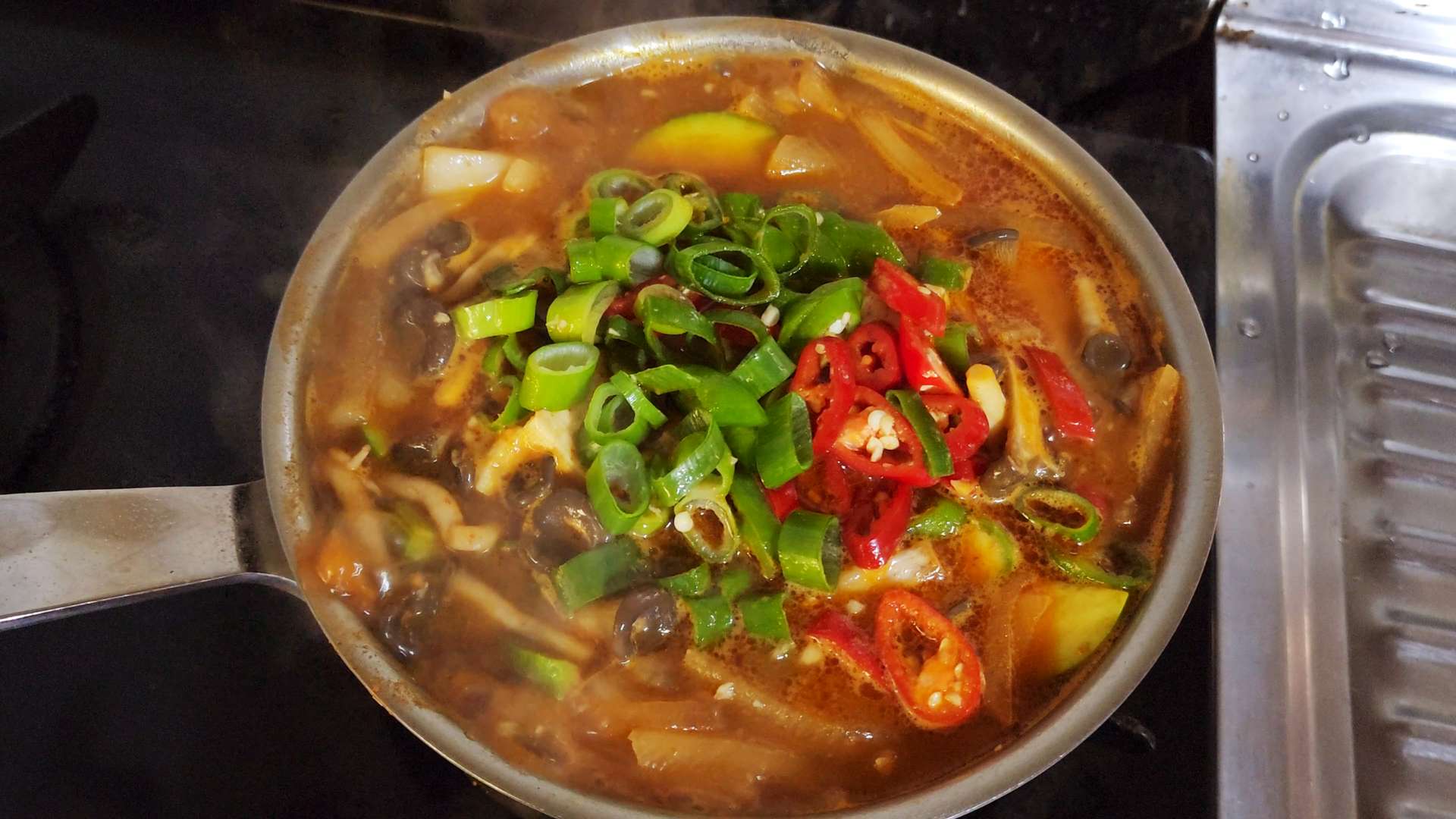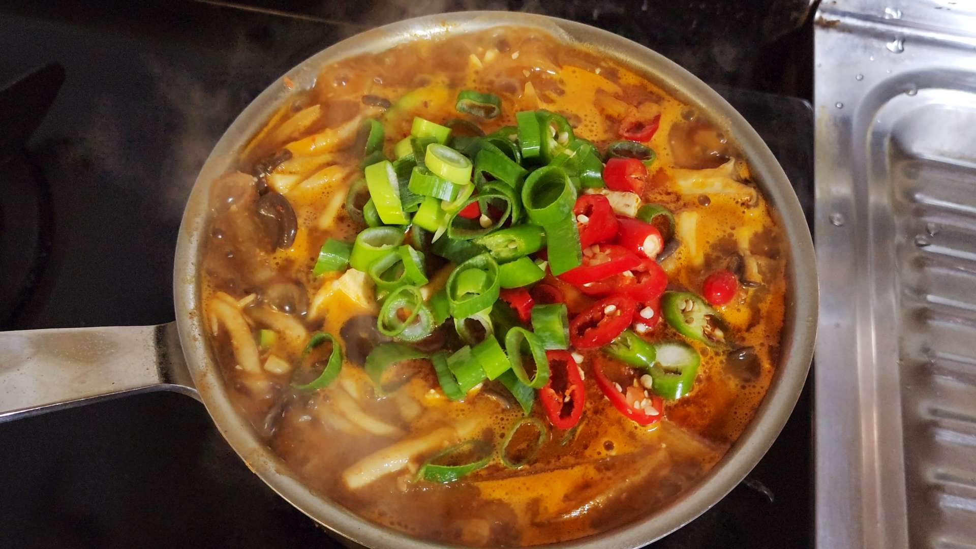 대파, 청양고추, 홍고추를 넣고 한소끔 끓여줍니다.