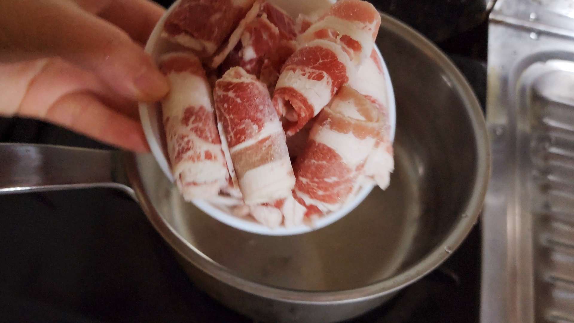 중불로 달군 냄비에 우삼겹을 넣고 볶아줍니다.