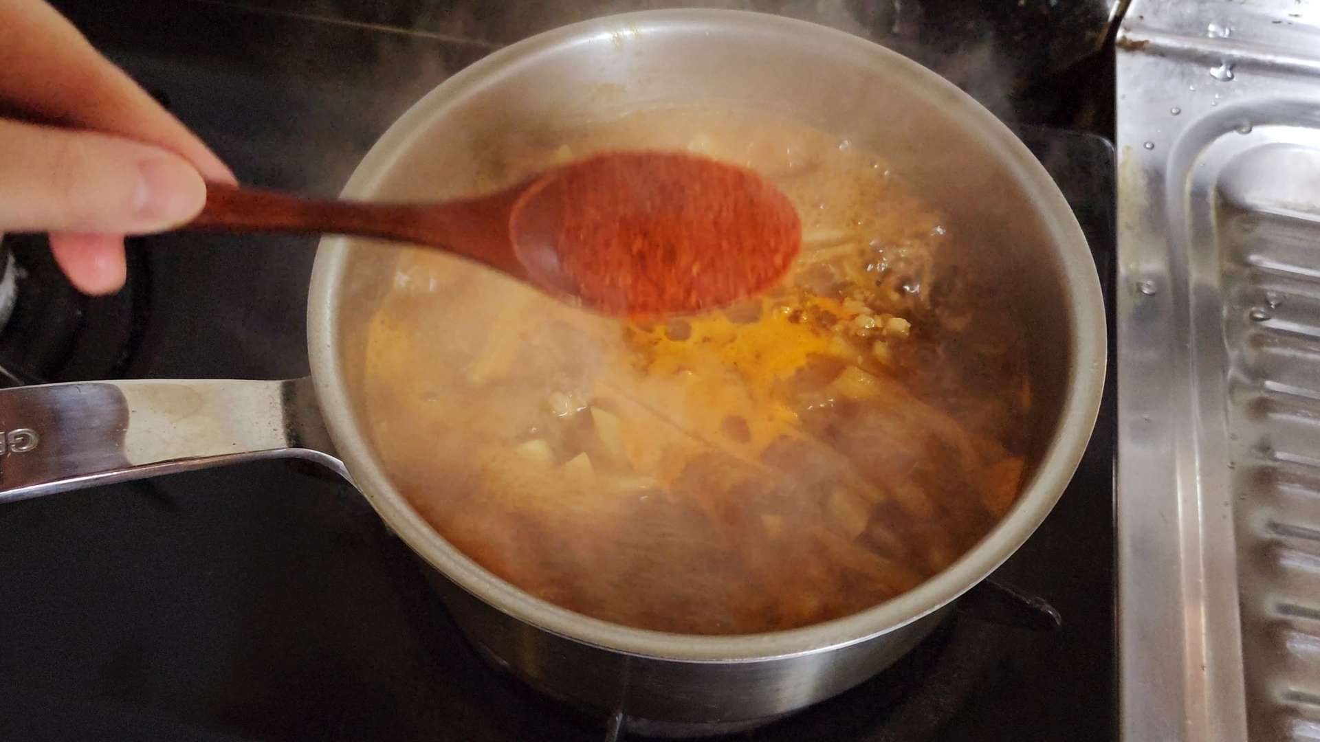 고추장 0.5T, 고춧가루 1T를 넣고 끓여줍니다.