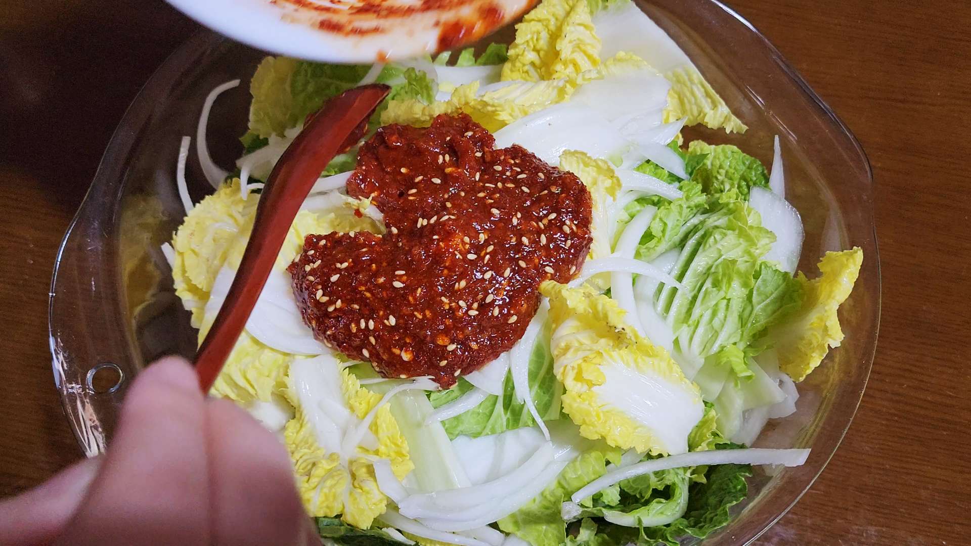봄동, 양파를 넣고 섞어줍니다.