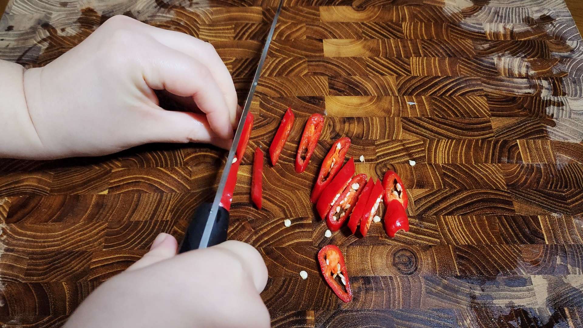 홍고추는 어슷 썰어줍니다.