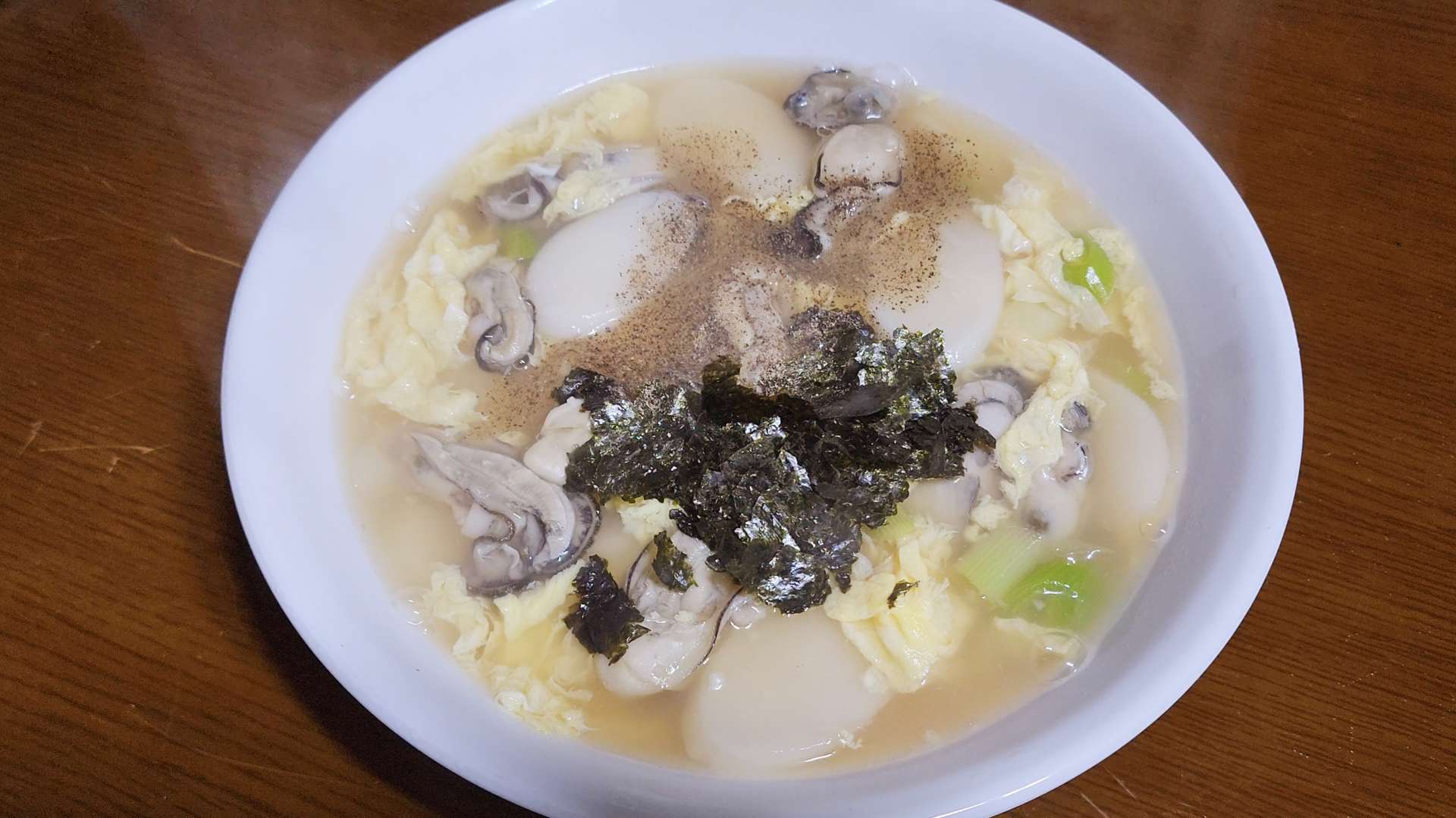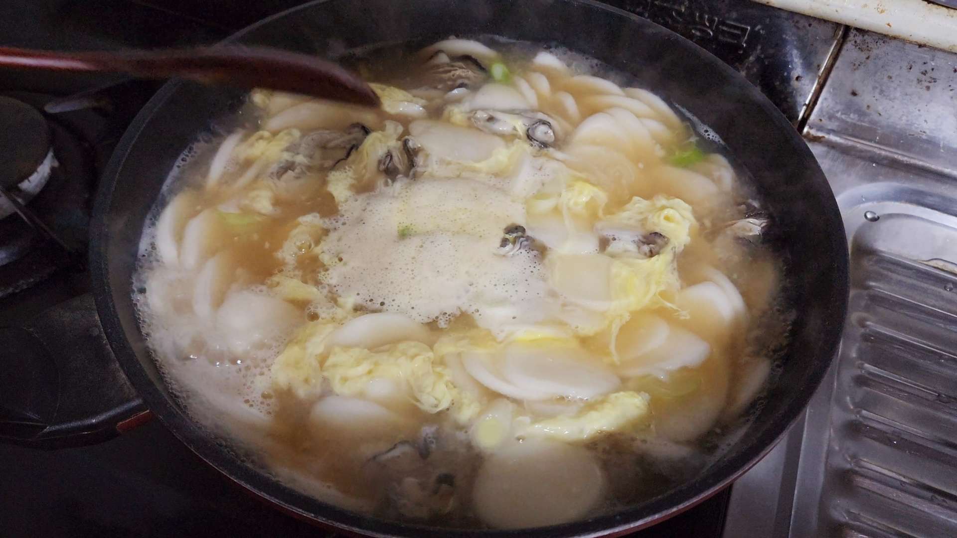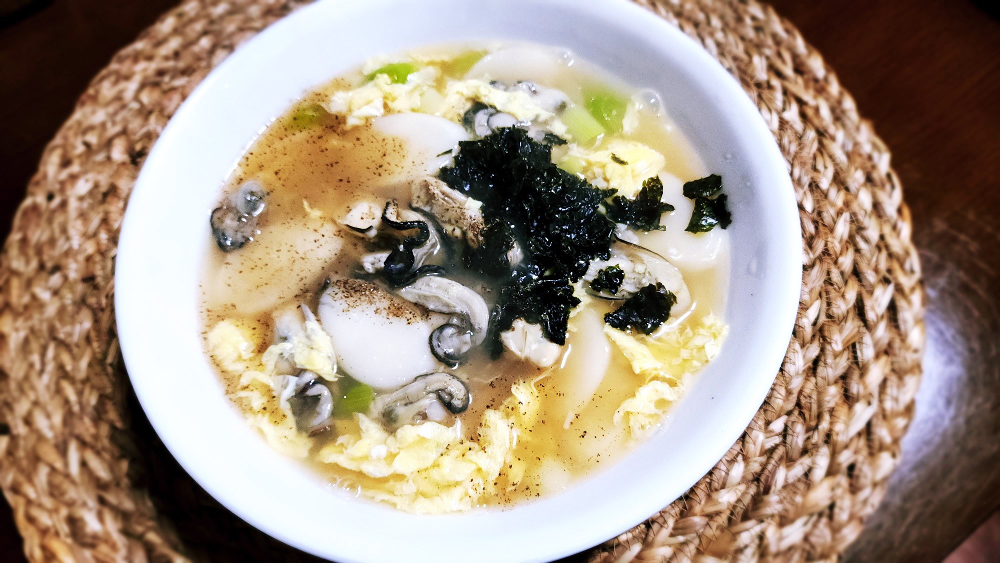 재료: 떡국떡 350g, 굴 120g, 대파 1/2대, 달걀 2개, 다진마늘 1T, 멸치액젓 1T,