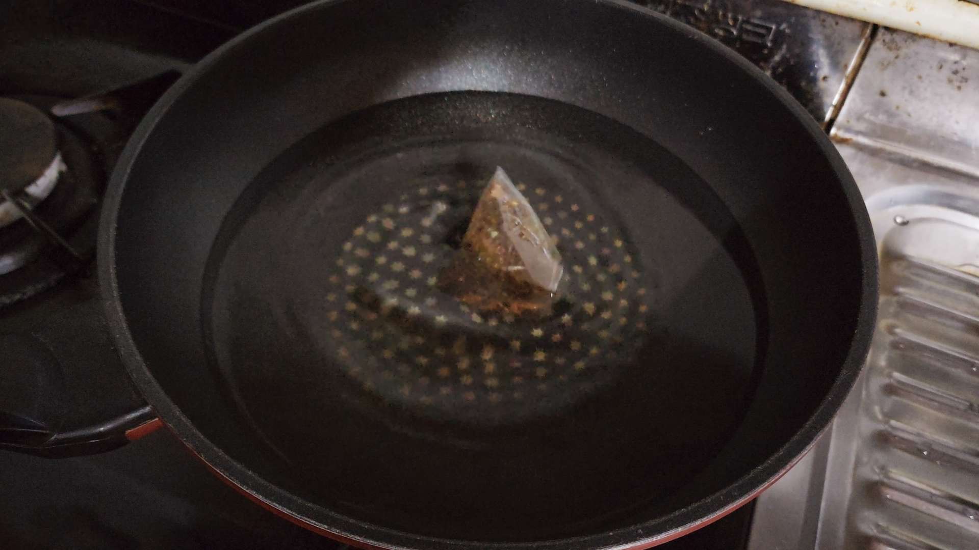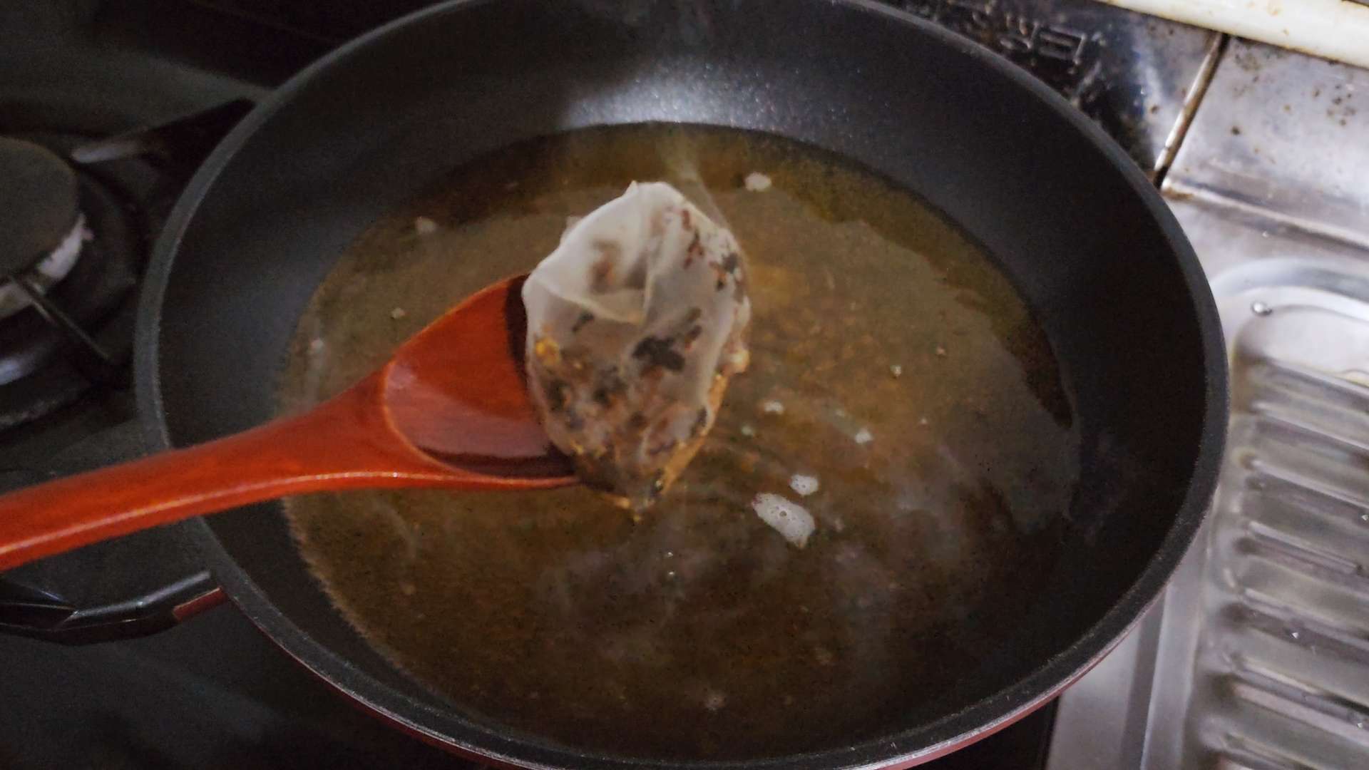 냄비에 물 1L, 멸치다시마팩 1개를 넣고 10분 정도 중불에서 끓여줍니다.