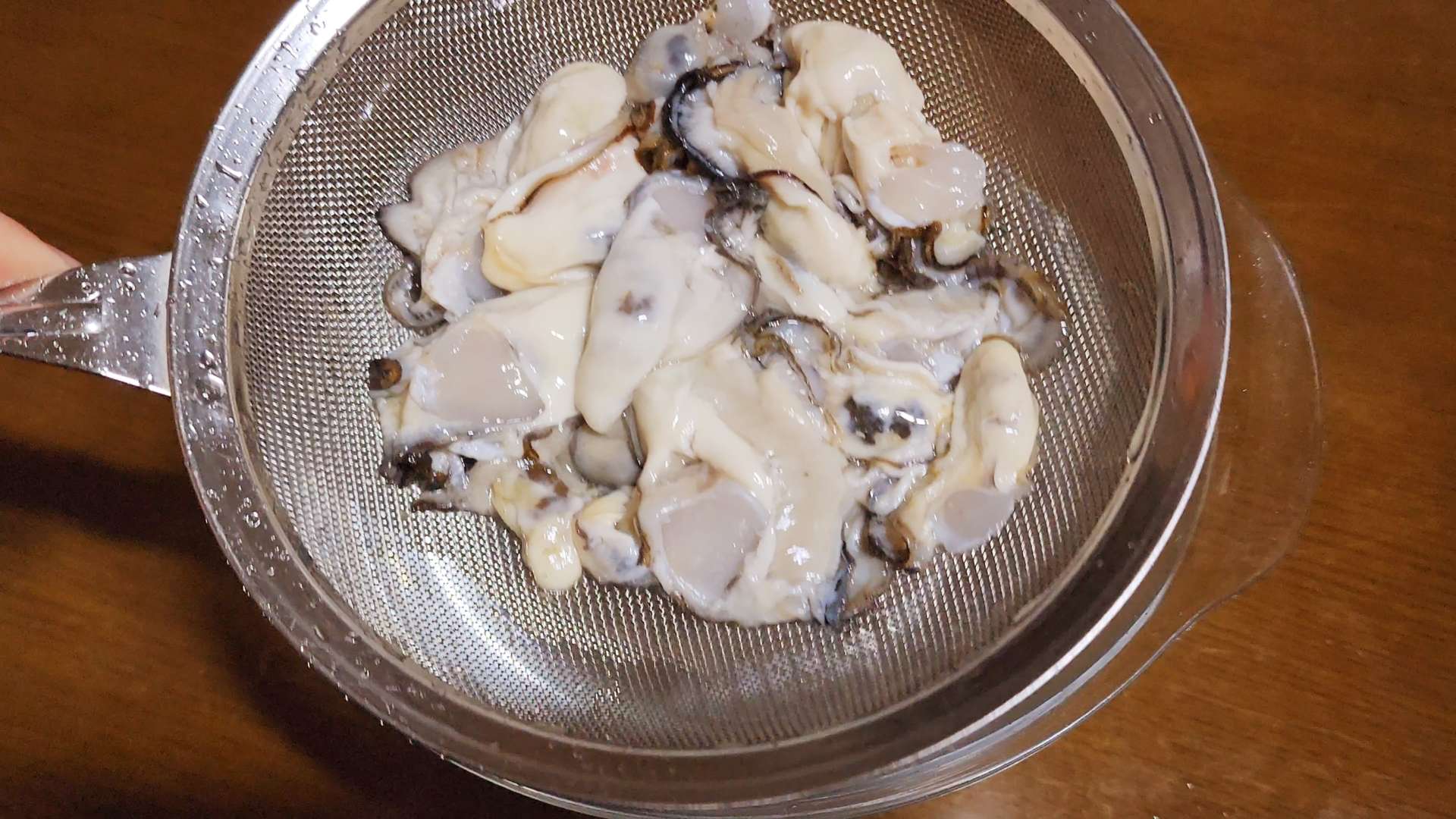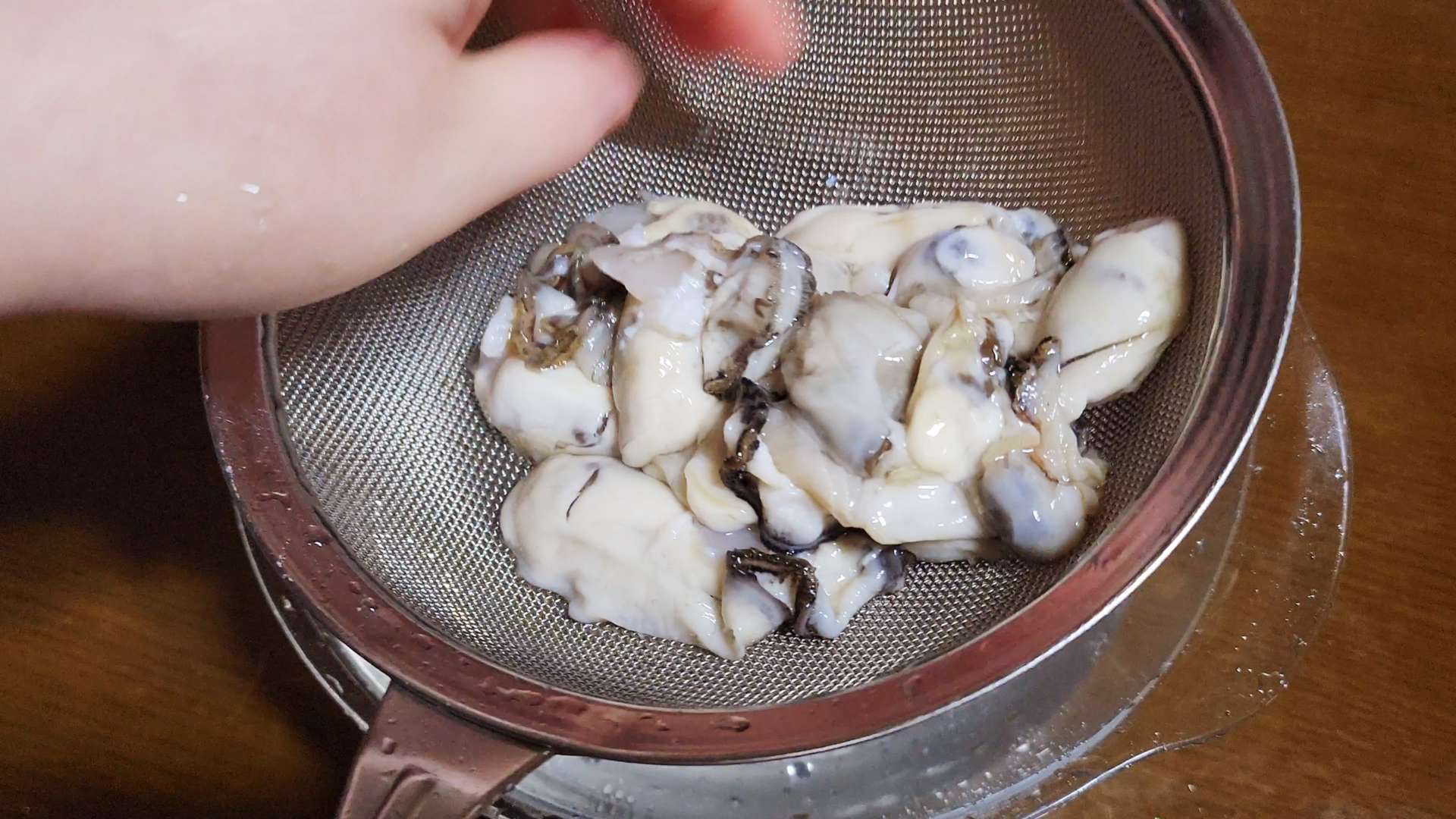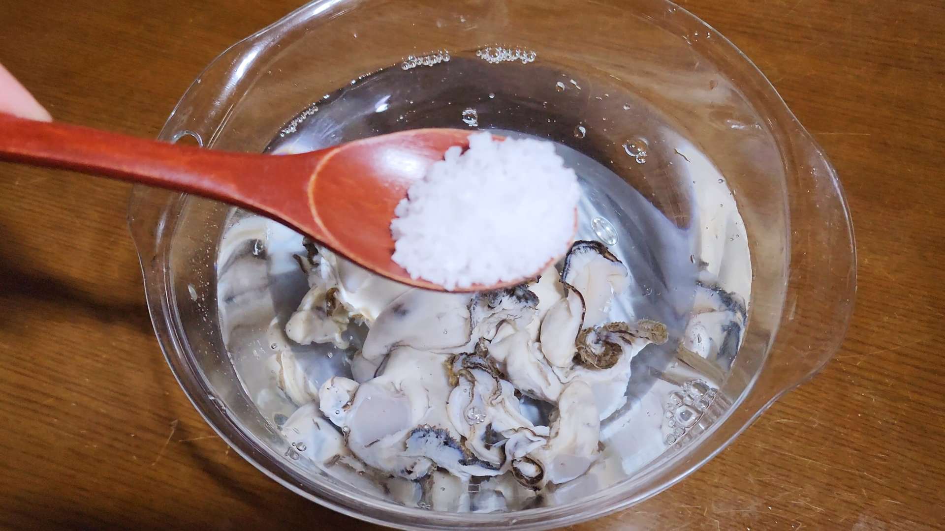 굴 120g, 굵은소금 1T을 물에 넣고 살살 흔들어서 씻어줍니다.