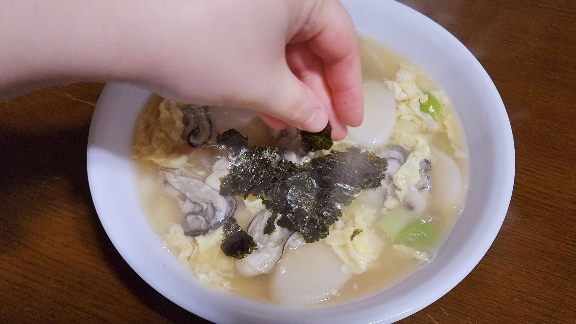 그릇에 굴떡국을 담고 김가루, 후춧가루를 뿌려줍니다.