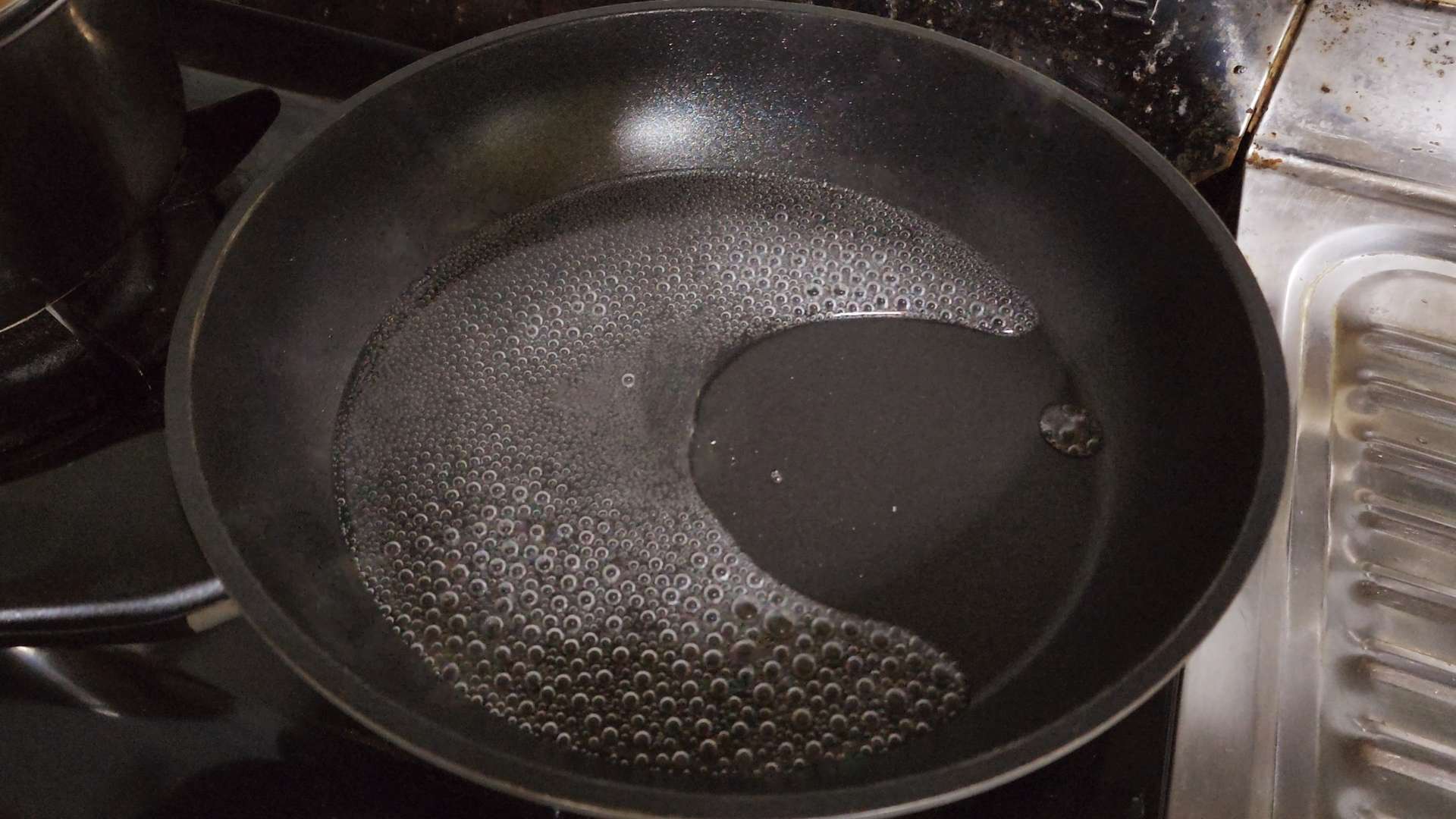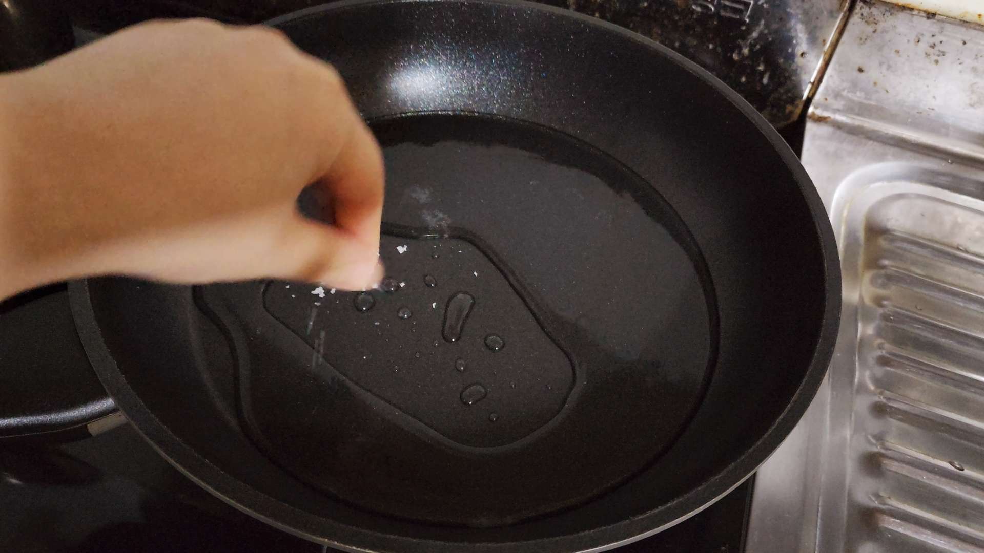 프라이팬에 물 100ml을 붓고 식초 1/2T, 소금 2꼬집을 넣고 강불로 끓여줍니다.
