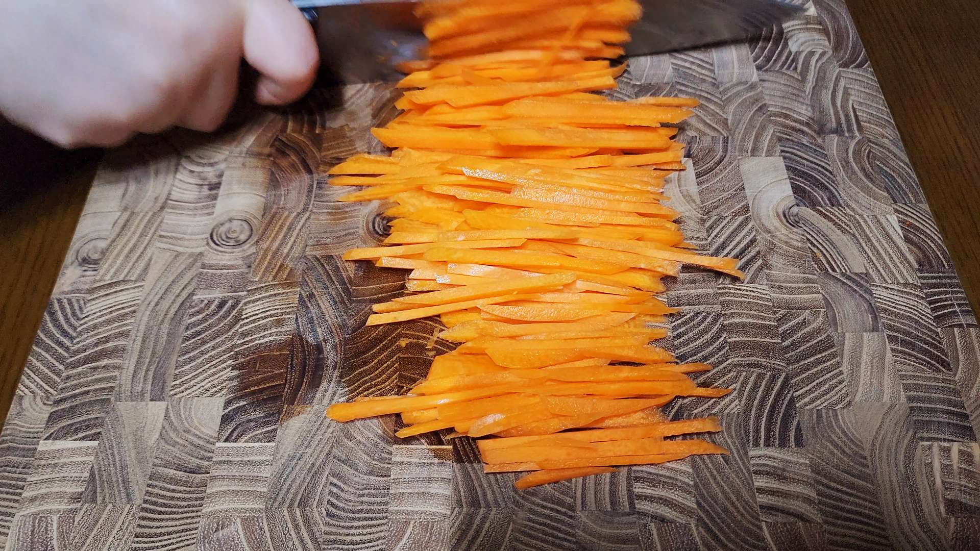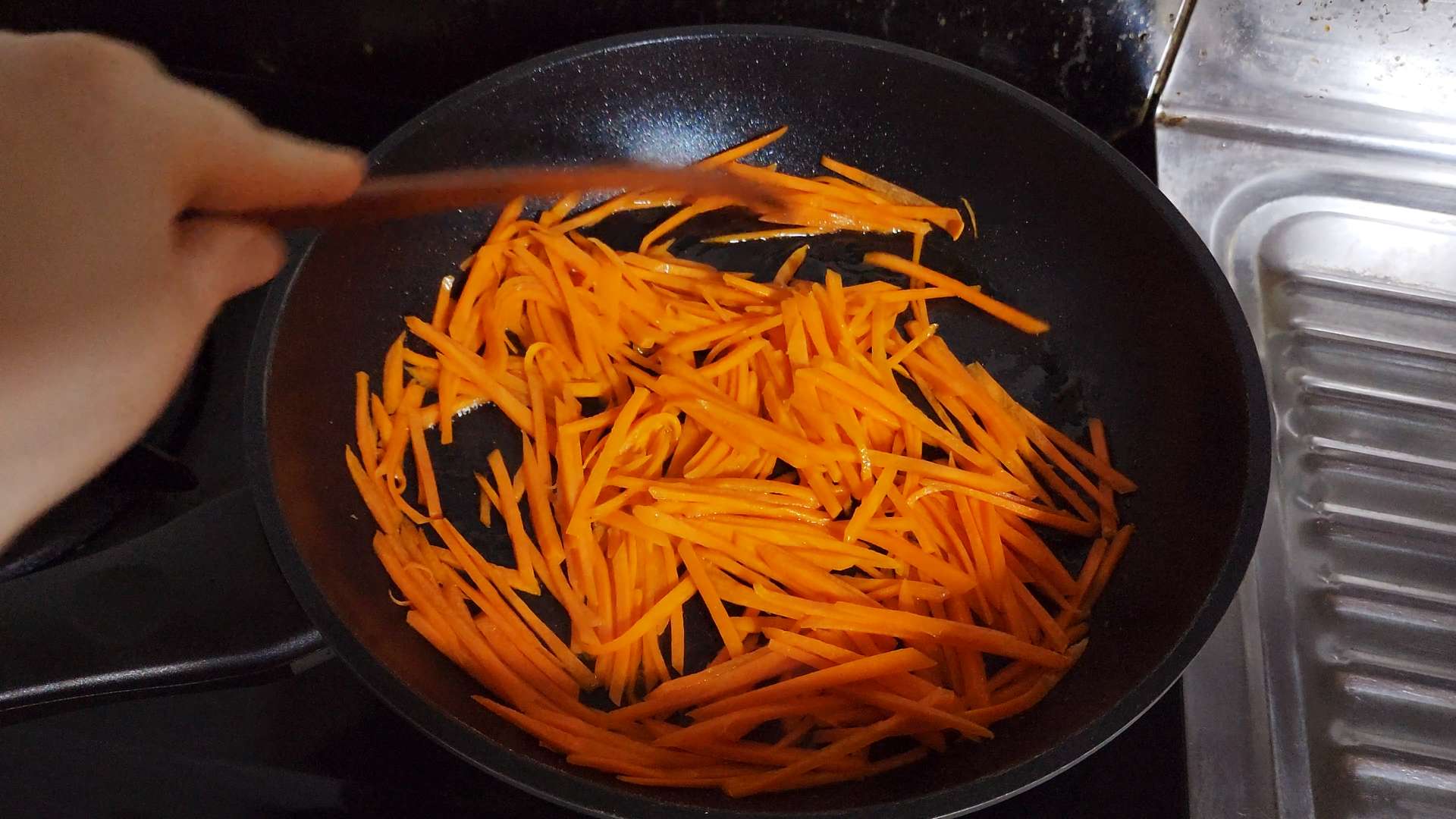 달군 팬에 식용유, 당근, 소금을 넣고 볶아줍니다.