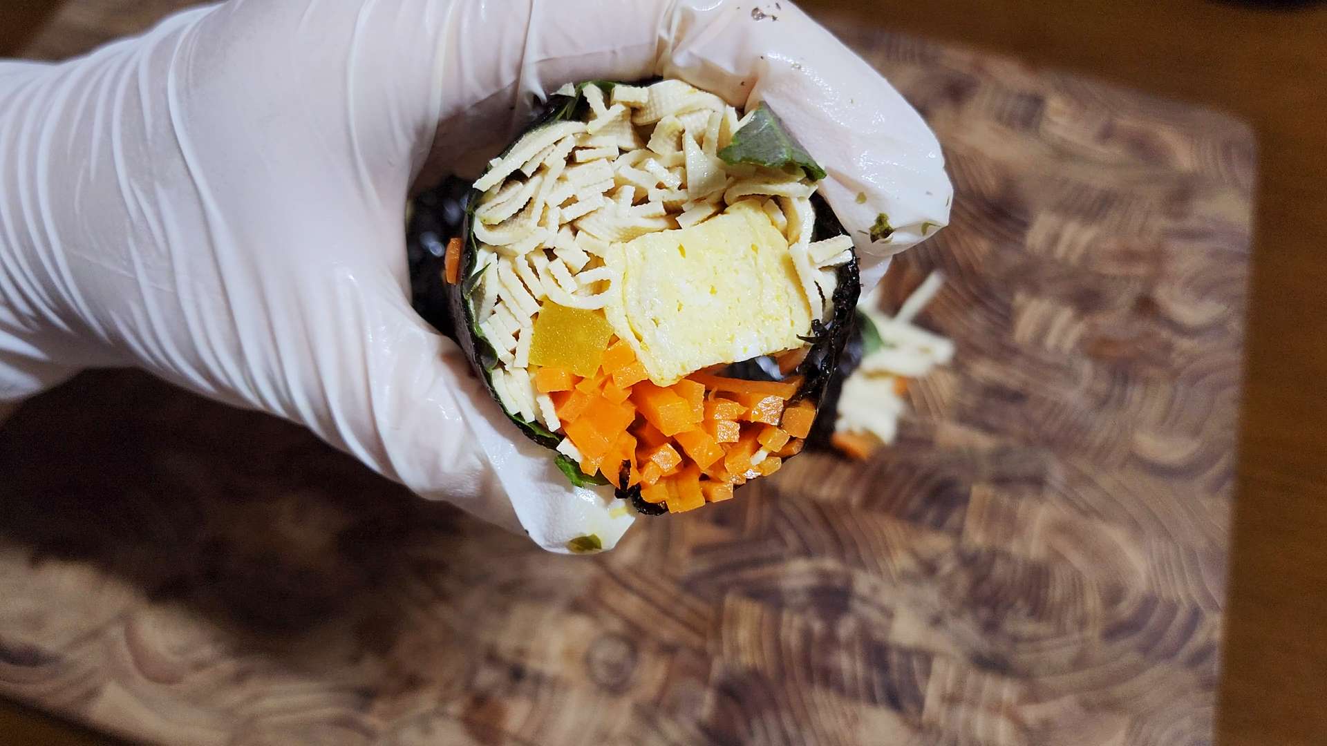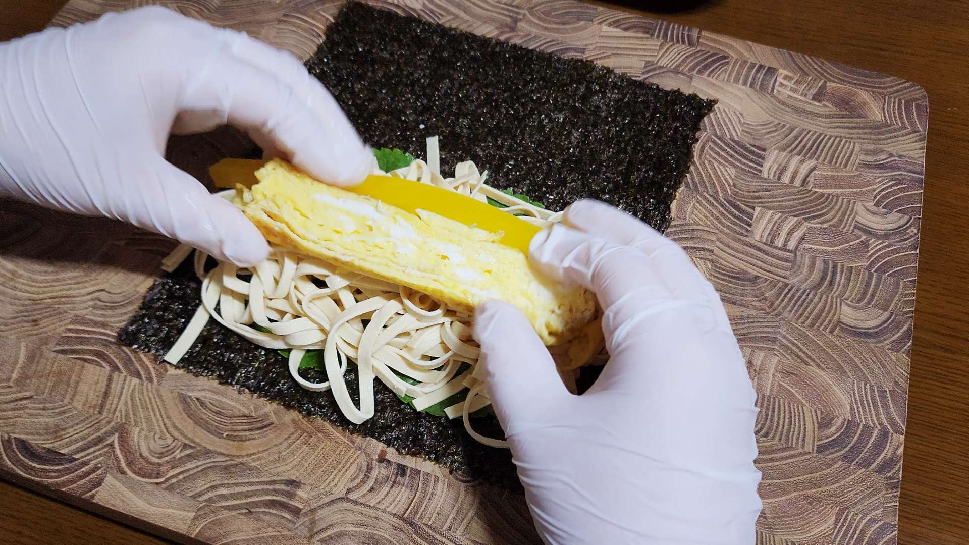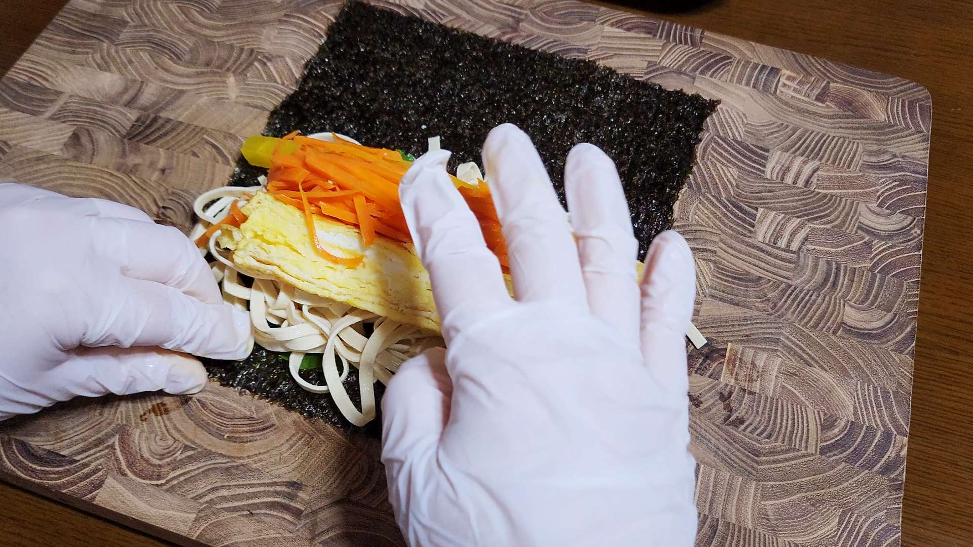 달걀말이-> 단무지-> 당근을 올리고 재료들을 손으로 꾸욱 눌러가며 말아줍니다.