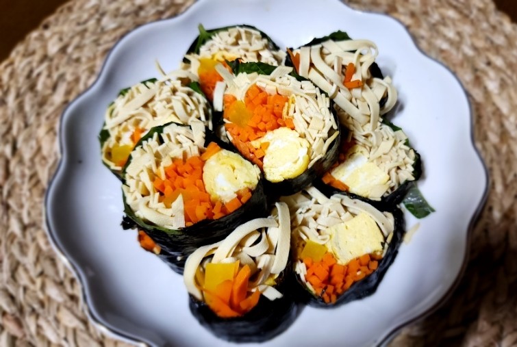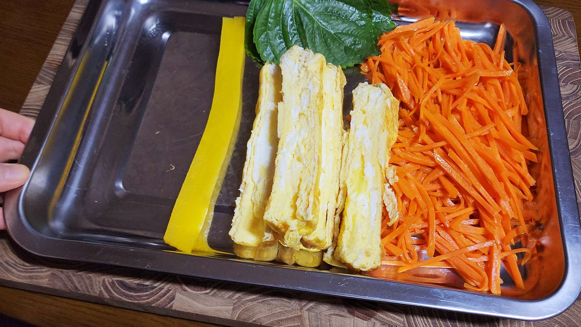 재료: 김밥용 김 2장, 얇은 두부면 2팩, 달걀 5개, 깻잎 4장, 당근 1개, 김밥용 단무지 2줄, 들기름 0.5T, 소금 약간, 식용유 약간