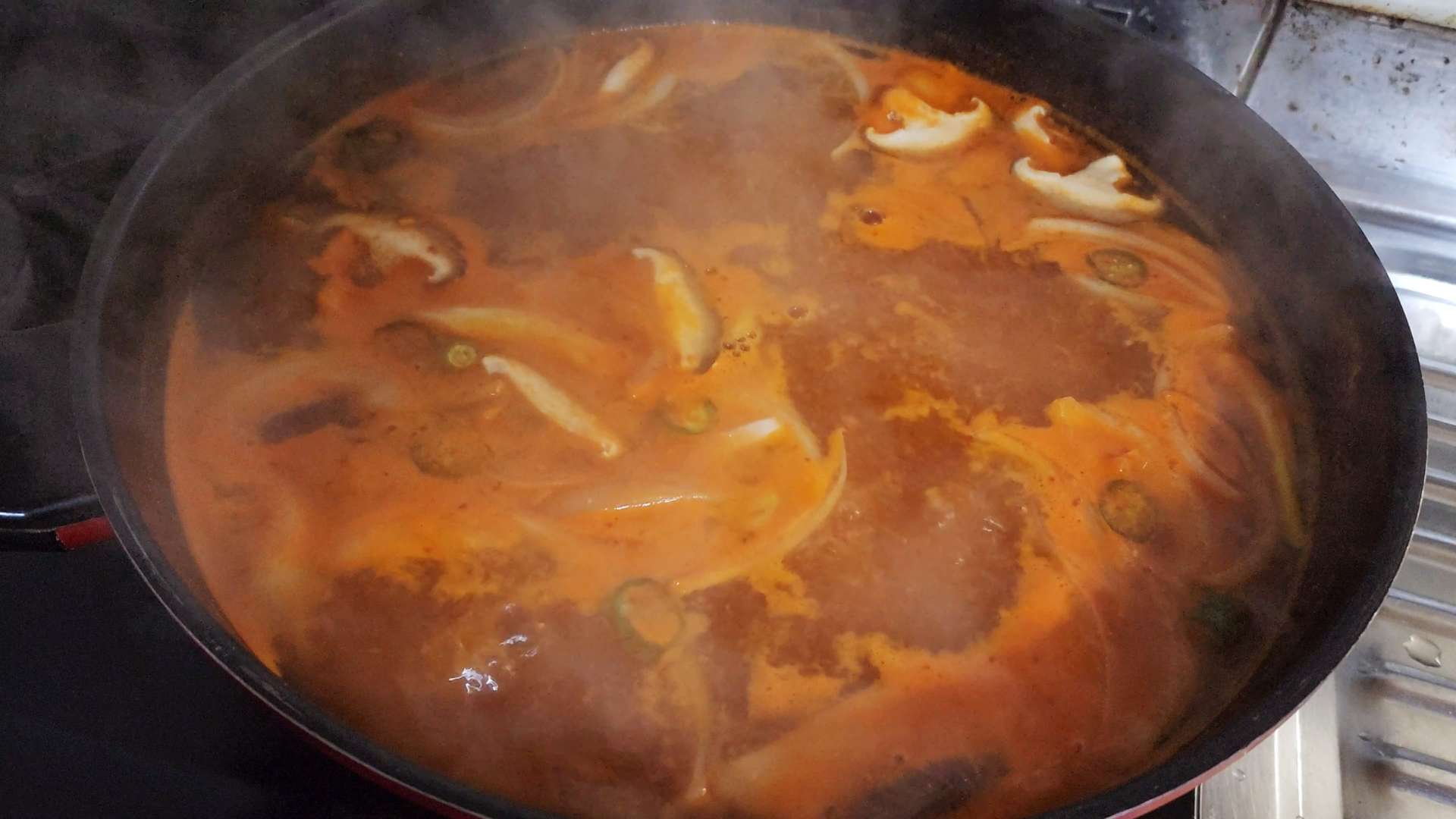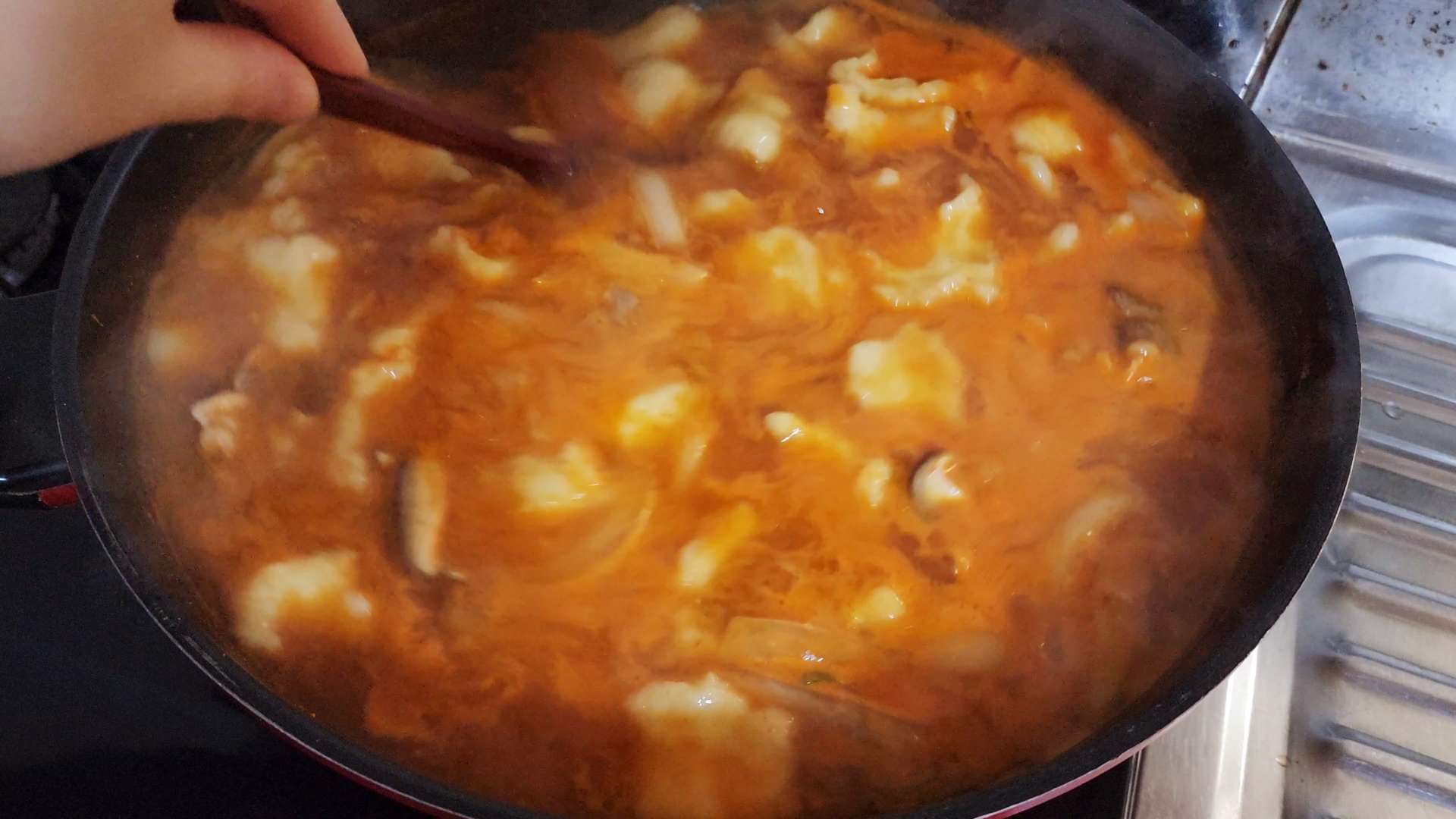 감자, 양념장, 양파, 표고버섯, 청양고추 넣고 한소끔 끓여줍니다.