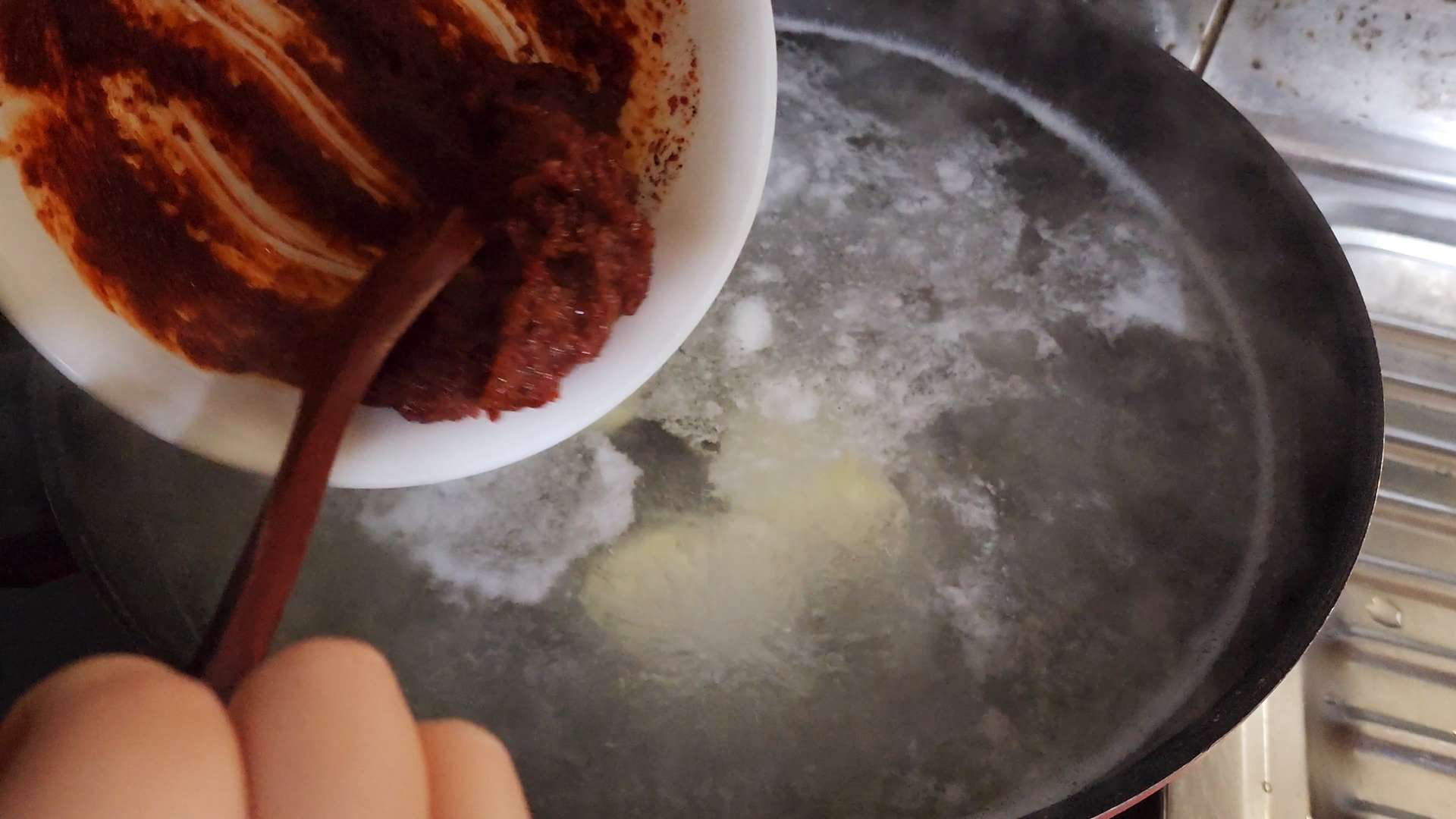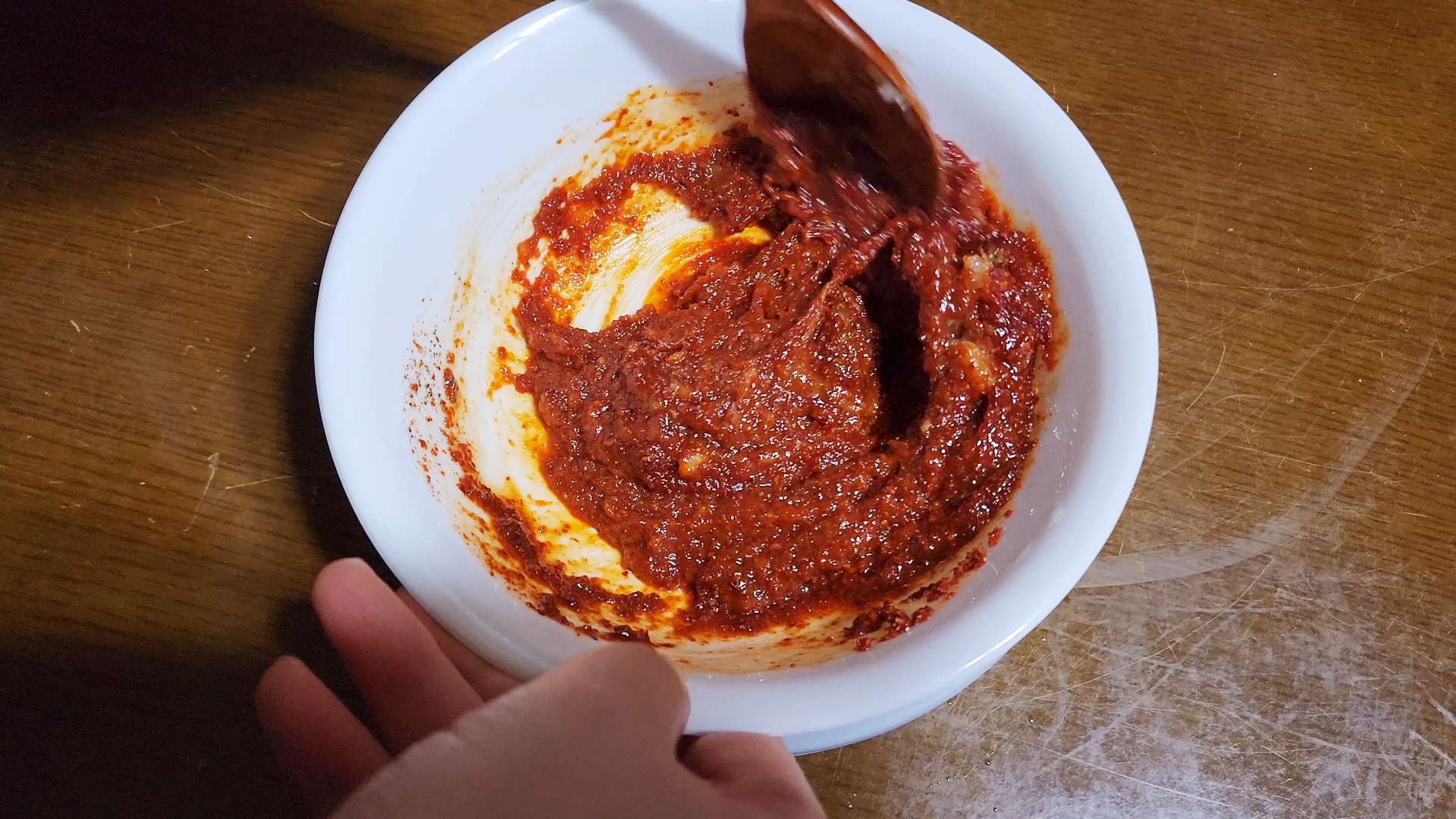 양념장: 고추장 1T, 된장 1/4T, 고춧가루 3T, 국간장 1/2T, 멸치액젓 1T, 매실청 1/2T, 다진마늘 1T, 후춧가루
