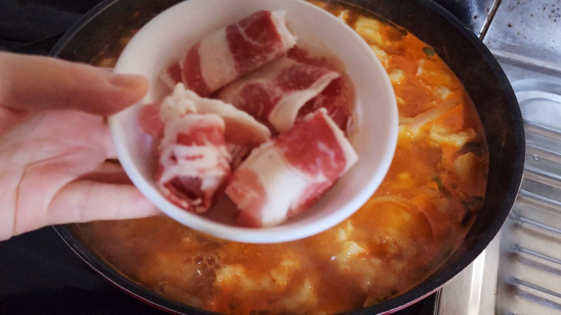 수제비가 떠오르면 우삼겹 100g을 넣어줍니다.