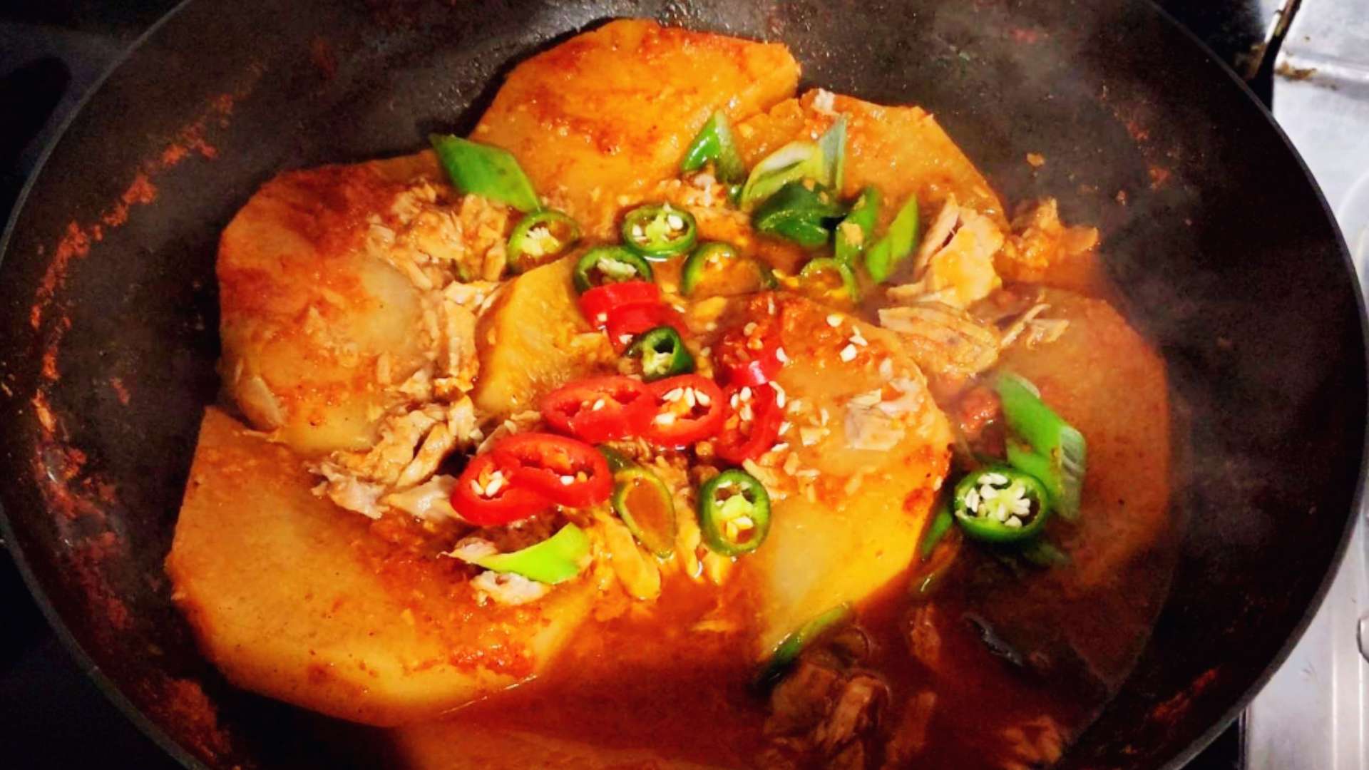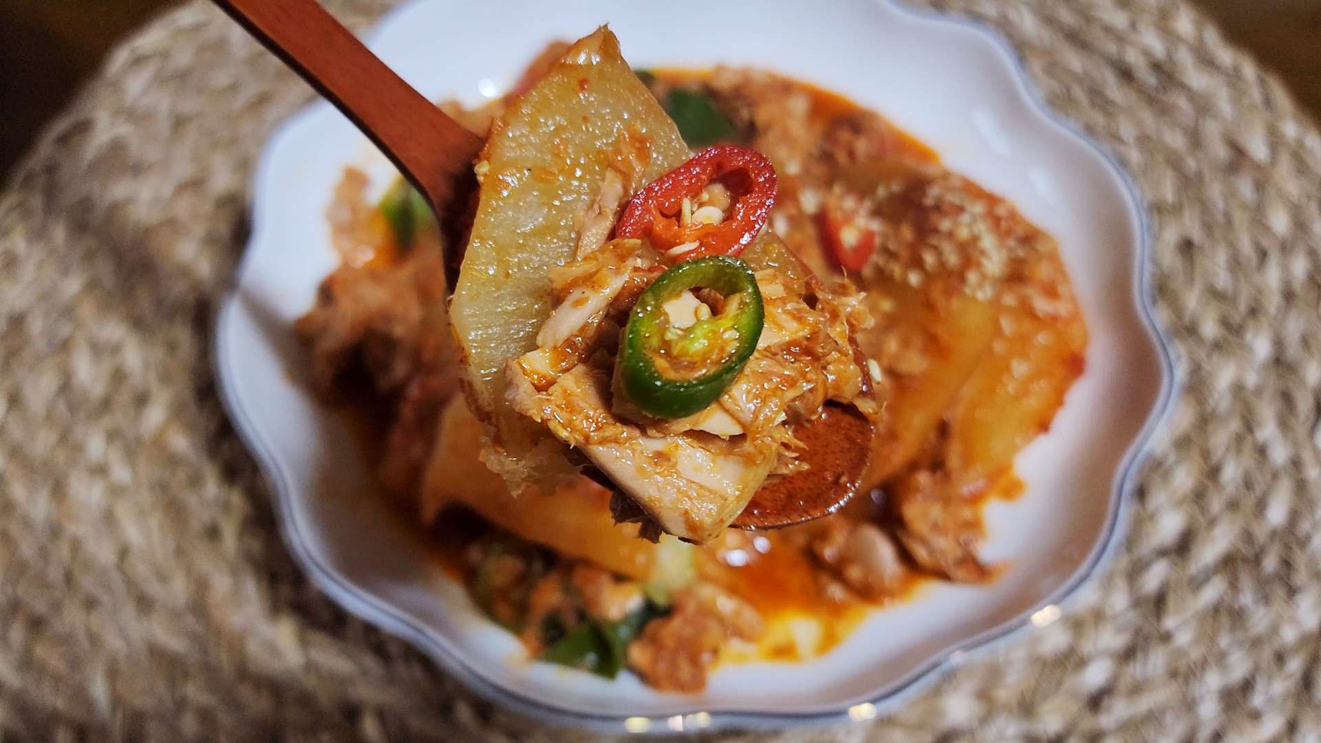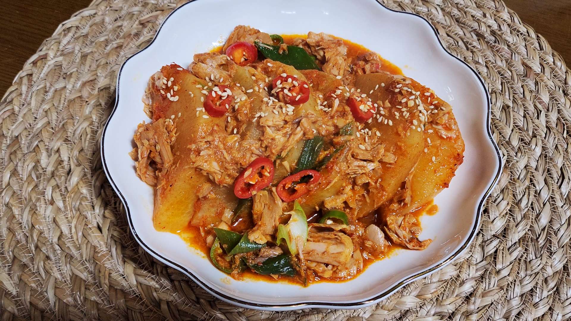달큰하고 부드러운 무와 참치, 매콤한 양념을 같이 먹으면 맛있답니다.