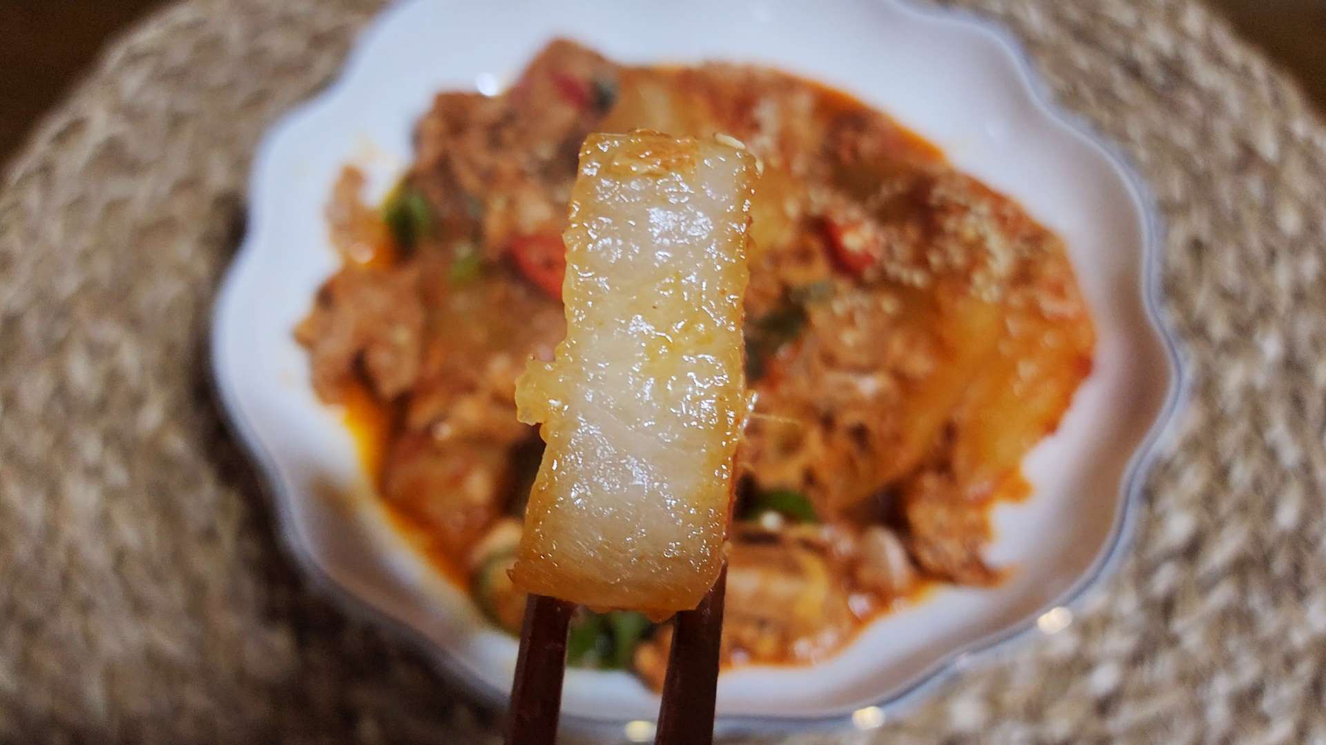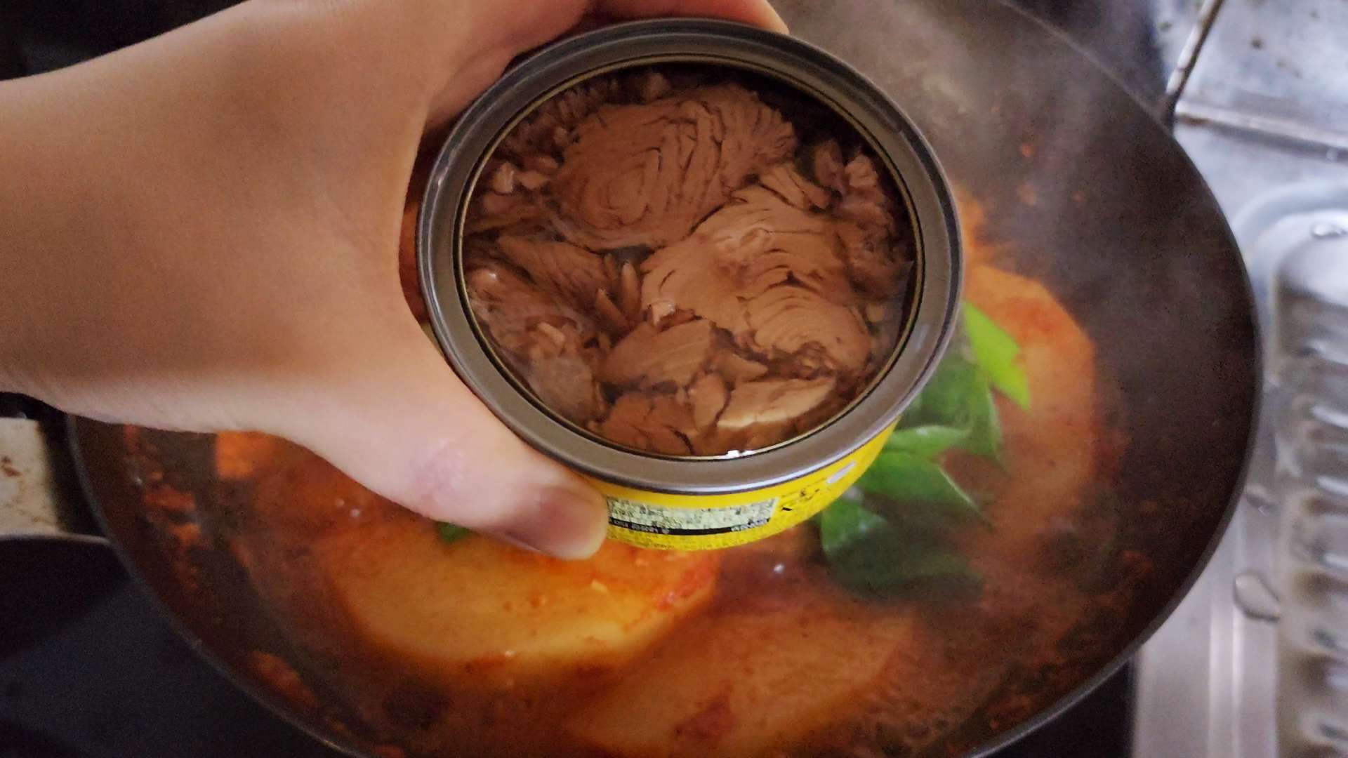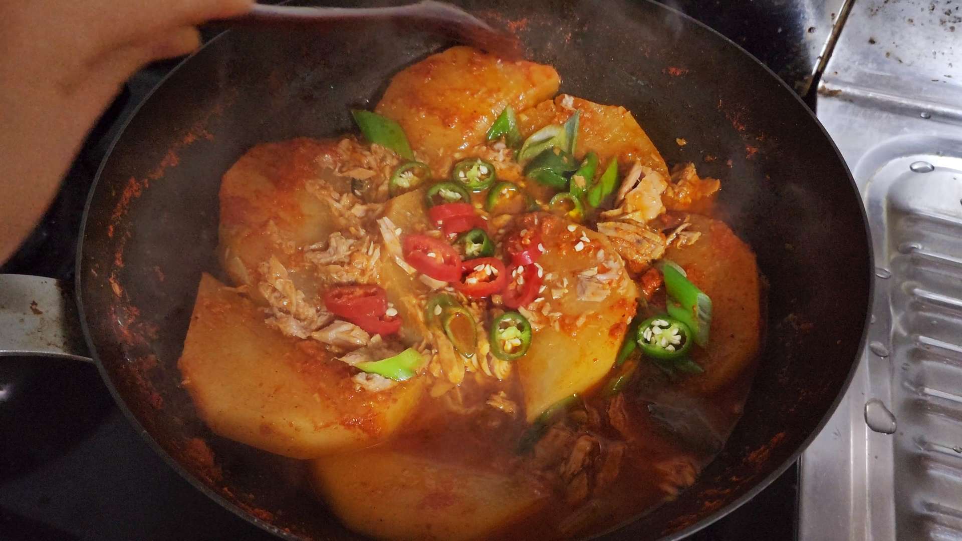 달큰하고 부드러운 무와 참치, 매콤한 양념을 같이 먹으면 맛있답니다.