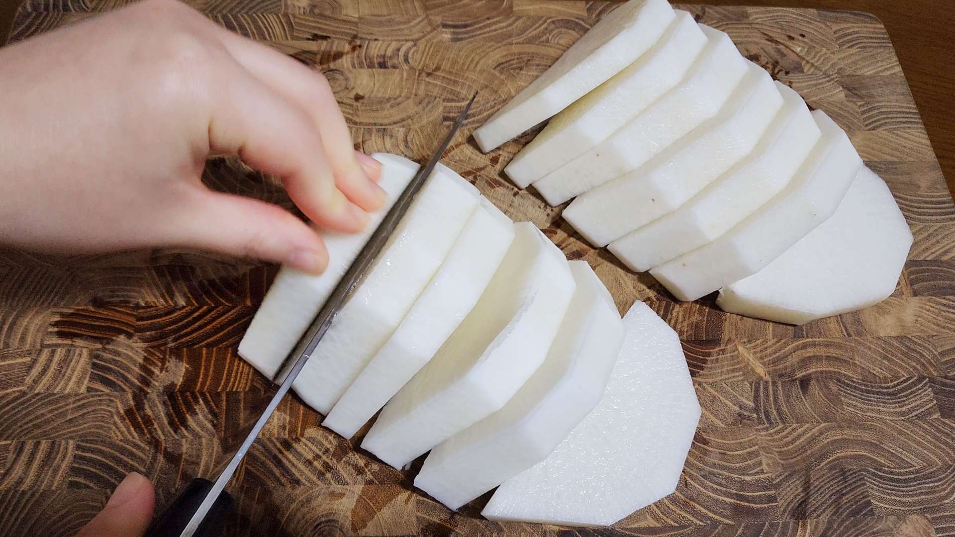 무는 세로로 2등분 해서 1cm 두께로 반달 모양으로 썰어줍니다.
