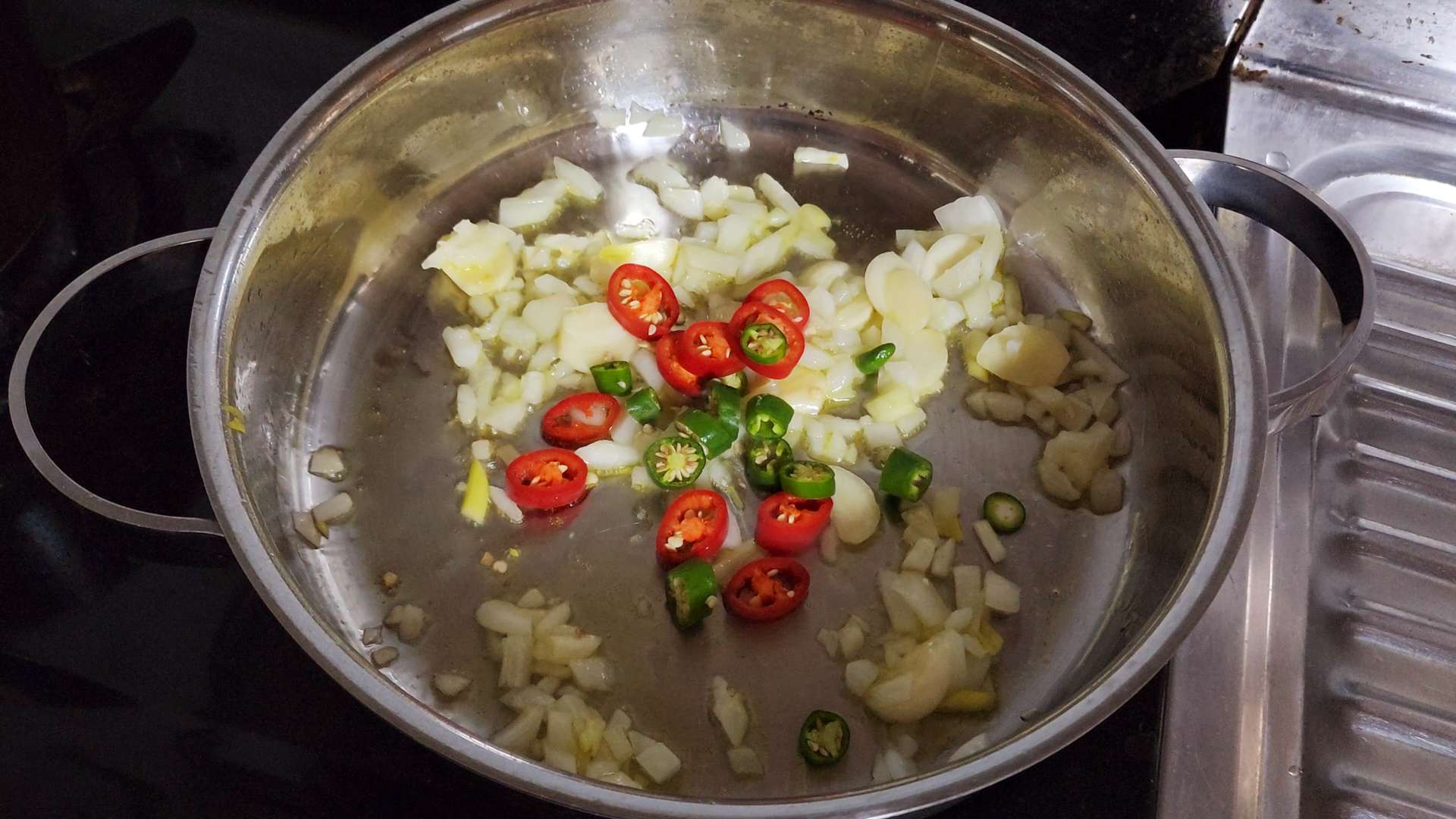 재료: 홍합 200g, 홀토마토 1캔, 마늘 3알, 청양고추 1개, 홍고추 1/2개, 양파 1/2개, 올리브유,