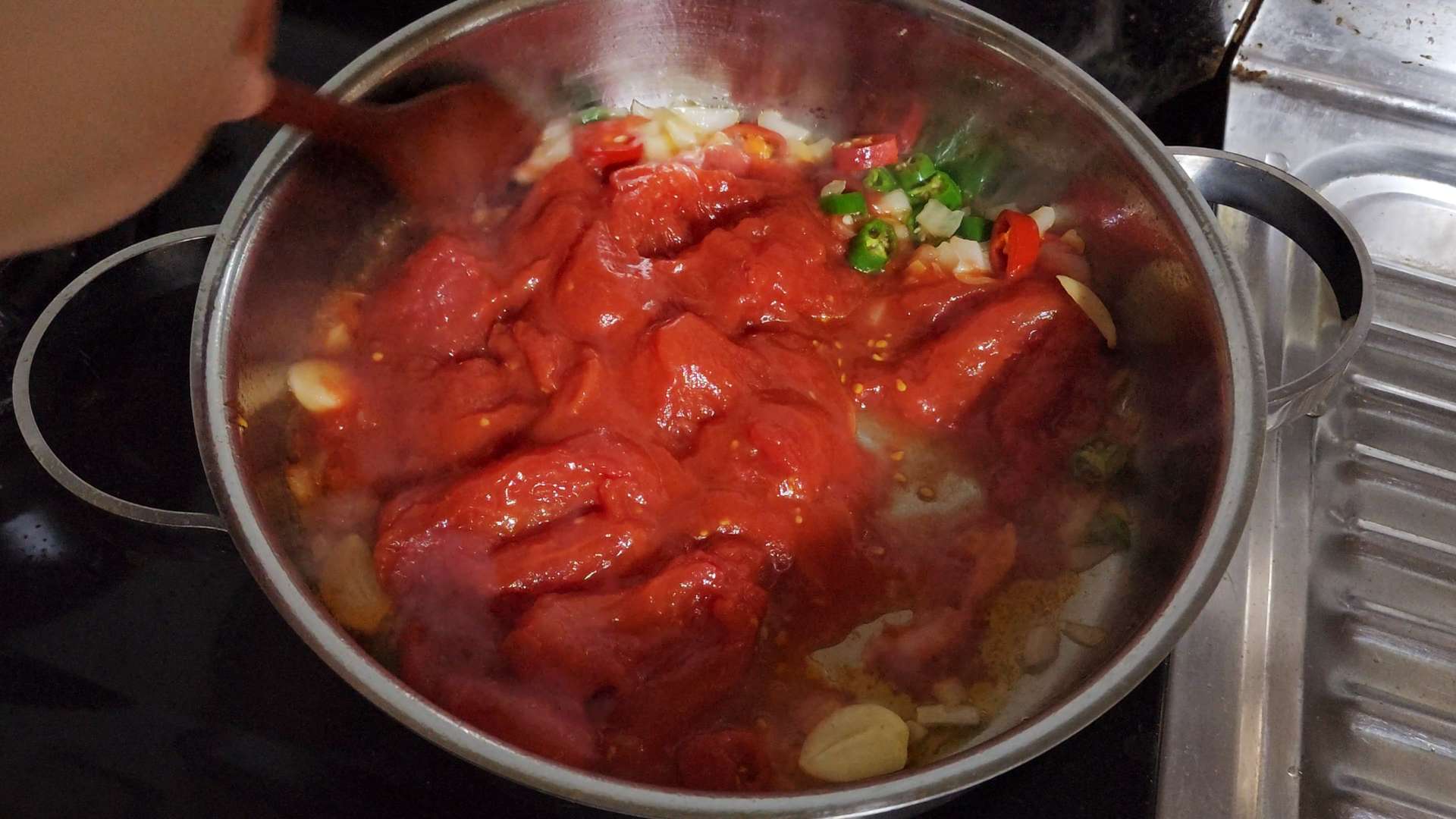 홀토마토 1캔을 넣고 숟가락으로 으깨줍니다.