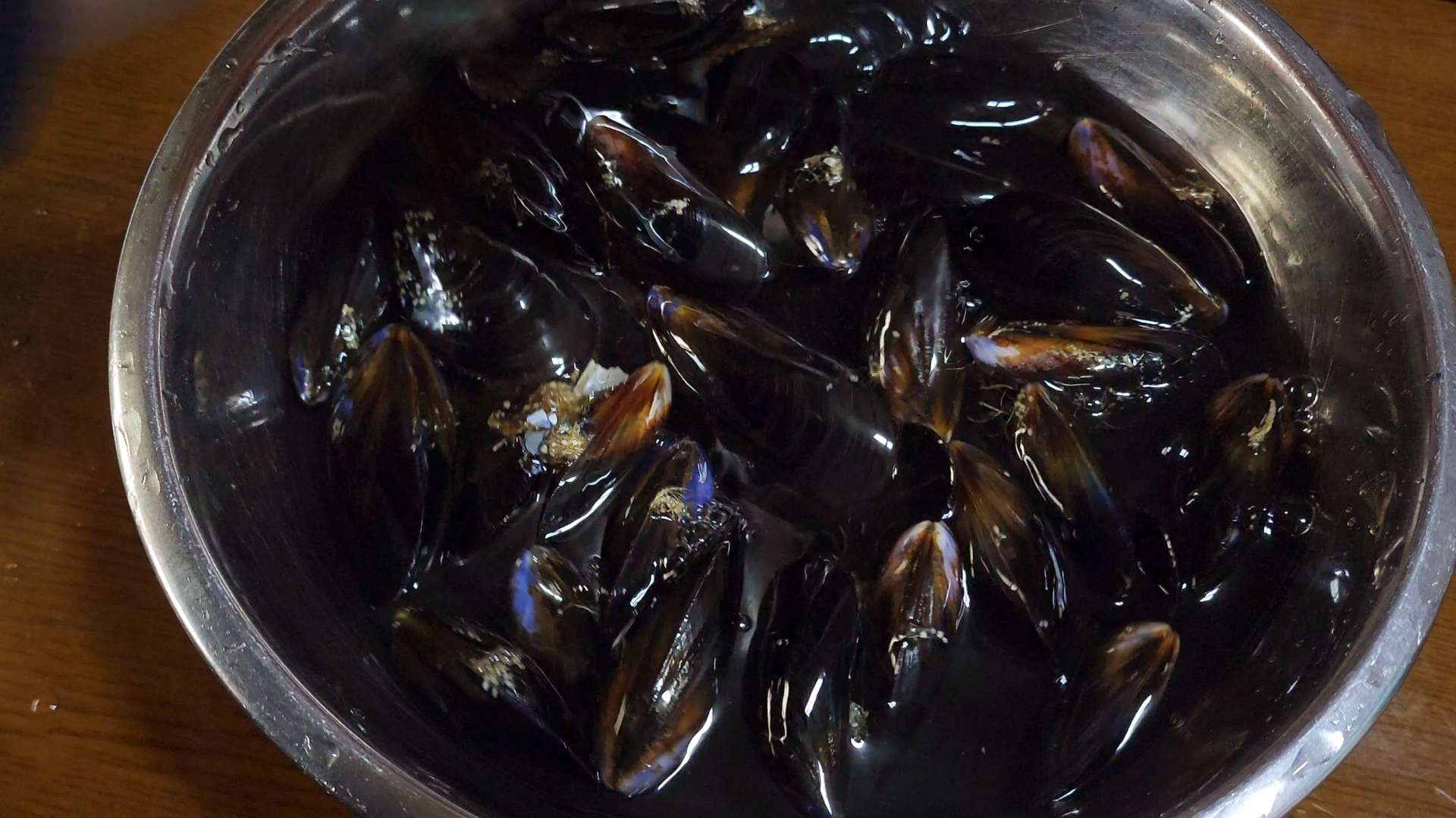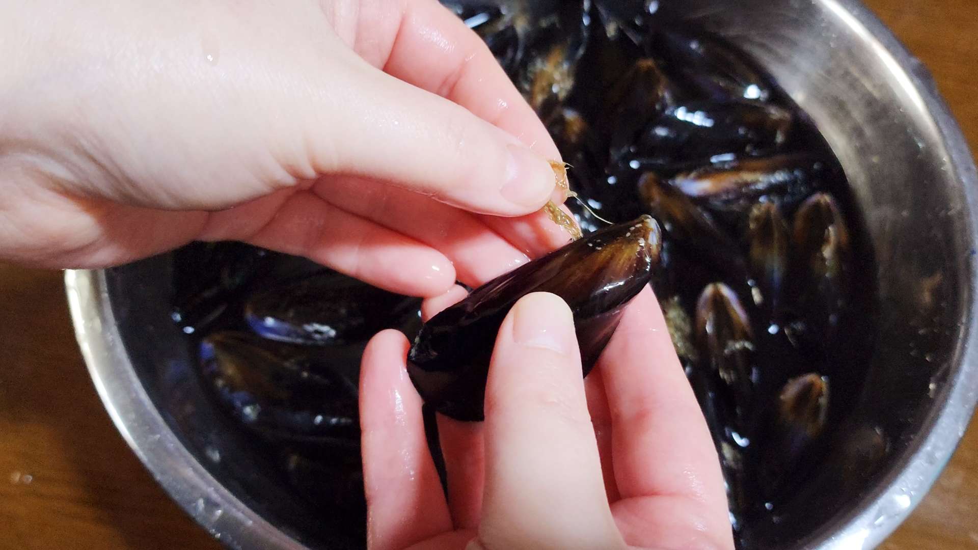 홍합은 수염을 제거하고 비벼 씻고 물기를 제거해줍니다.