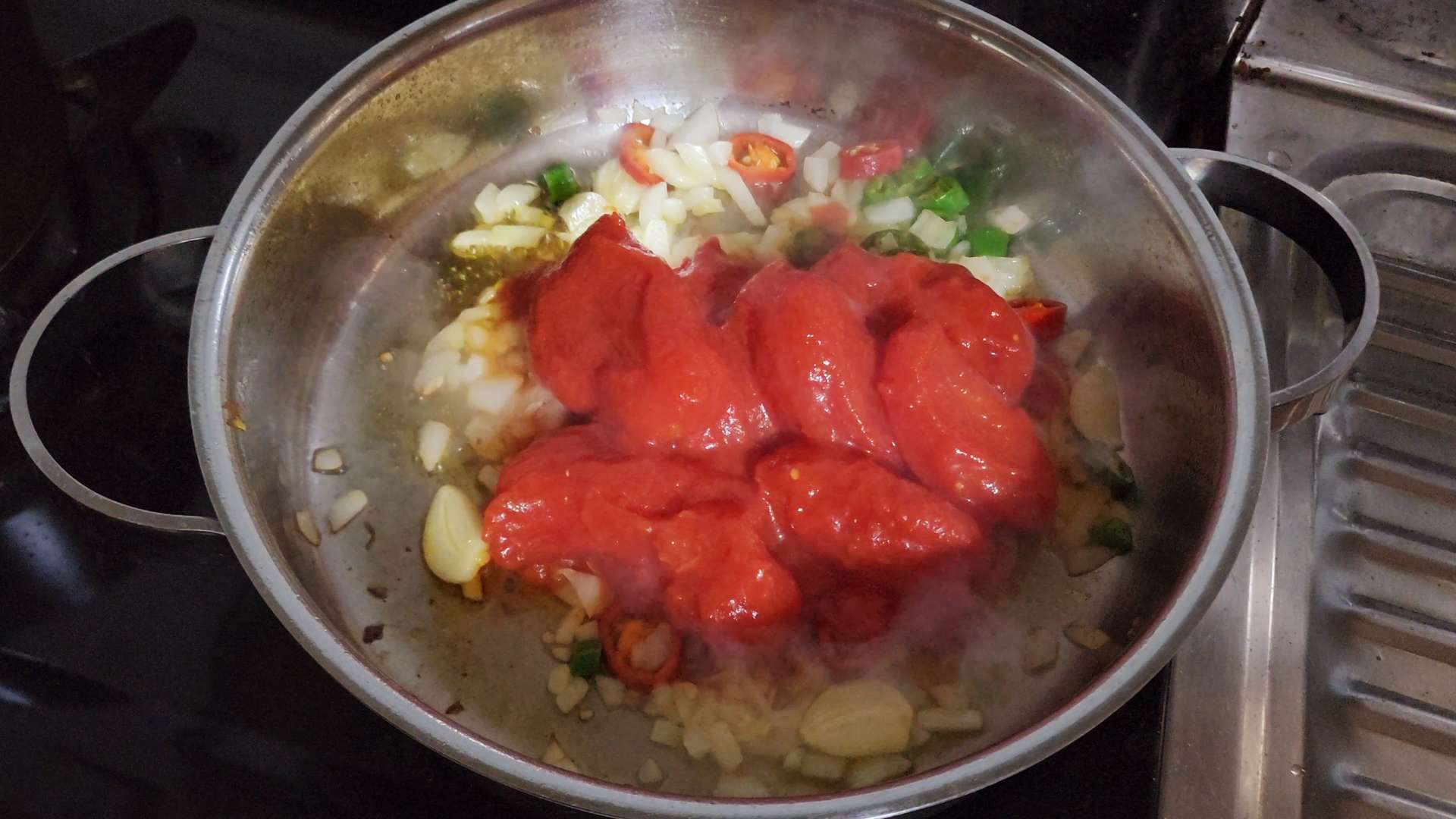 재료: 홍합 200g, 홀토마토 1캔, 마늘 3알, 청양고추 1개, 홍고추 1/2개, 양파 1/2개, 올리브유,