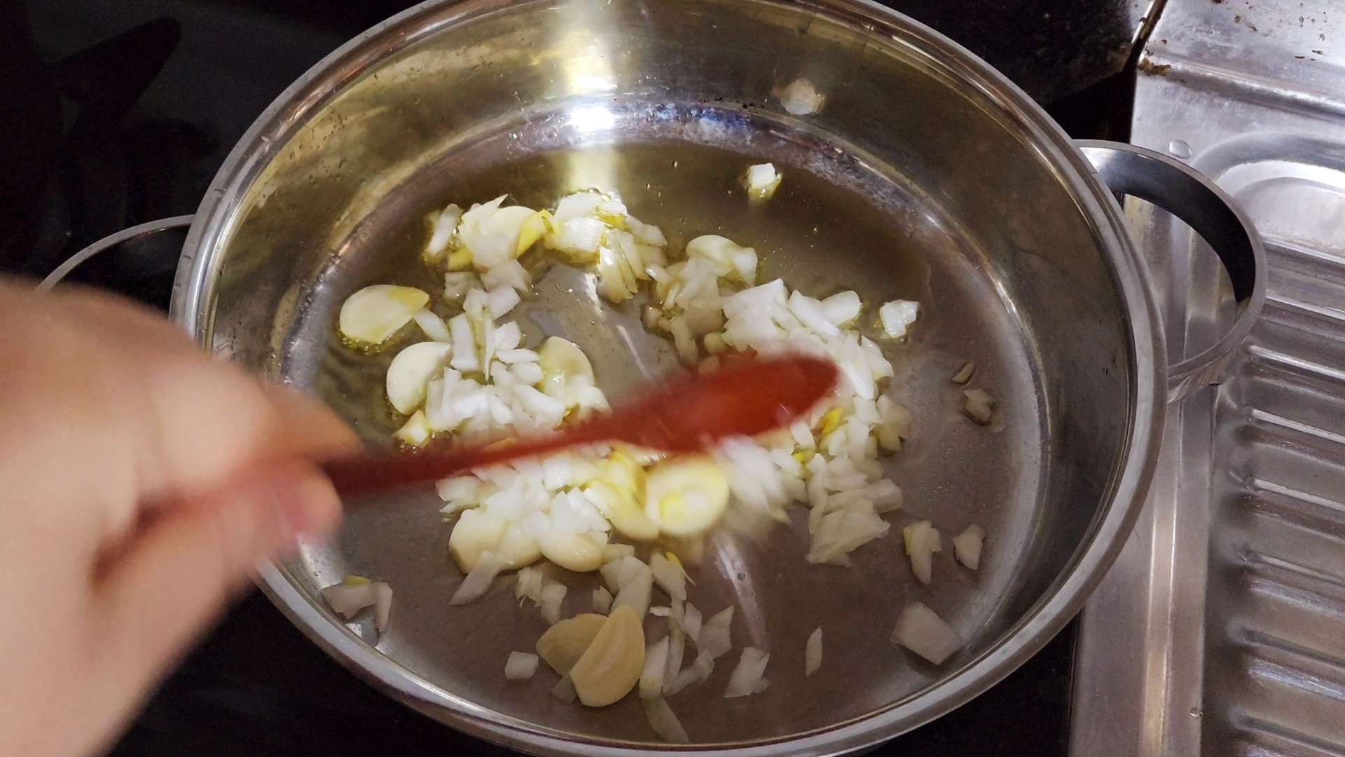 중불로 달군팬에 올리브유, 마늘, 양파를 넣고 볶아줍니다.