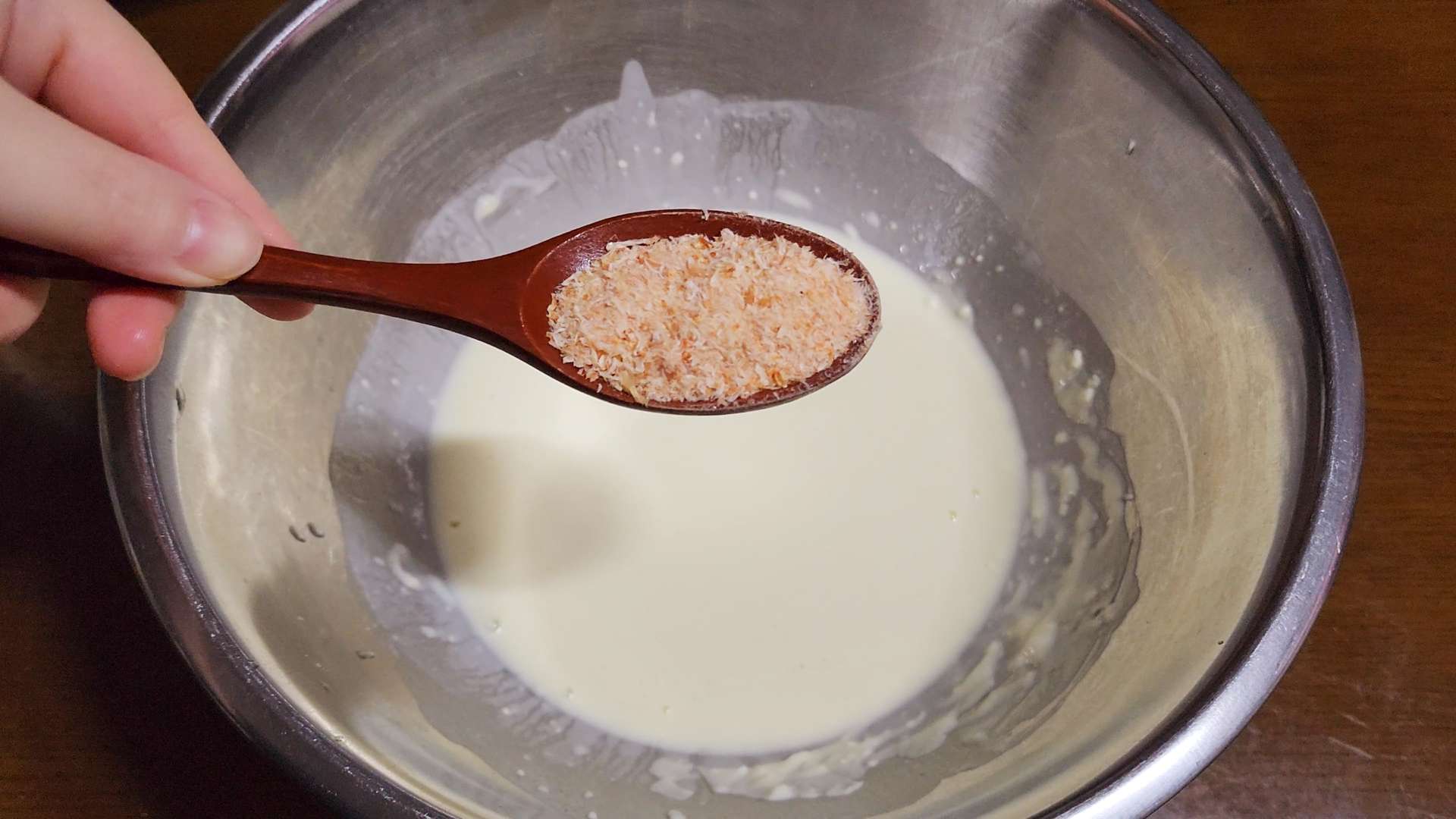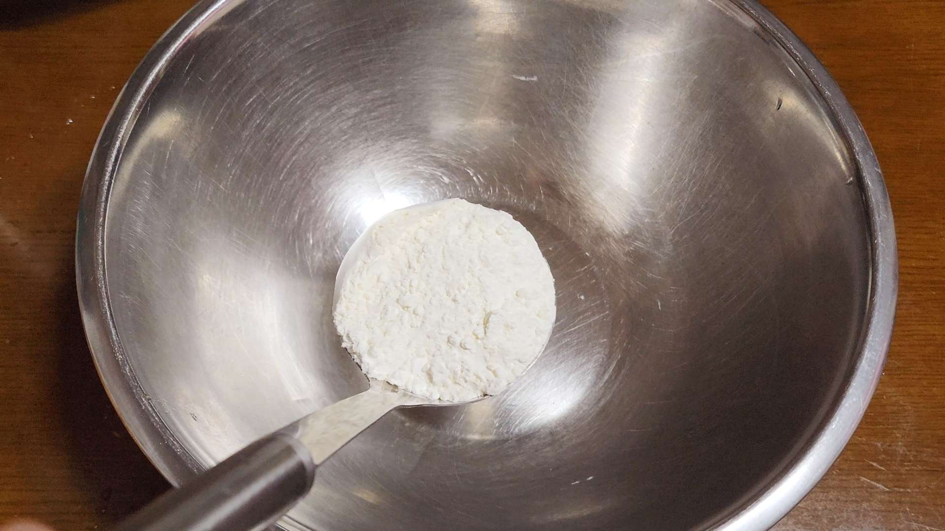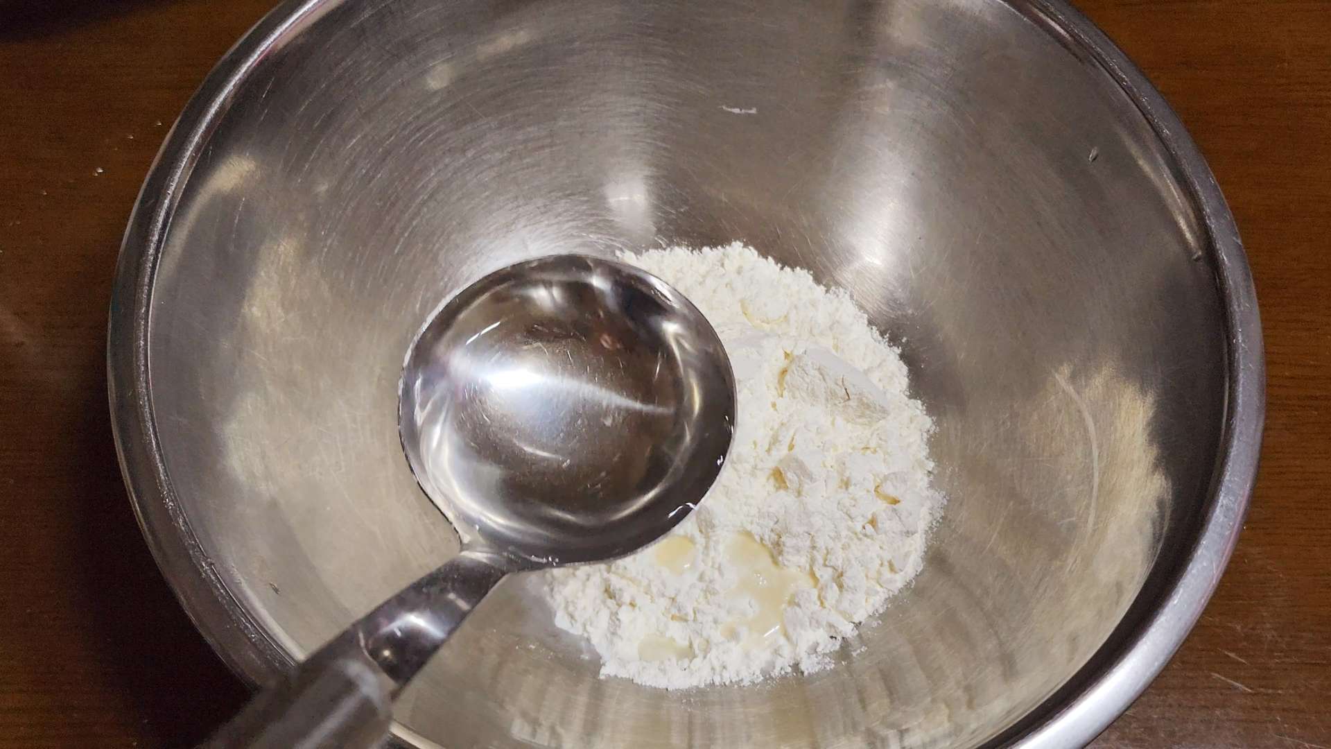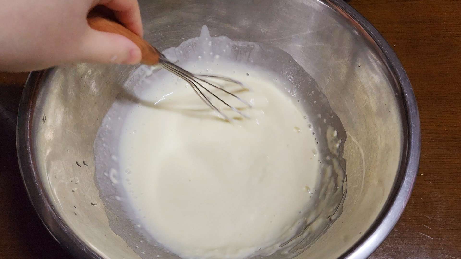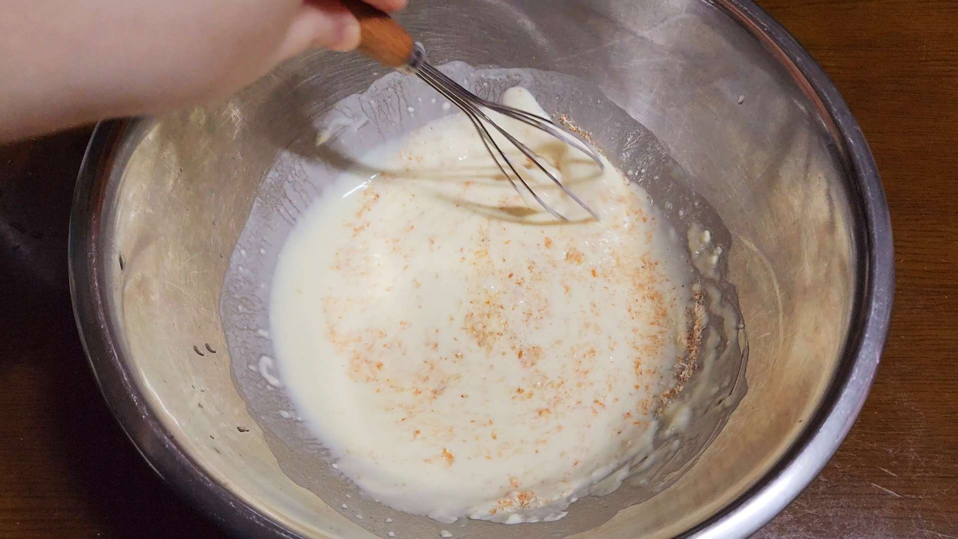부침가루 100ml, 물 100ml를 섞어줍니다.