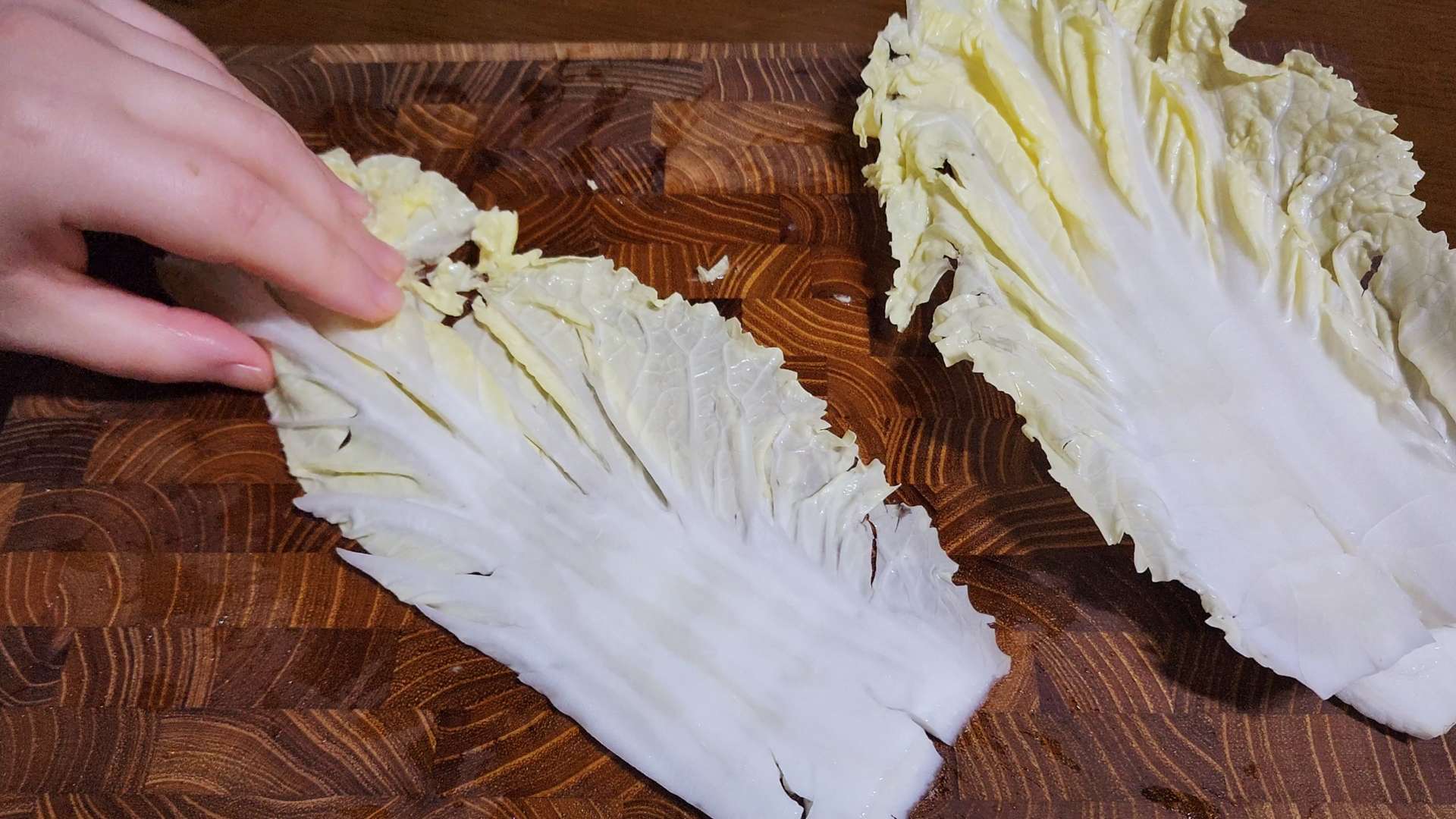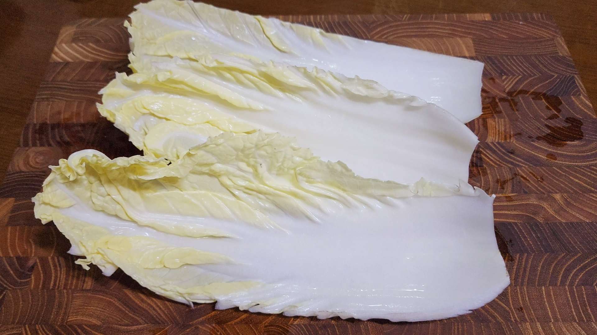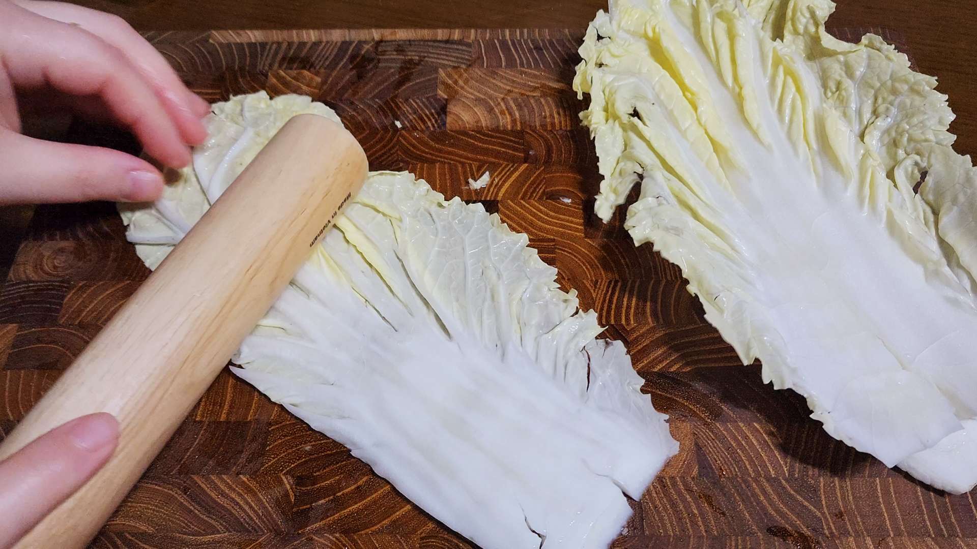 알배추는 밑동을 잘라 낱낱이 가르고 배추의 줄기 부분을 밀대로 두드려 펴줍니다.