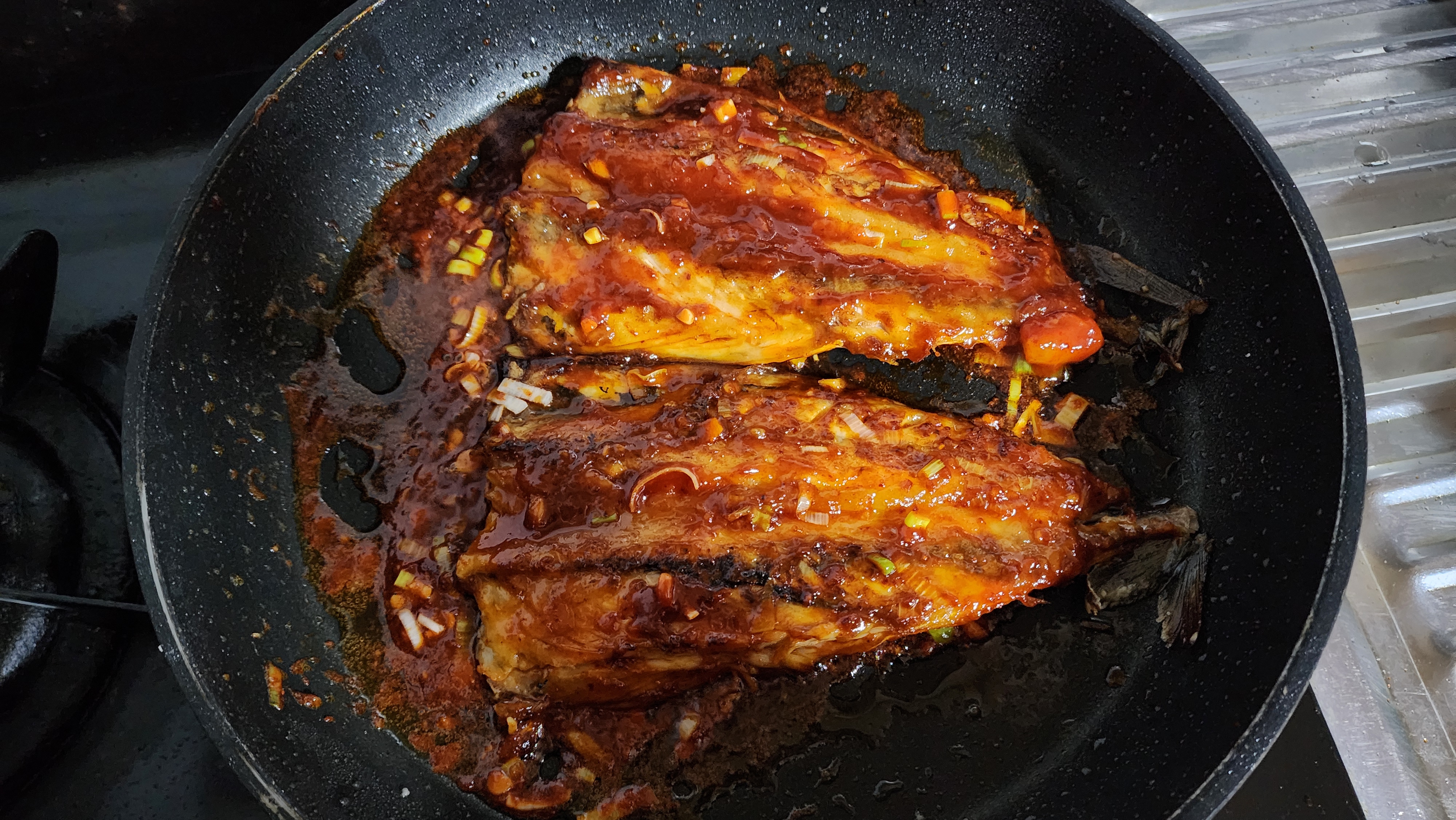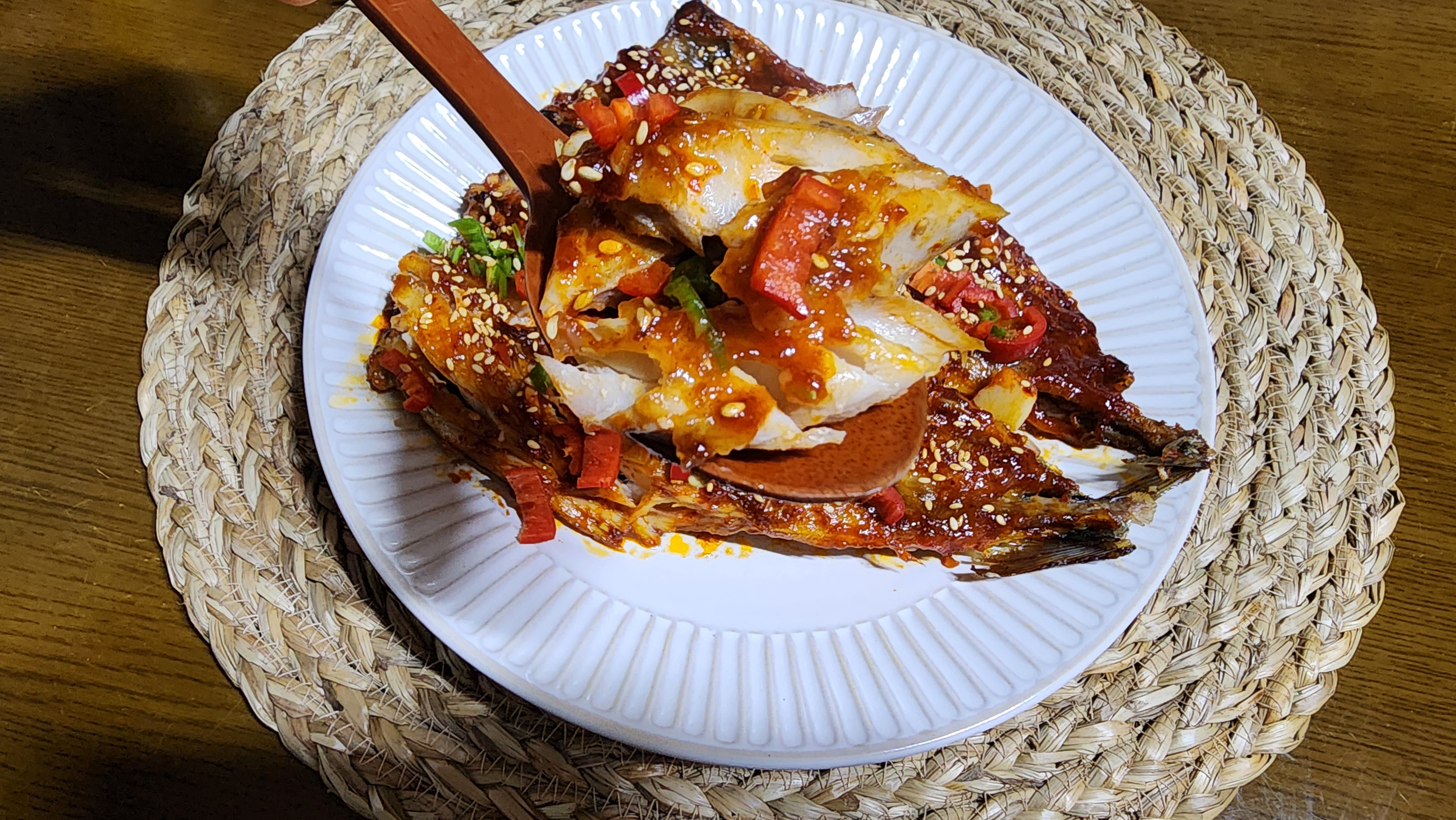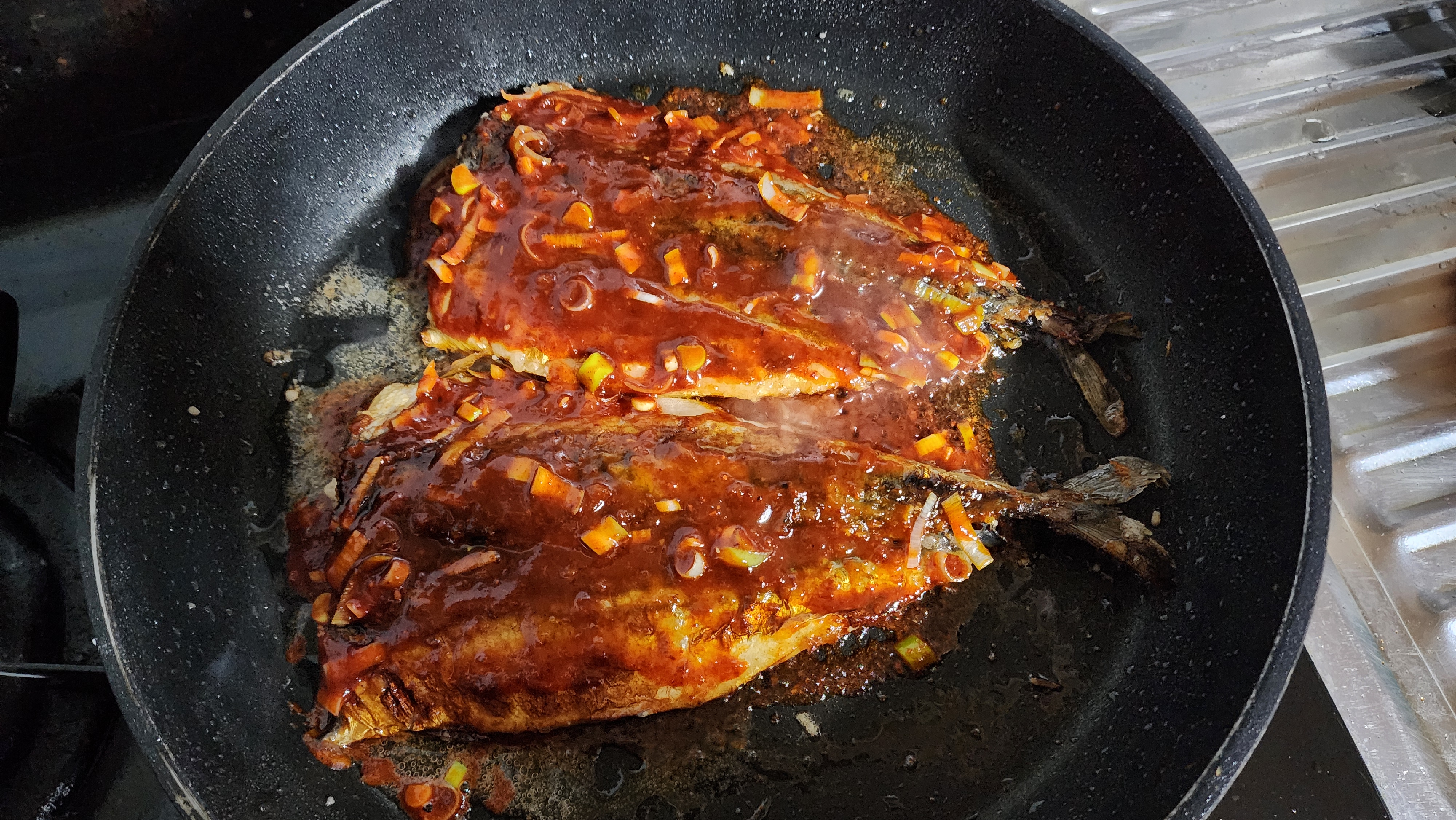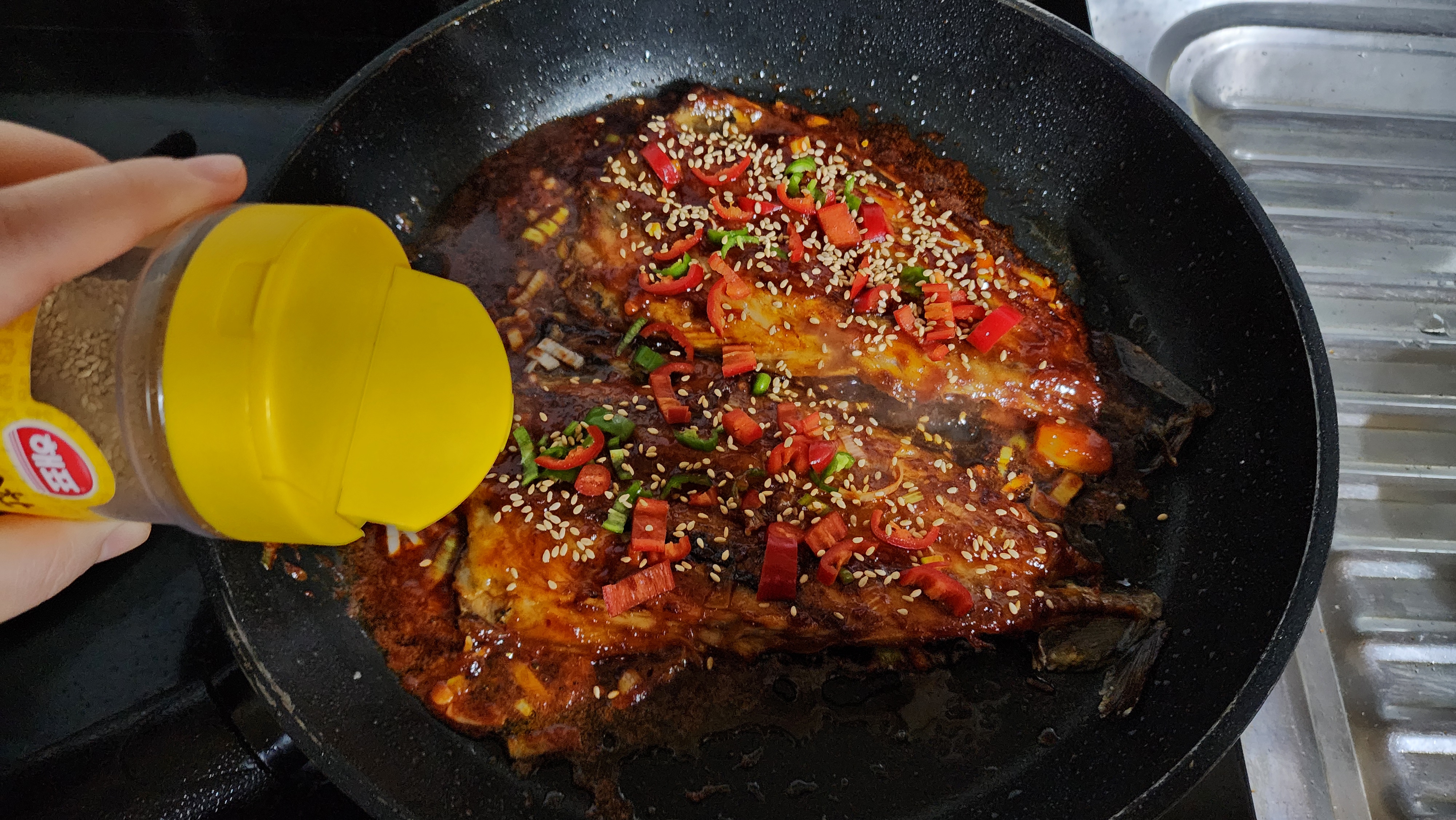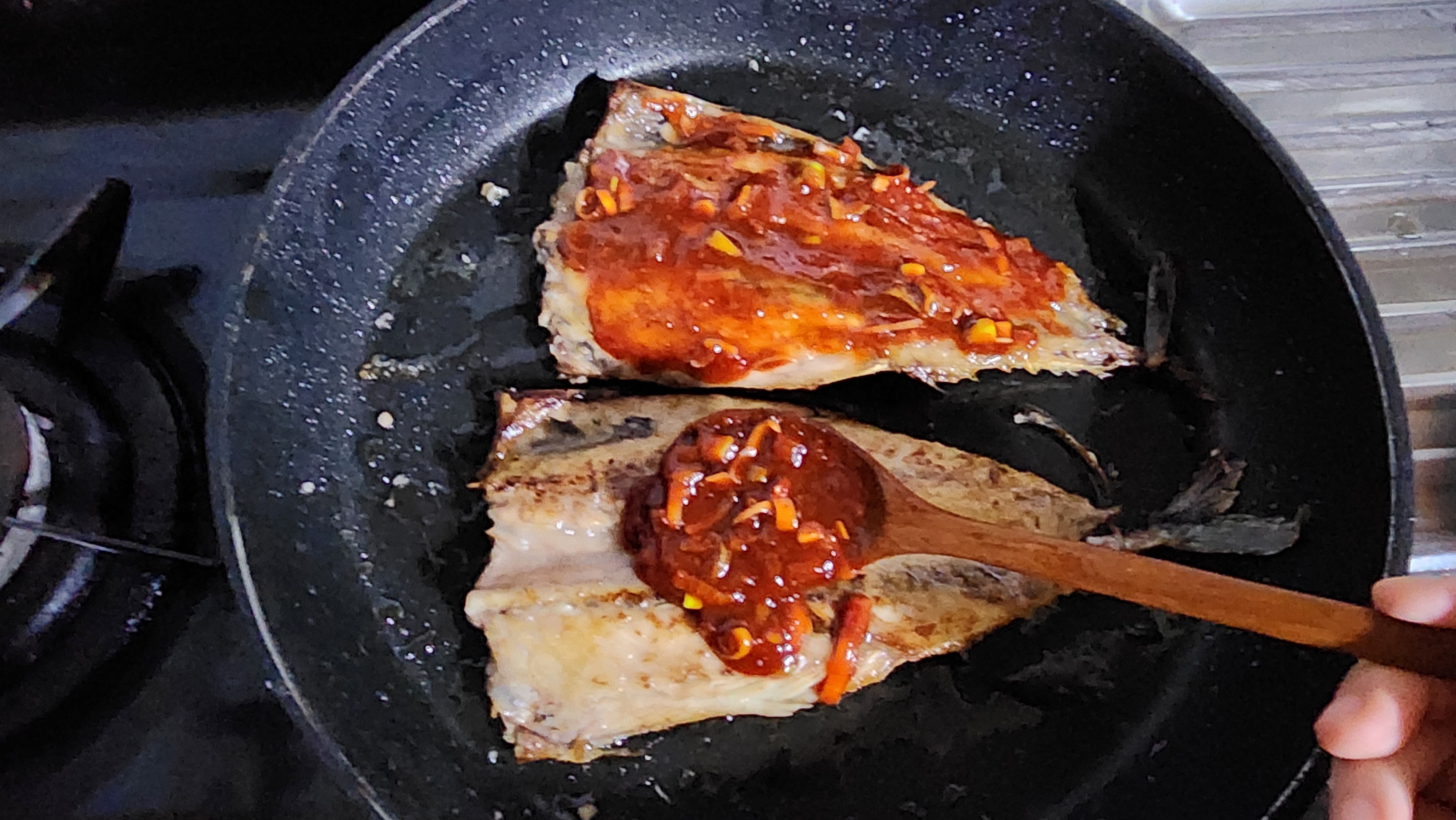 구운 고등어의 한쪽면에 양념장을 바르고 약불에서 구워줍니다. 뒤집어서 다른 쪽면에도 양념장을 바르고 약불에서 구워줍니다.