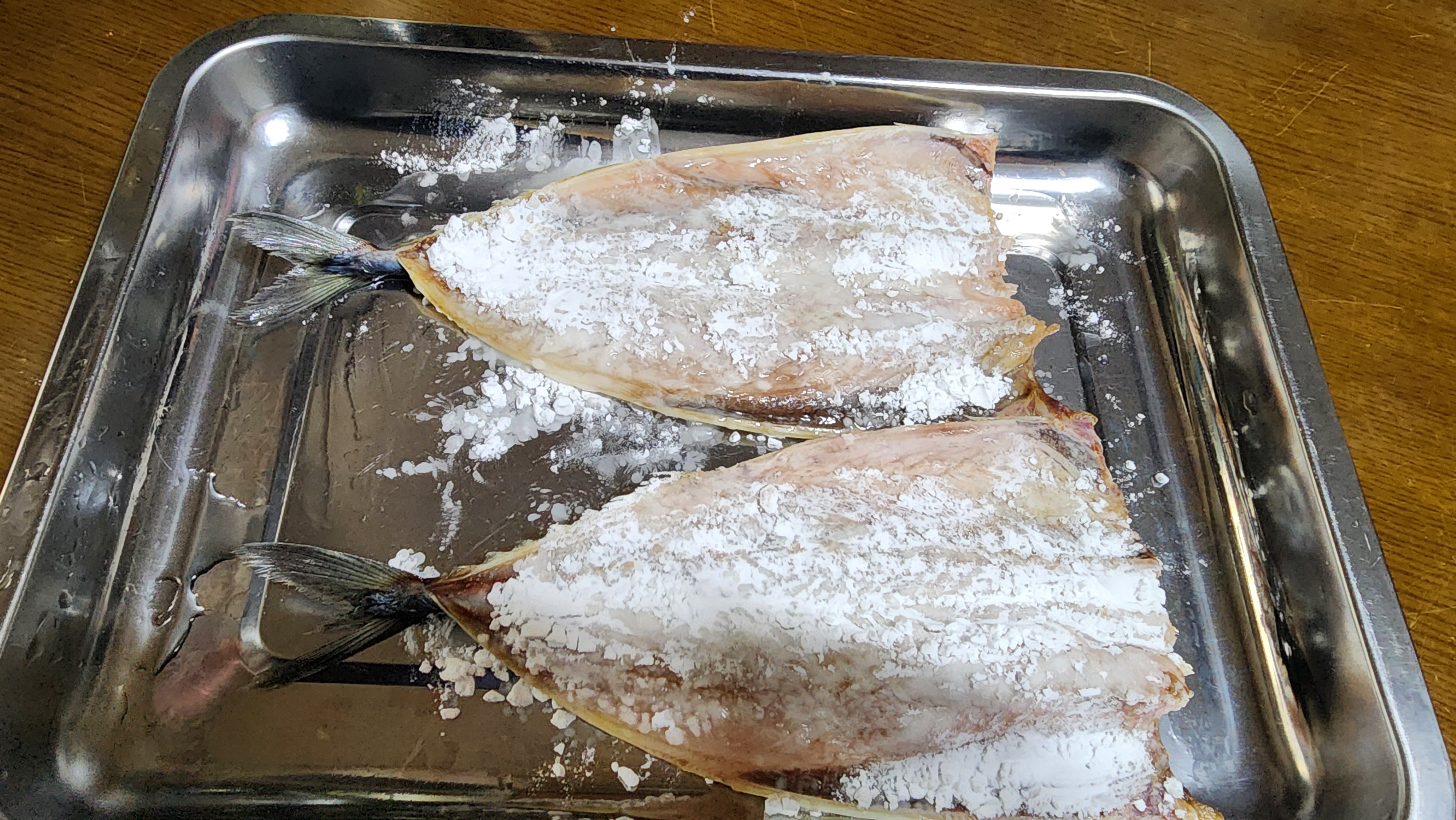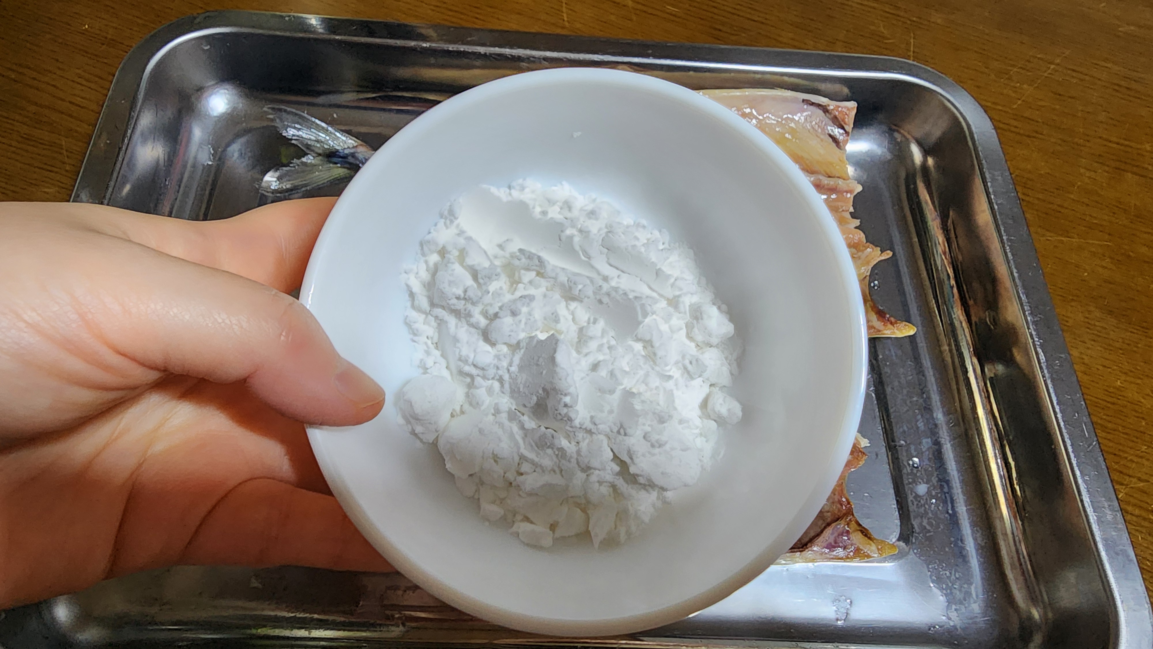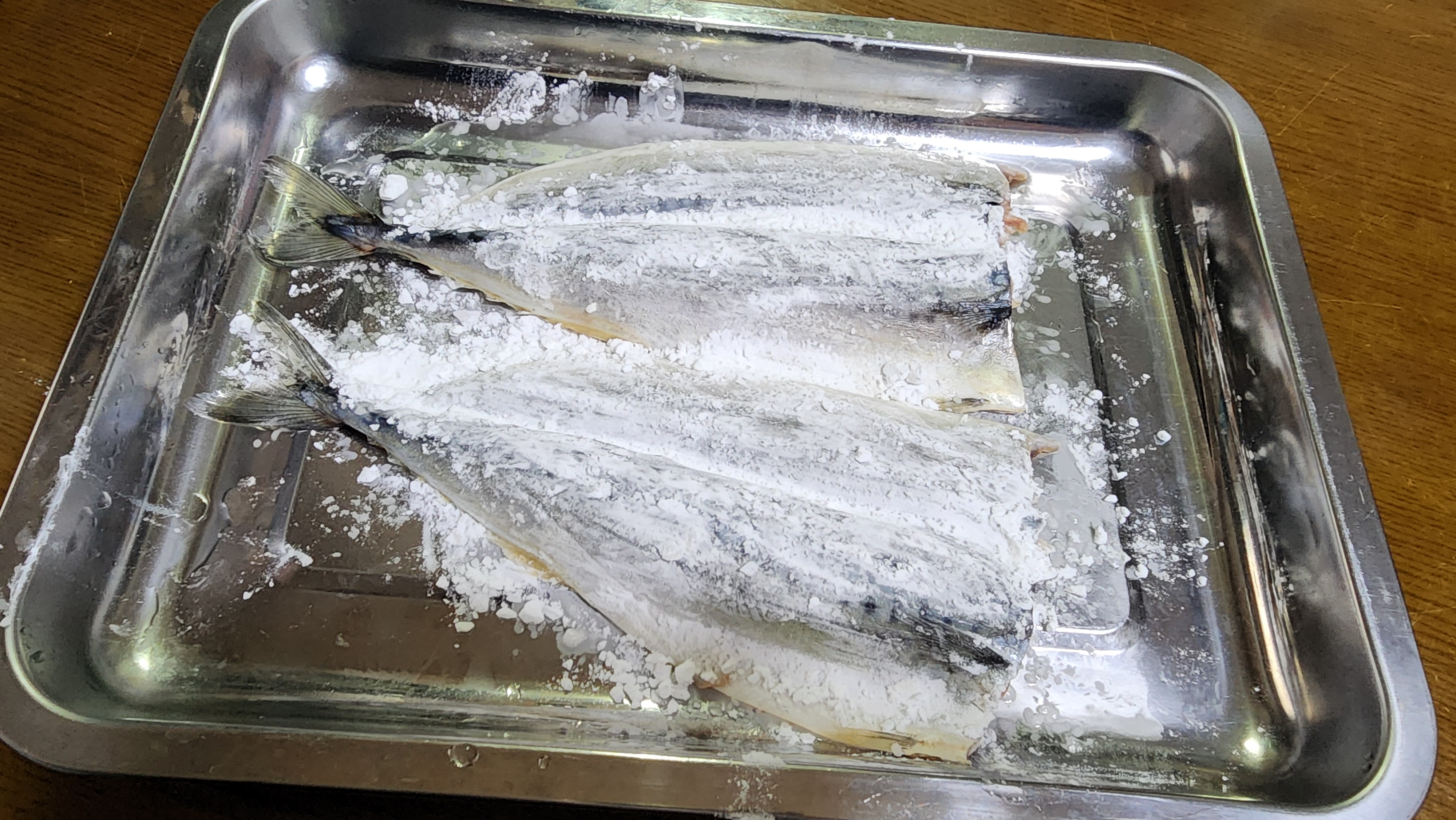 고등어 한 면에 전분가루 2T를 골고루 뿌려