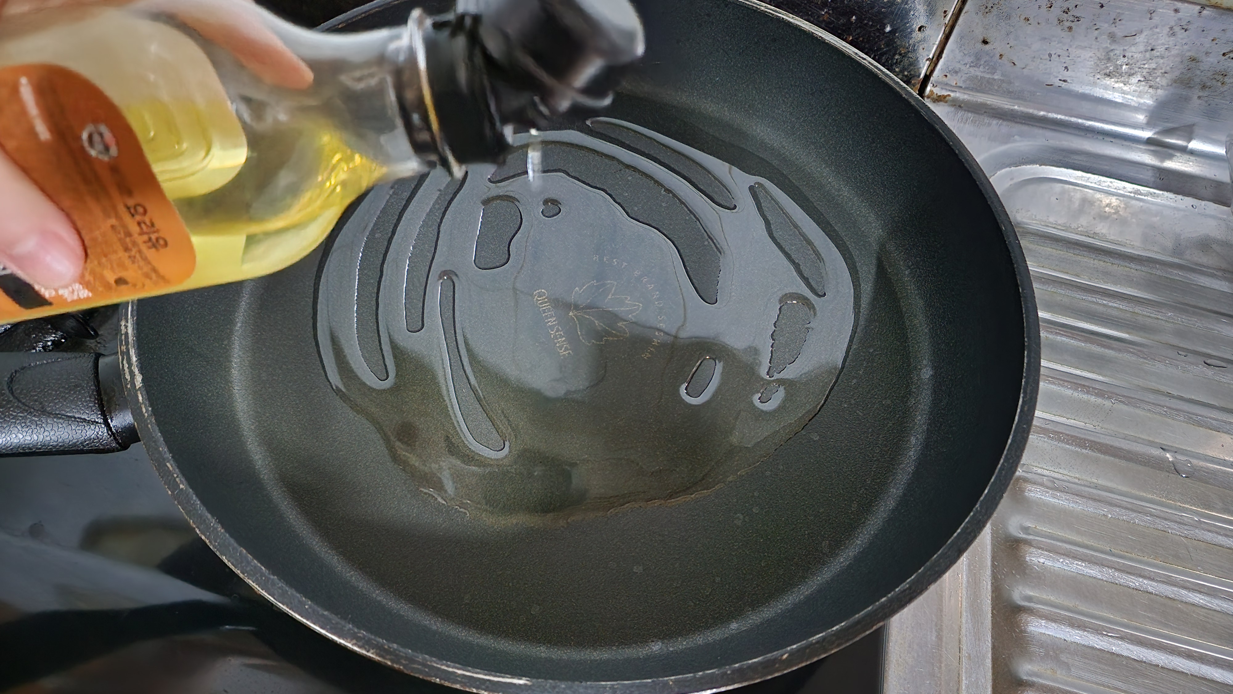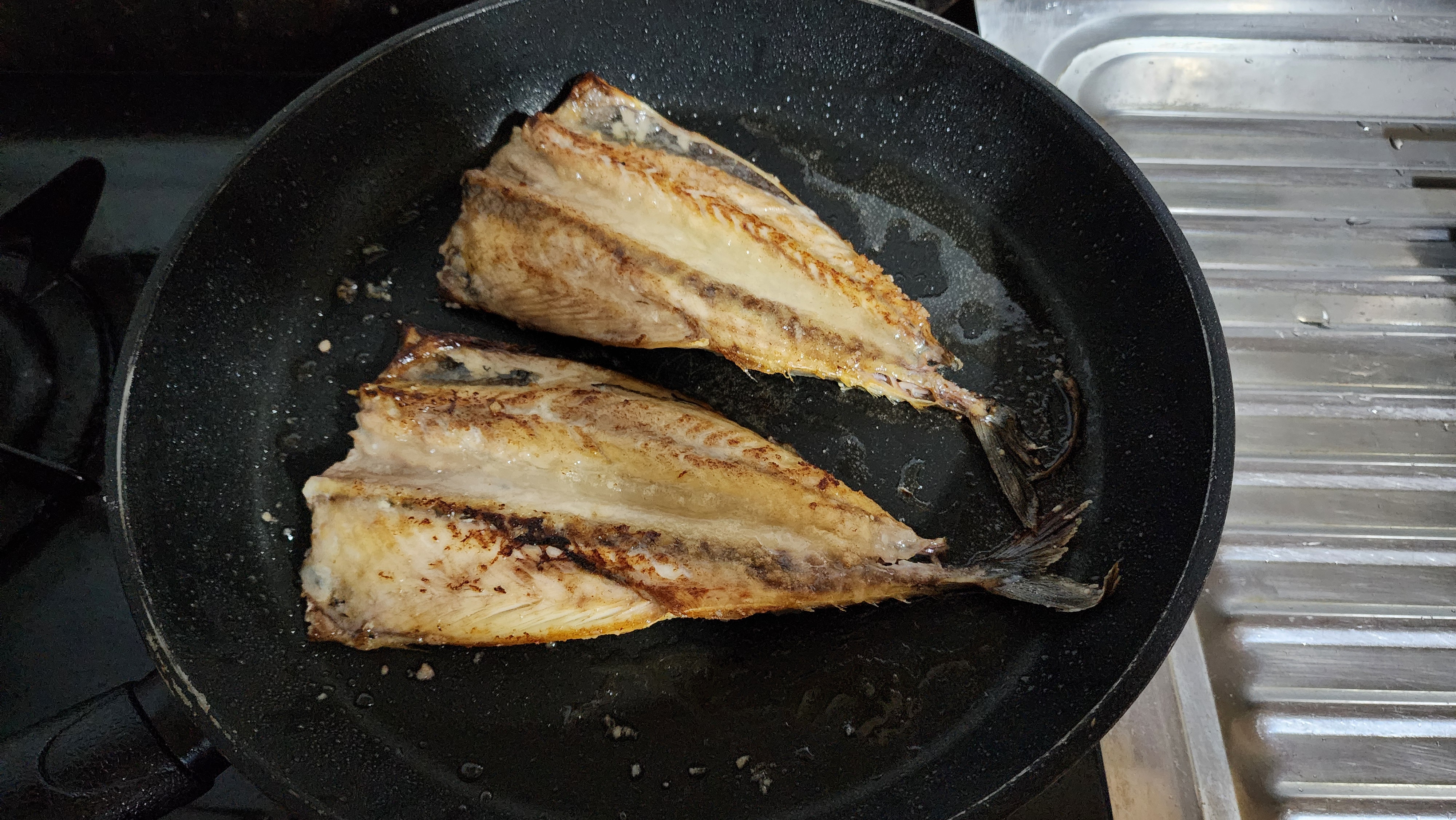 중불로 달군 팬에 식용유를 넣고 고등어의 껍질 면이 팬 바닥에 오도록 올려줍니다.