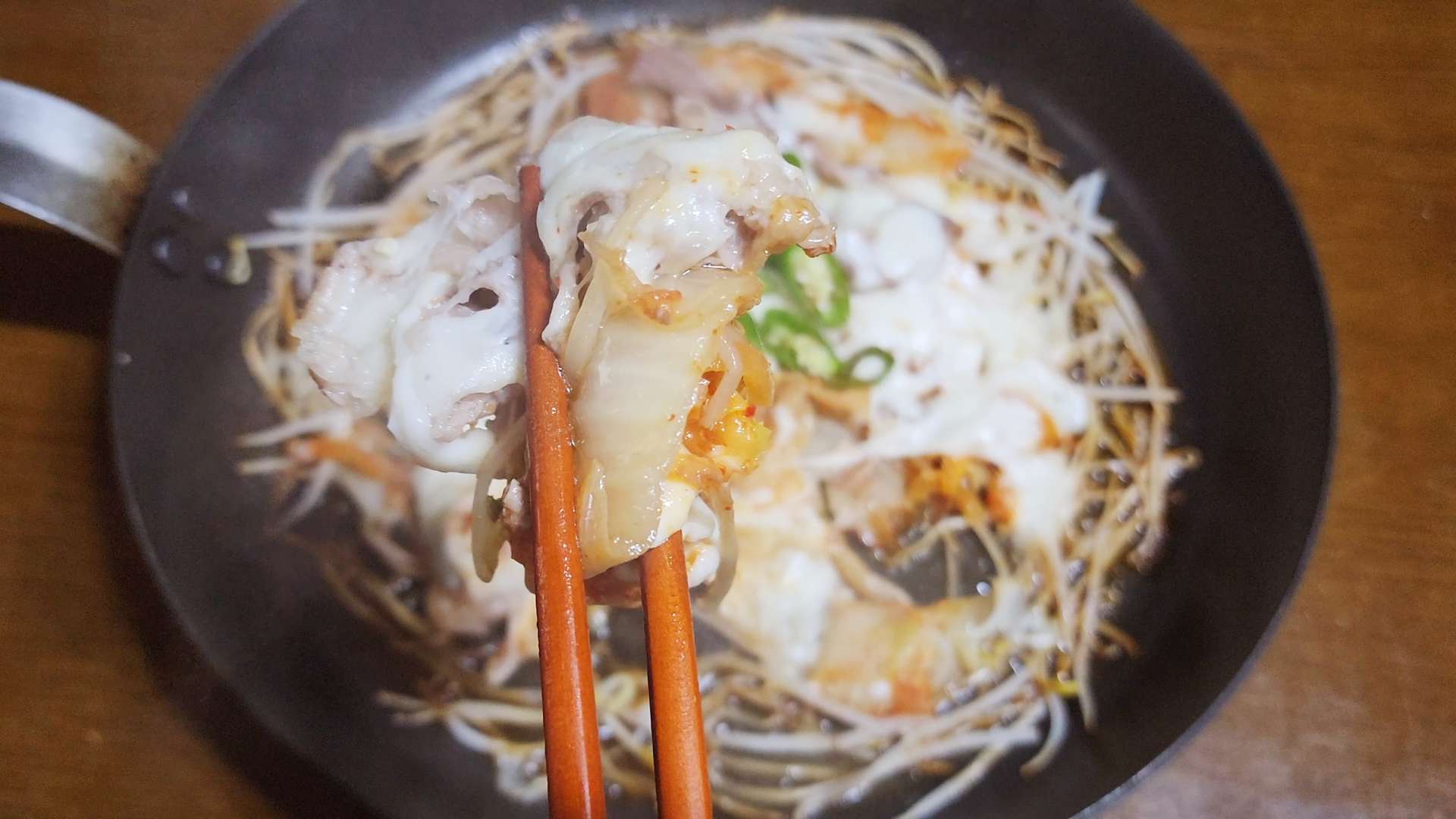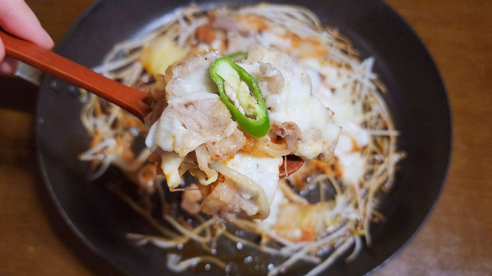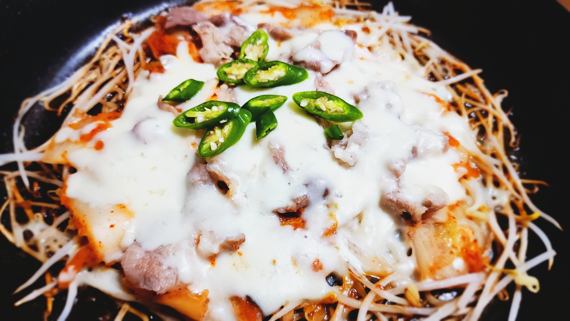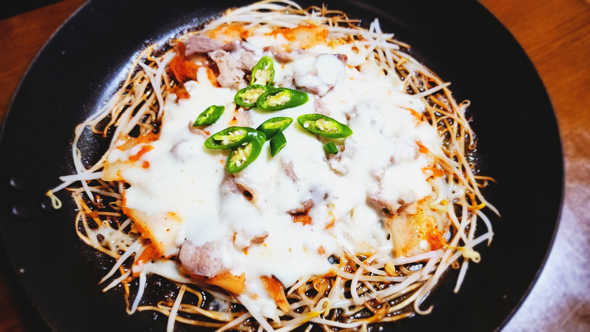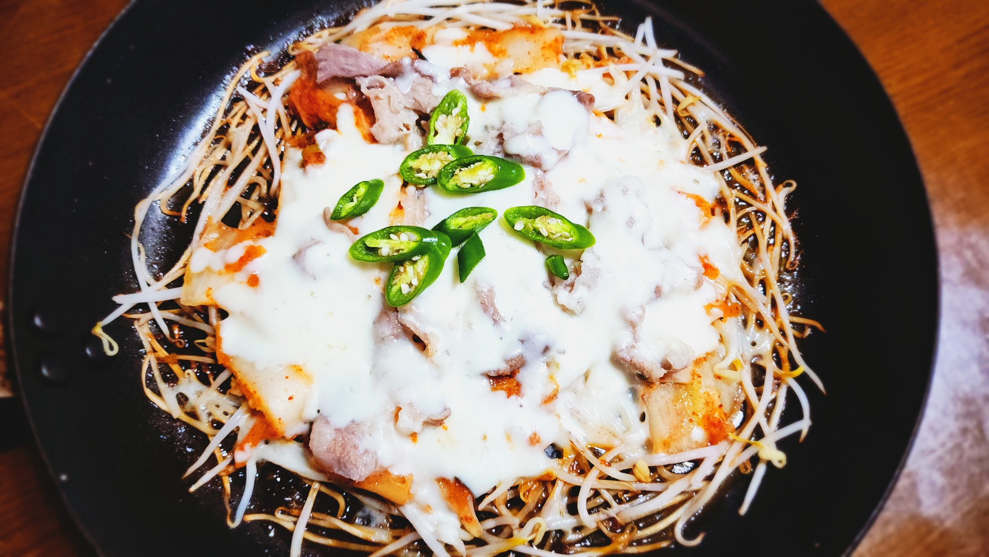 숙주의 아삭함과 우삼겹, 김치를 고소한 치즈와 같이 먹으면 맛있답니다.