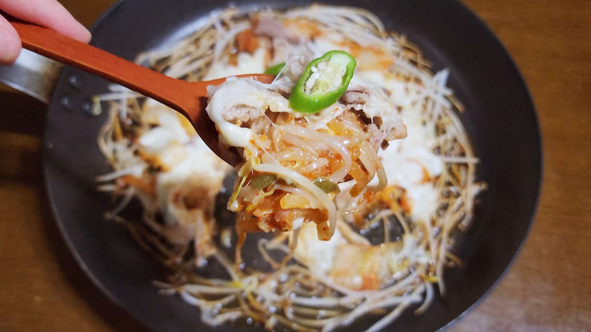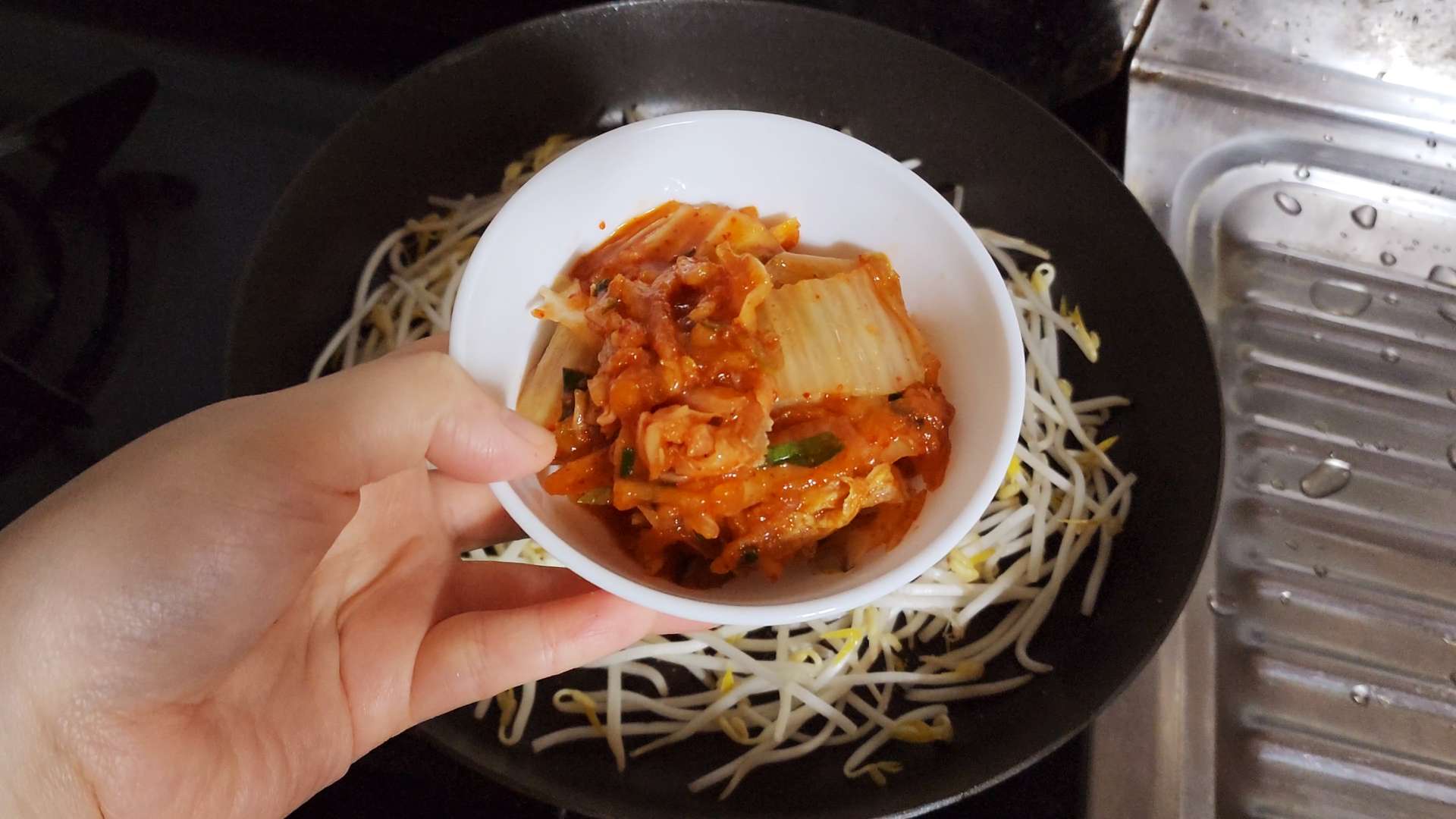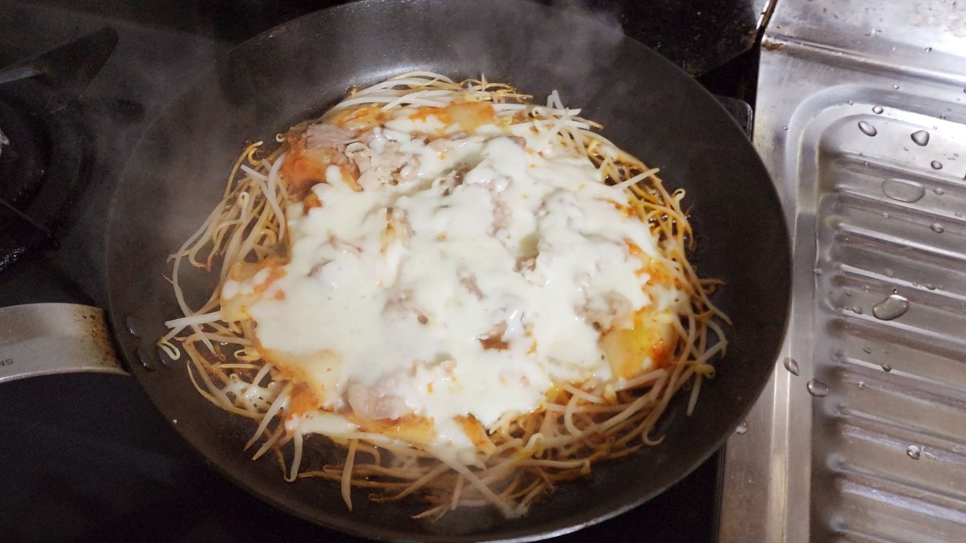 재료: 숙주 한 줌 반, 김치 1/4포기, 차돌박이 150g, 모짜렐라 치즈 120g, 청양고추 1개, 간장 1T, 식초 1T, 설탕 1T, 참기름 1T