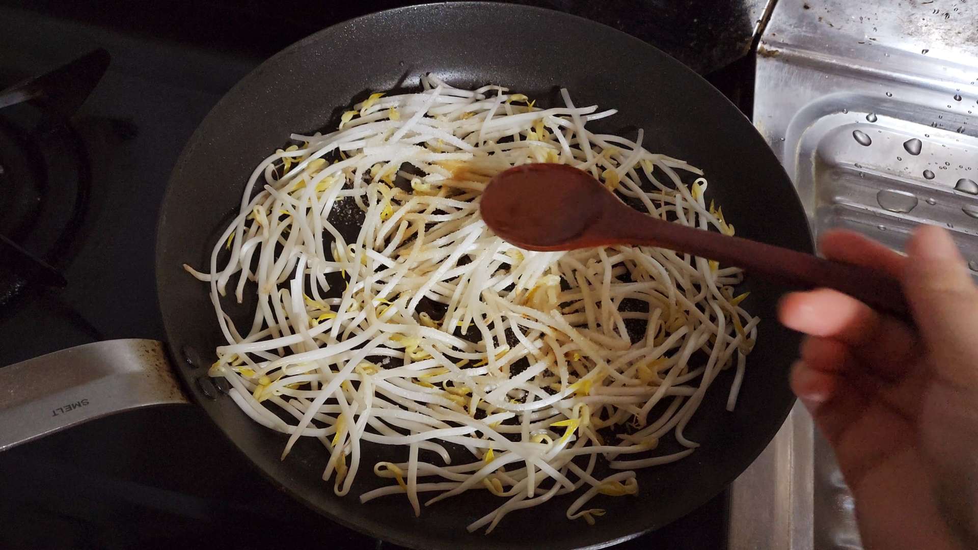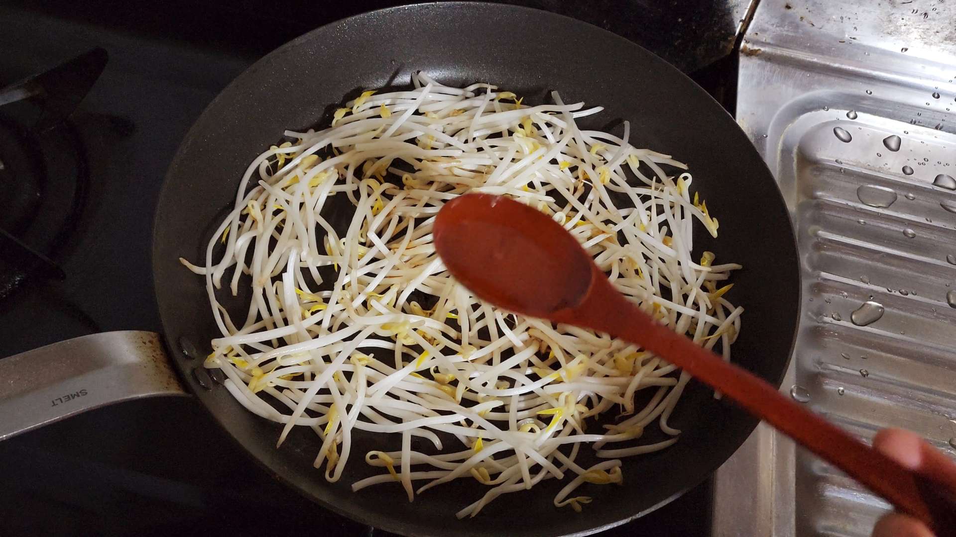팬 바닥에 숙주 한 줌 반을 넓게 깔아줍니다.