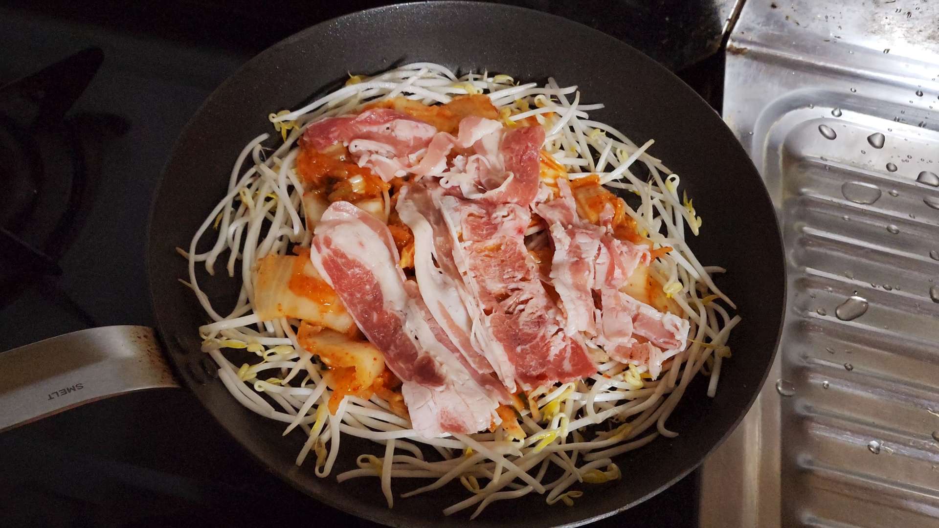 송송 썬 김치를 숙주 위에 넓게 올리고 위에 우삼겹을 한 장씩 덮어줍니다.