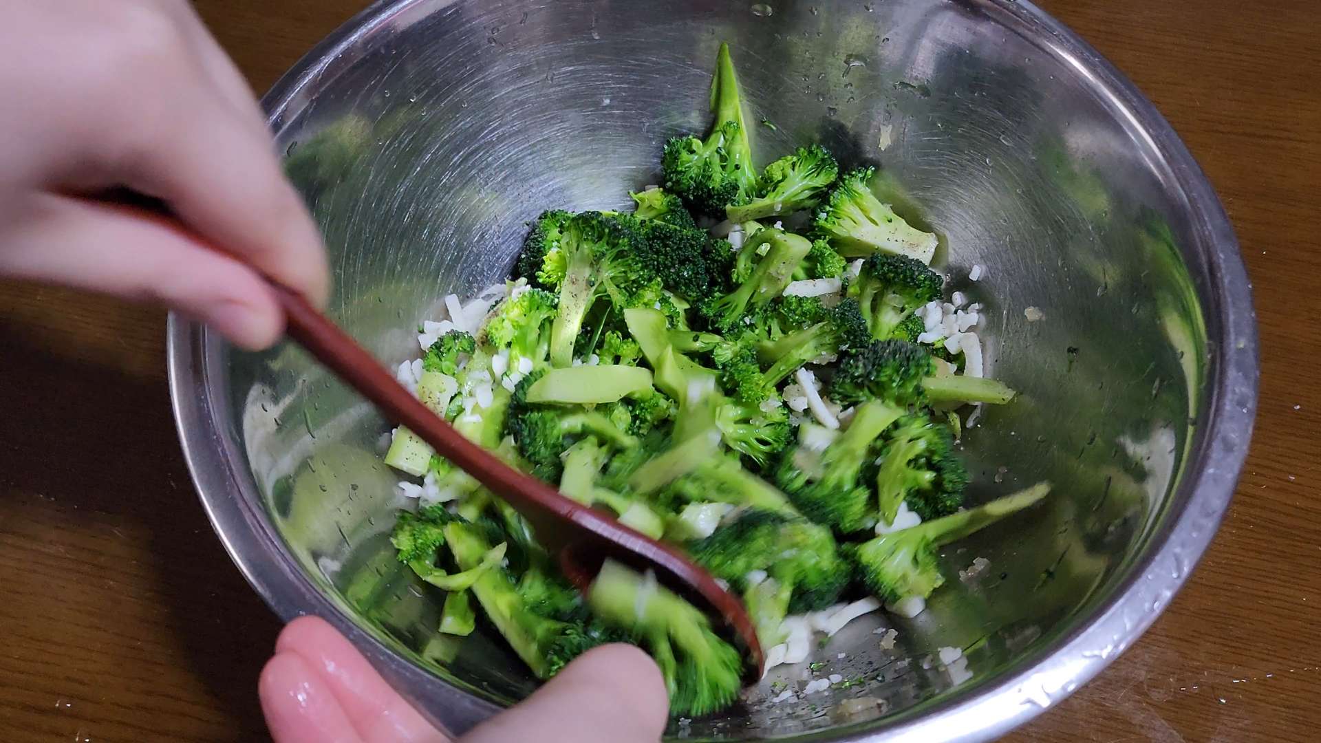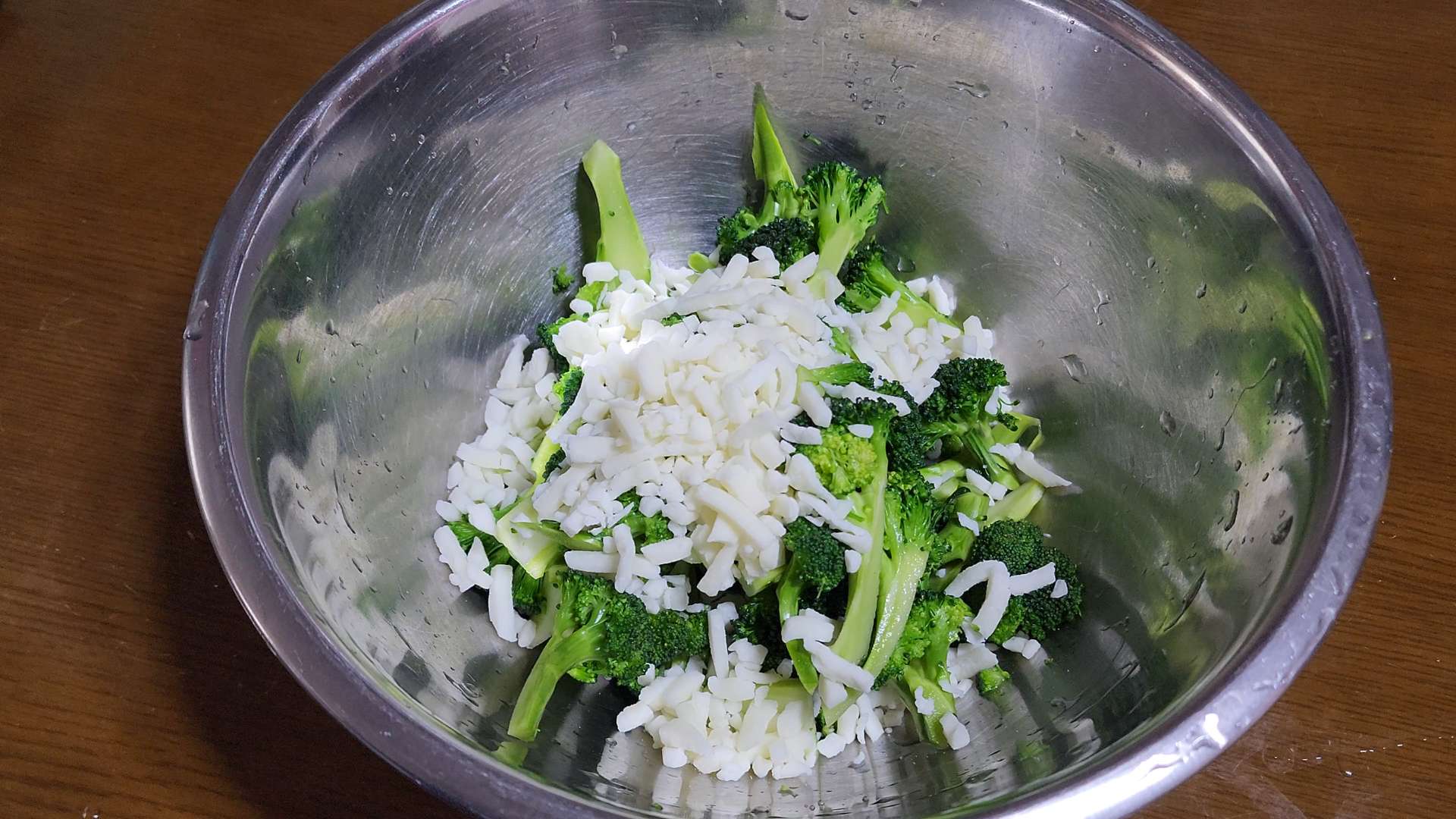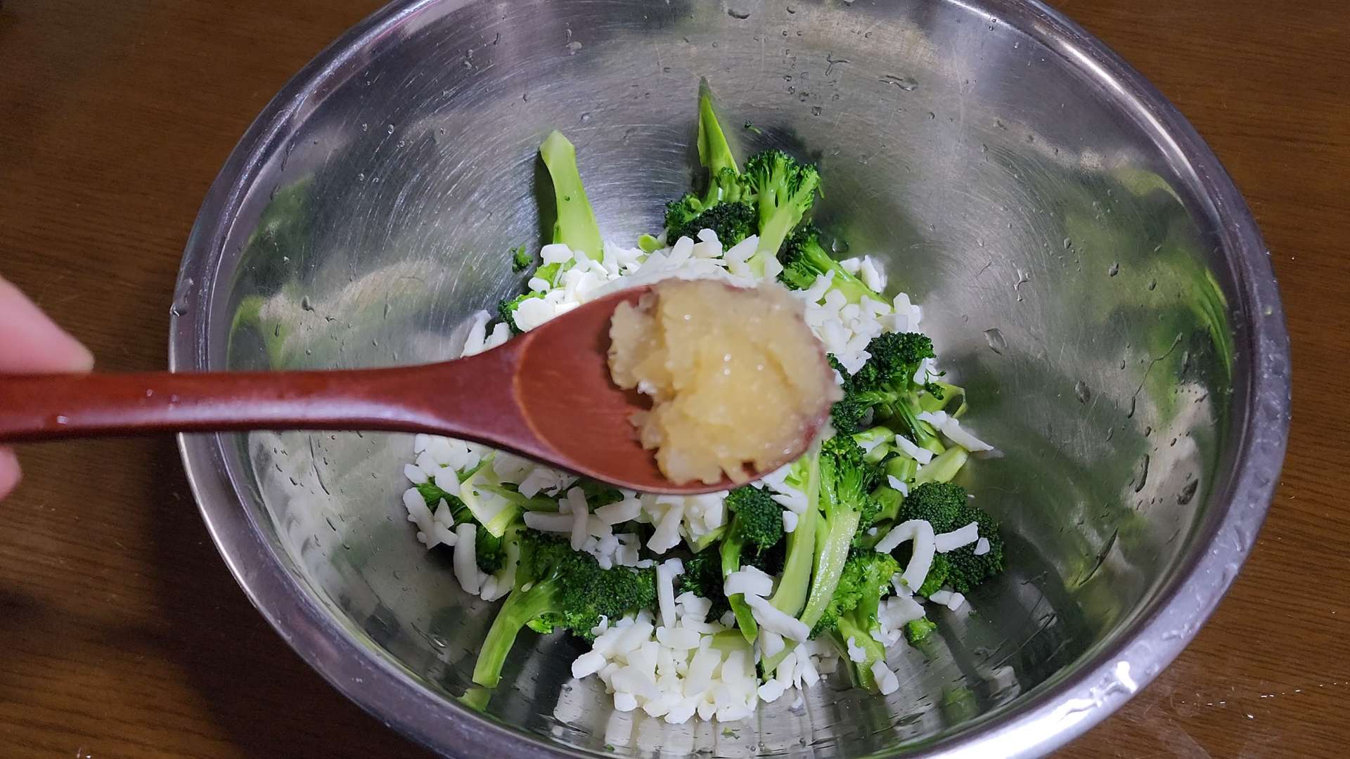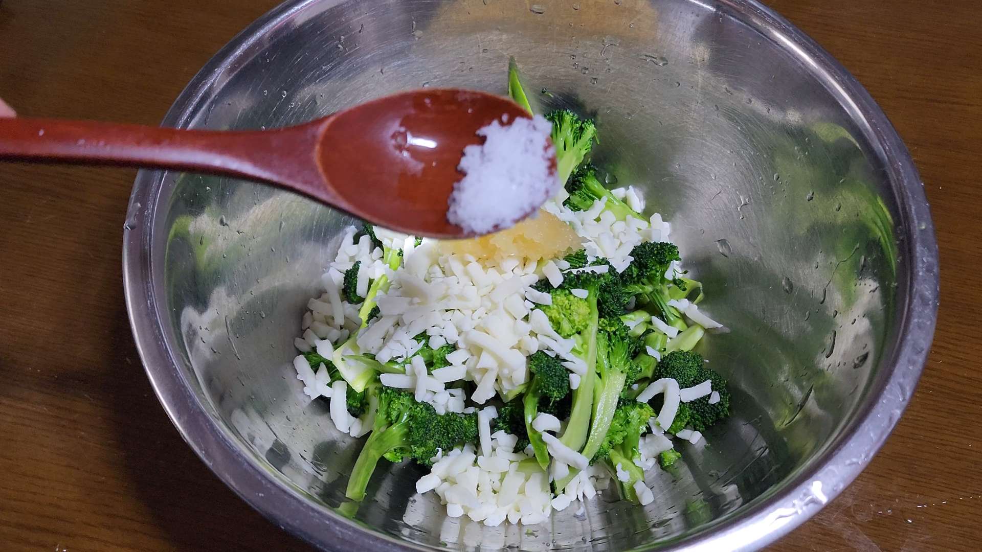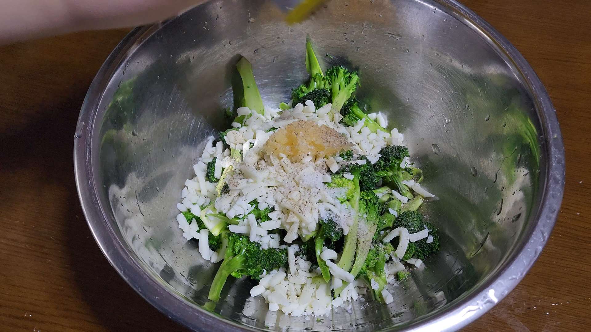 볼에 브로콜리, 모짜렐라 치즈80g, 다진마늘 1/2t, 소금, 후추를 넣고 섞어줍니다.