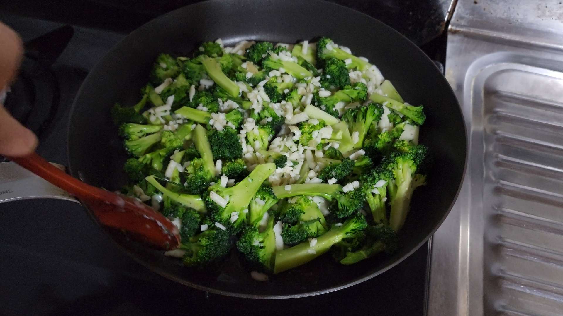 재료: 브로콜리 송이 부분 1개, 모짜렐라 치즈 80g, 다진마늘 1/2t, 소금, 후추, 식용유