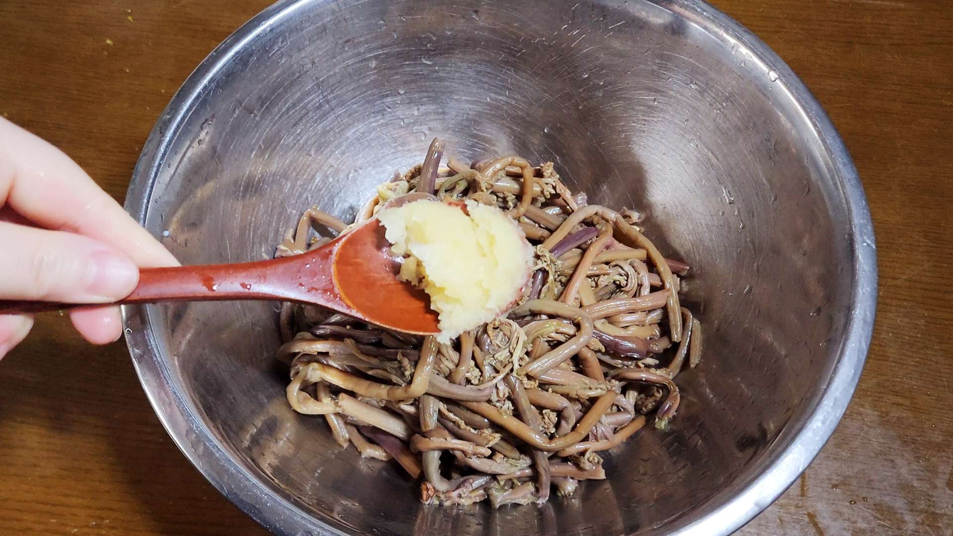 고사리, 국간장 2T, 다진 마늘 0.5T, 참기름 1T을 넣고 무쳐줍니다.