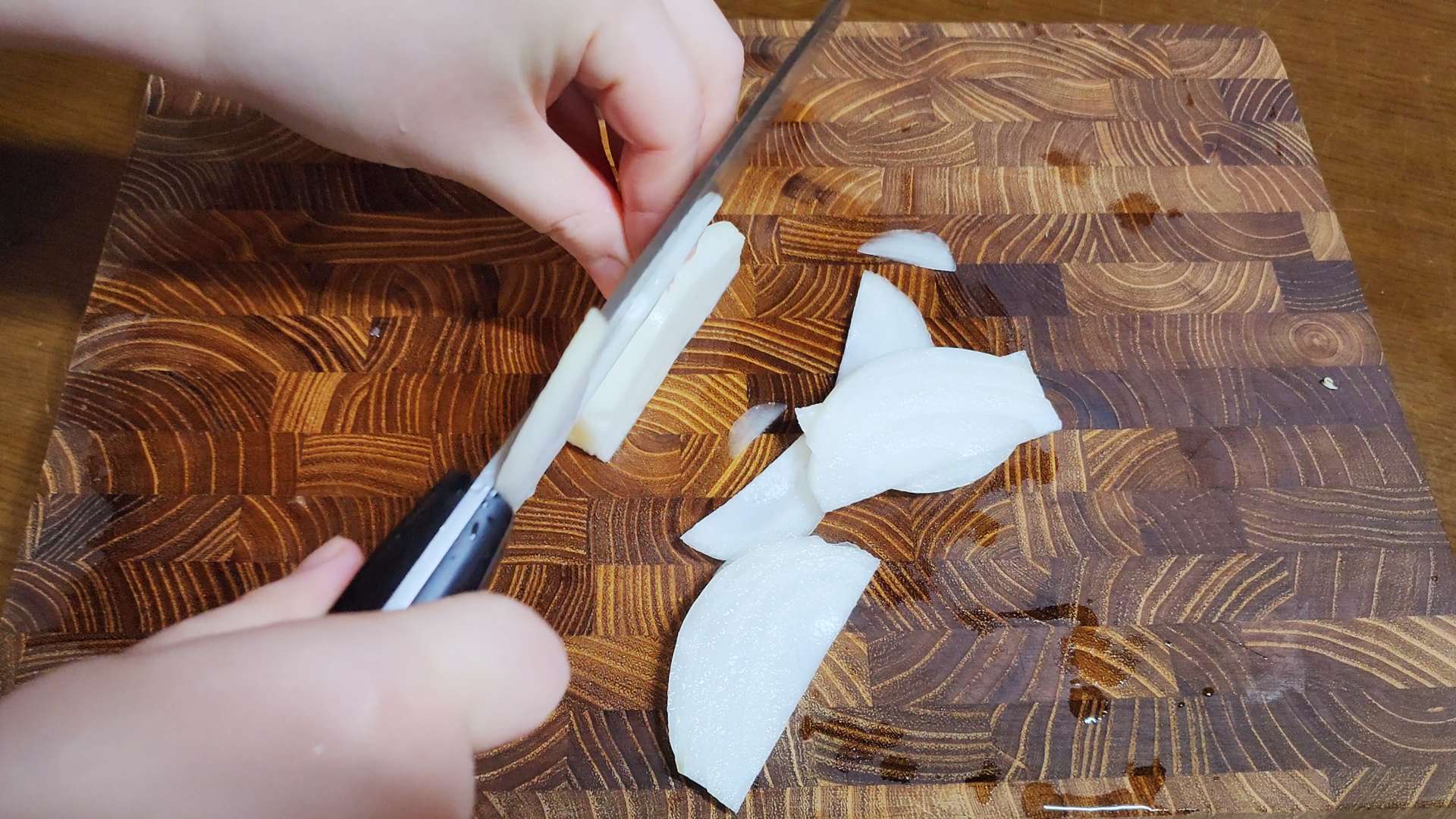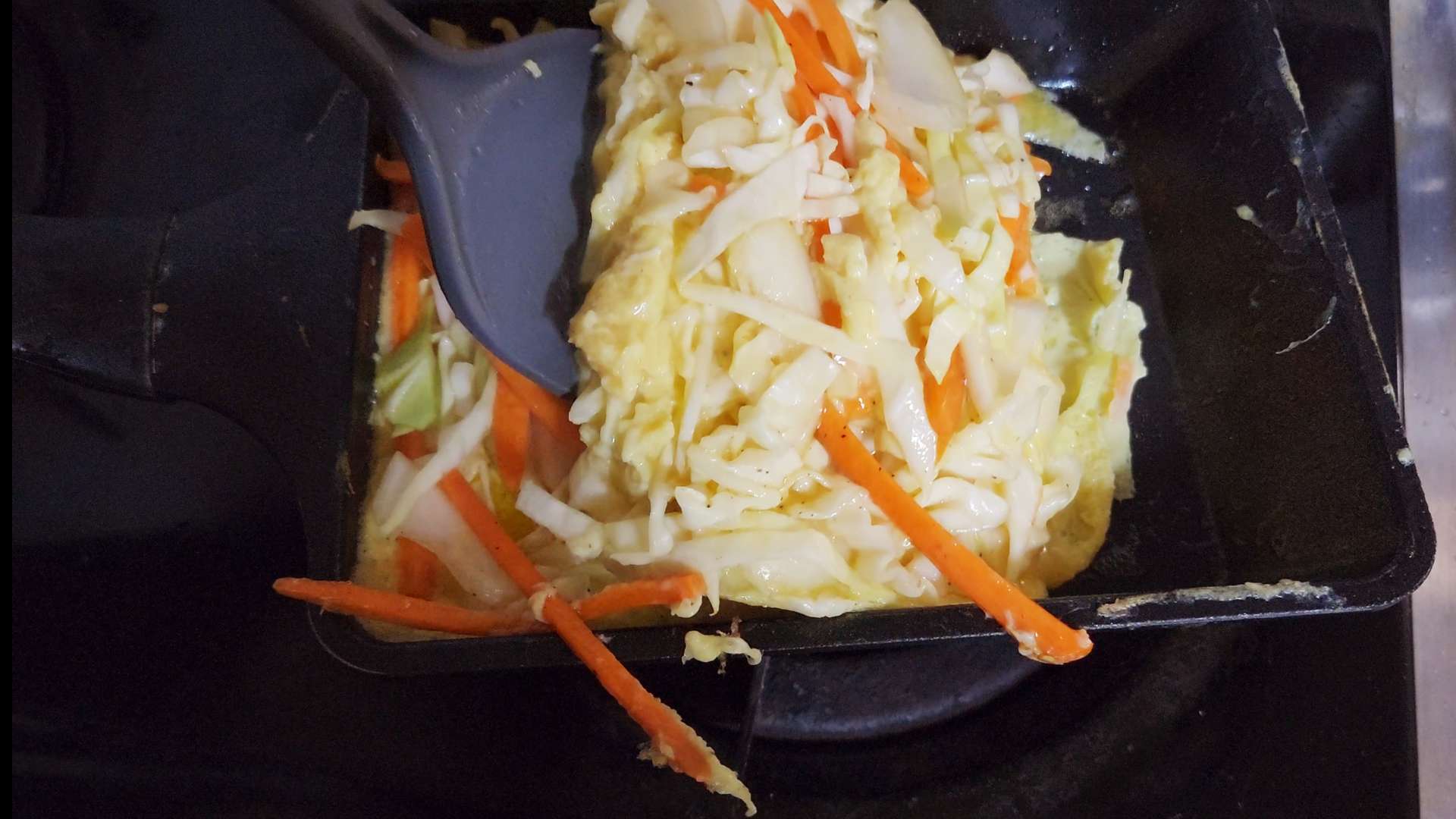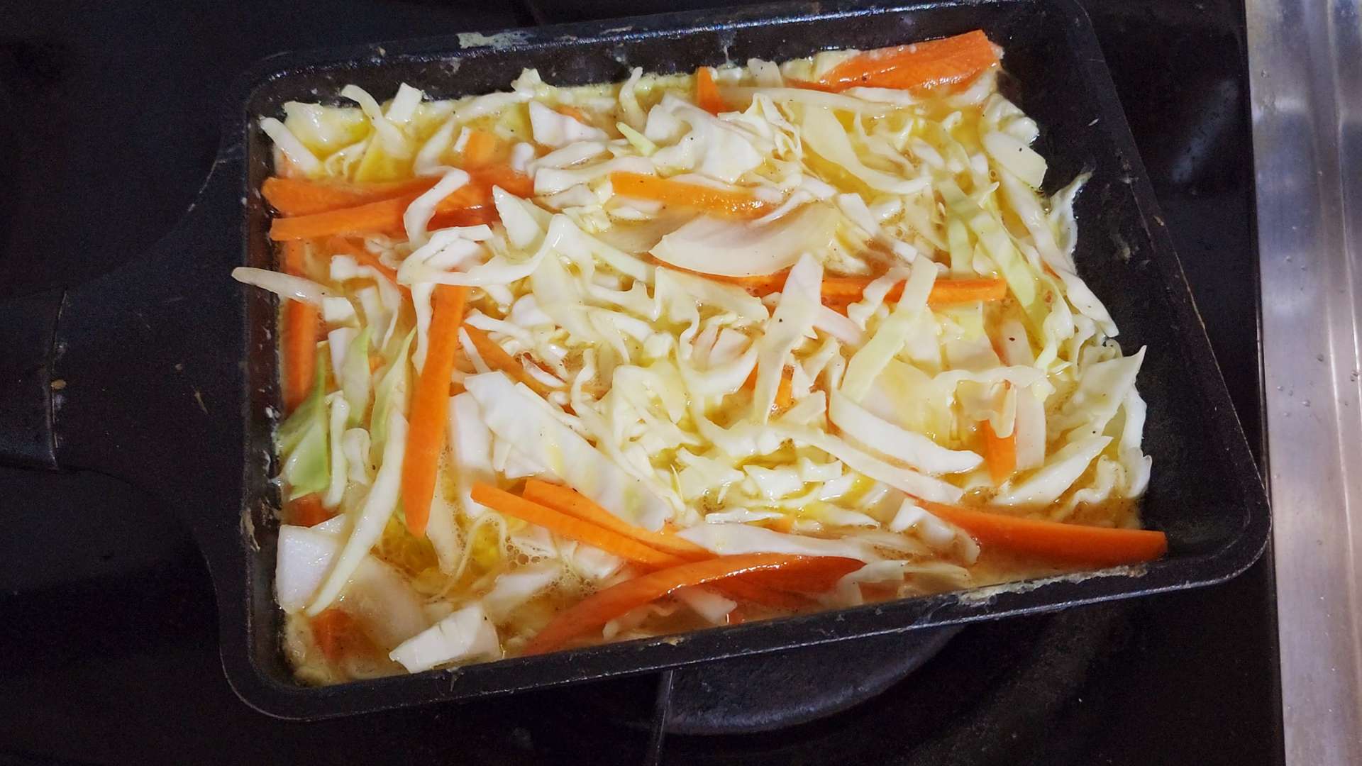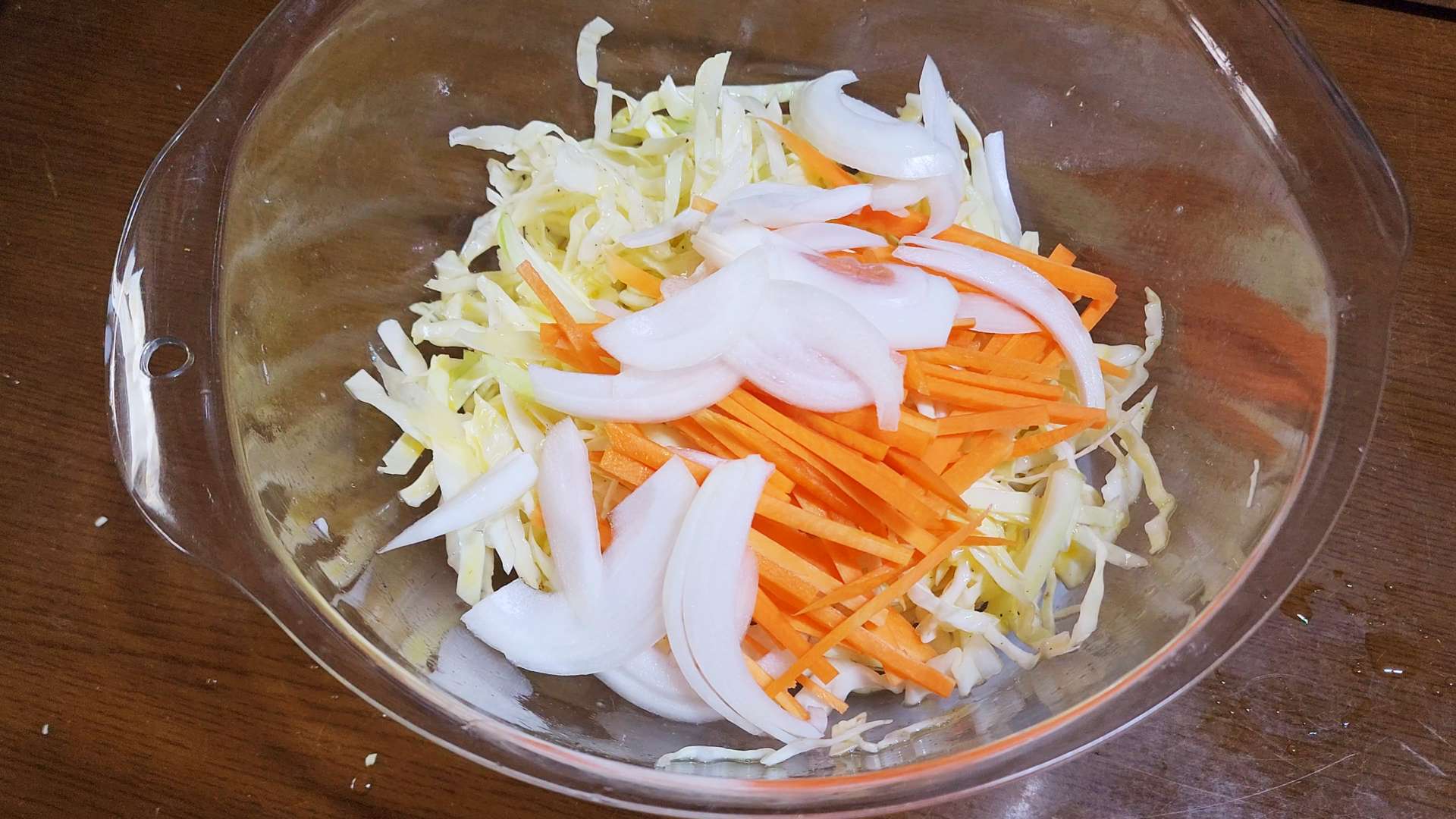 재료: 양배추 1/4통, 양파 1/4개, 당근 한 조각,