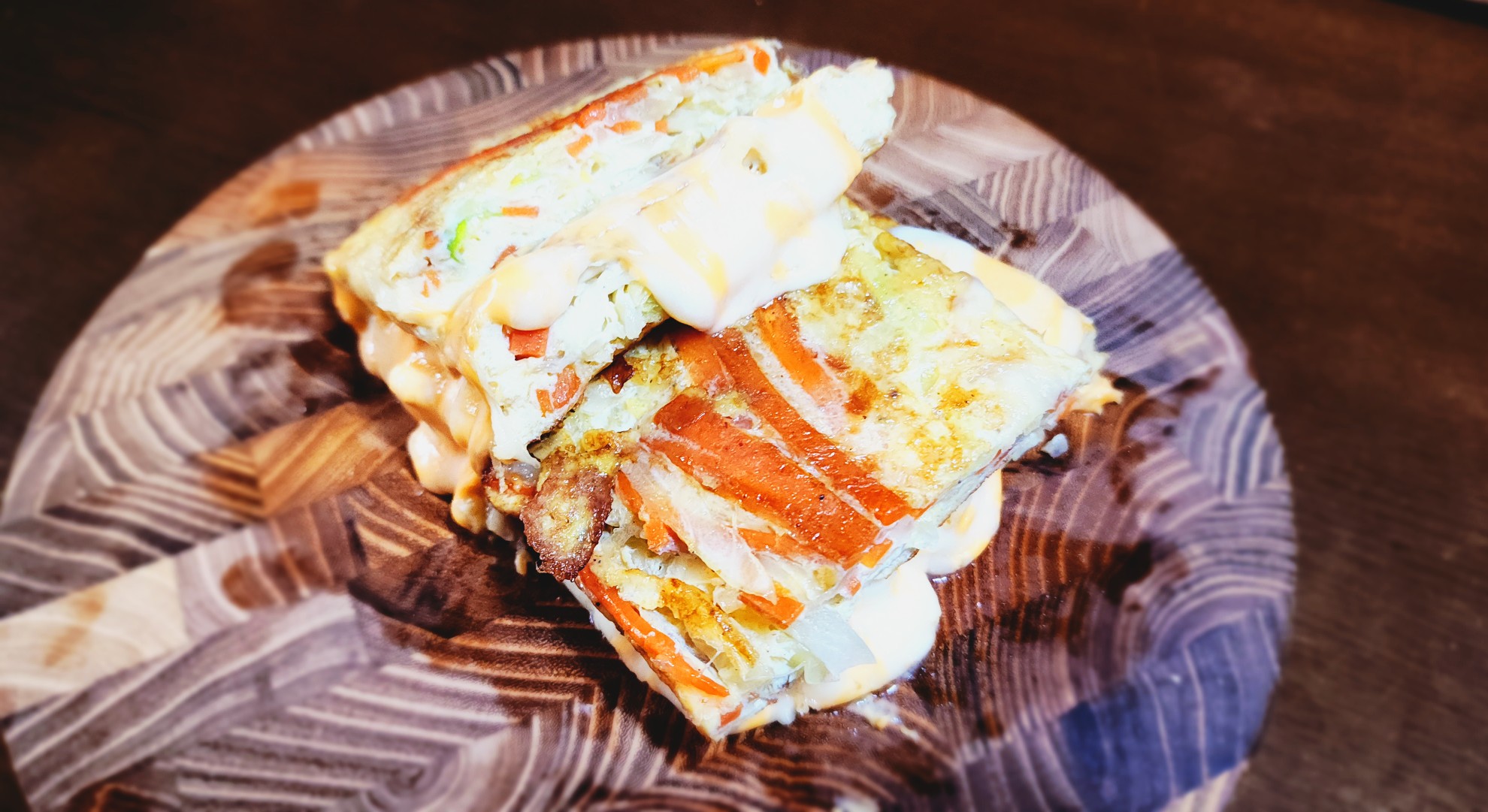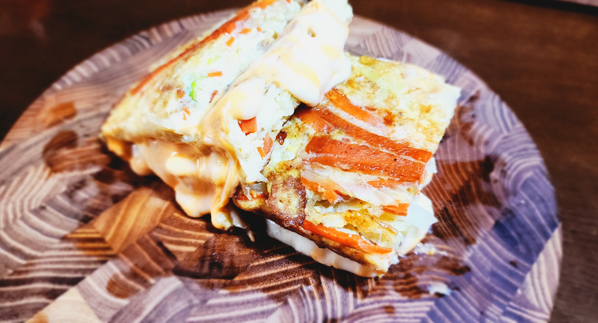 달걀 3알, 소금 1t, 후추 약간, 버터 1/2조각, 식용유, 슬라이스 체다치즈 1장, 모짜렐라 치즈