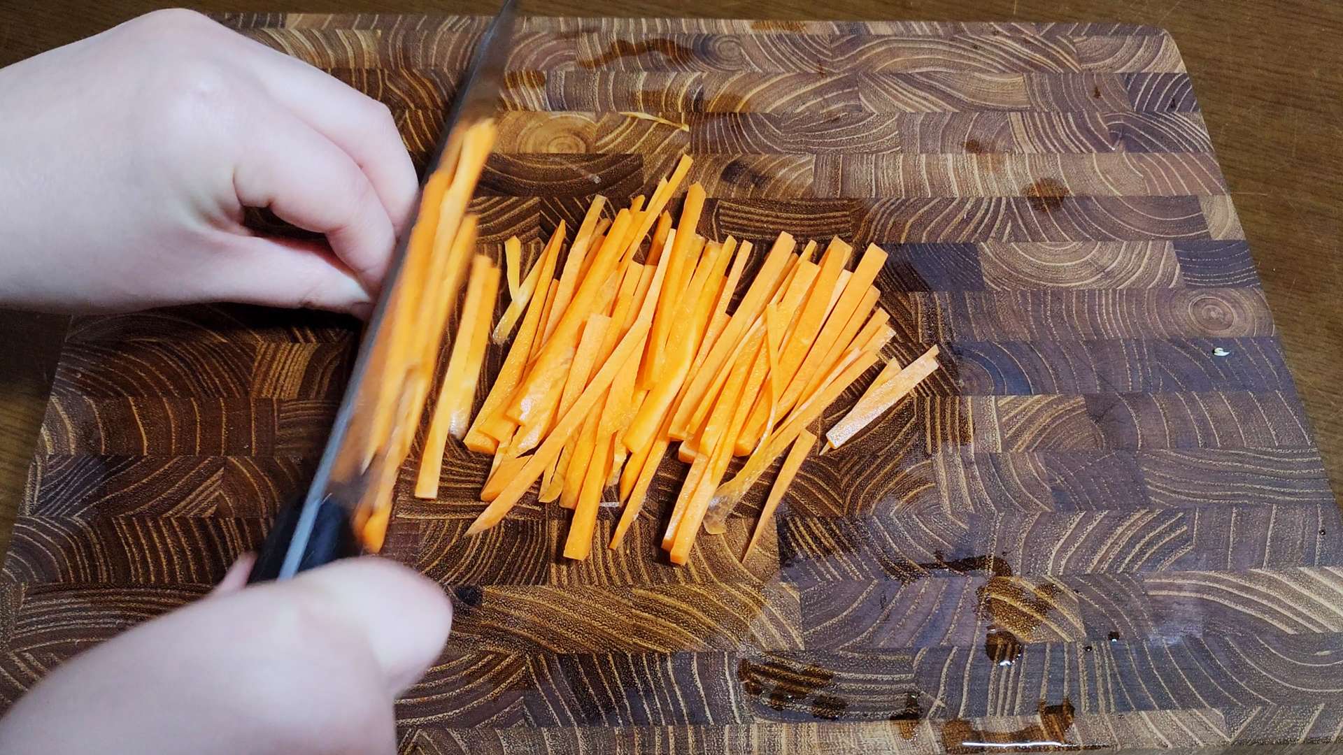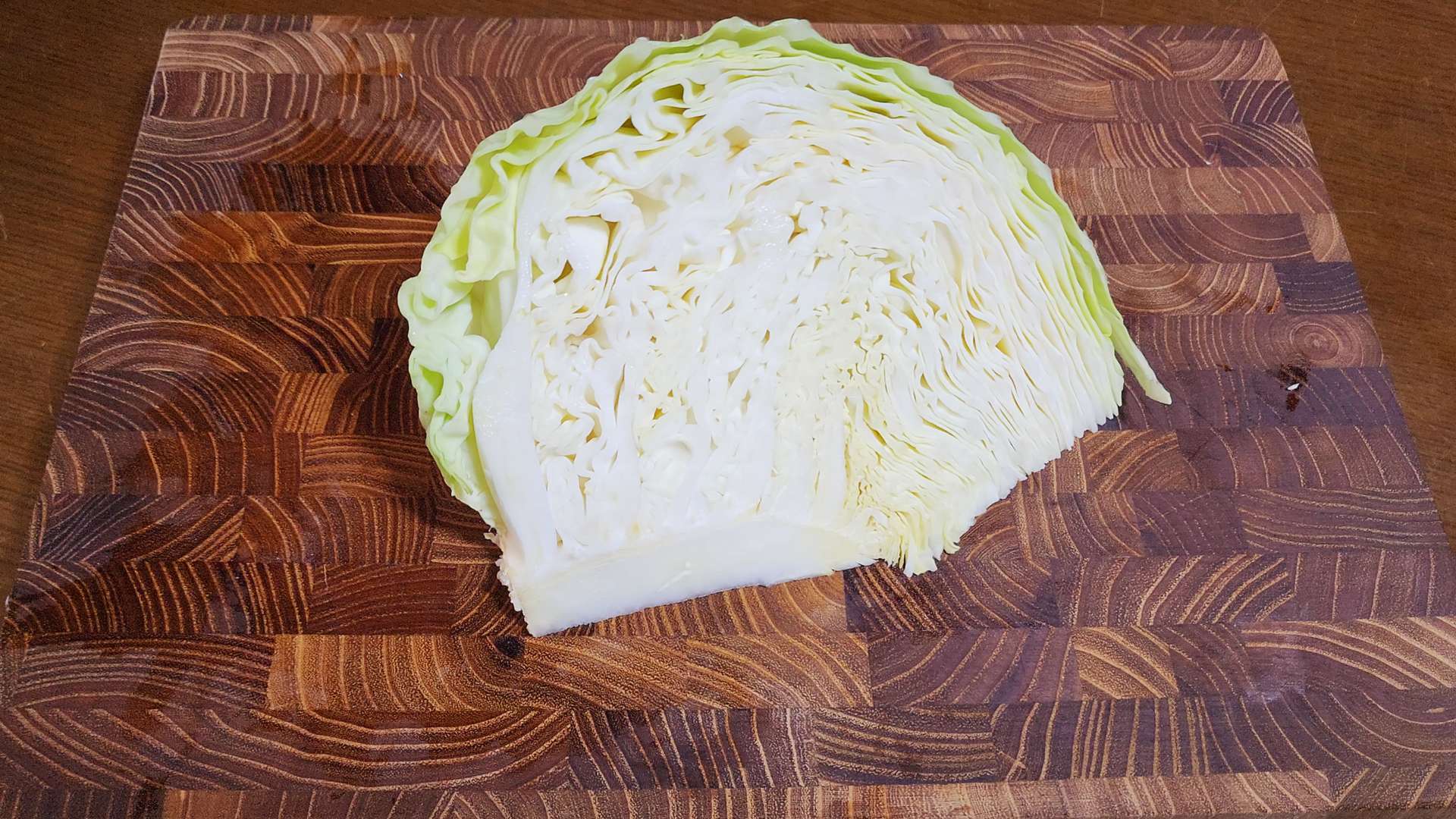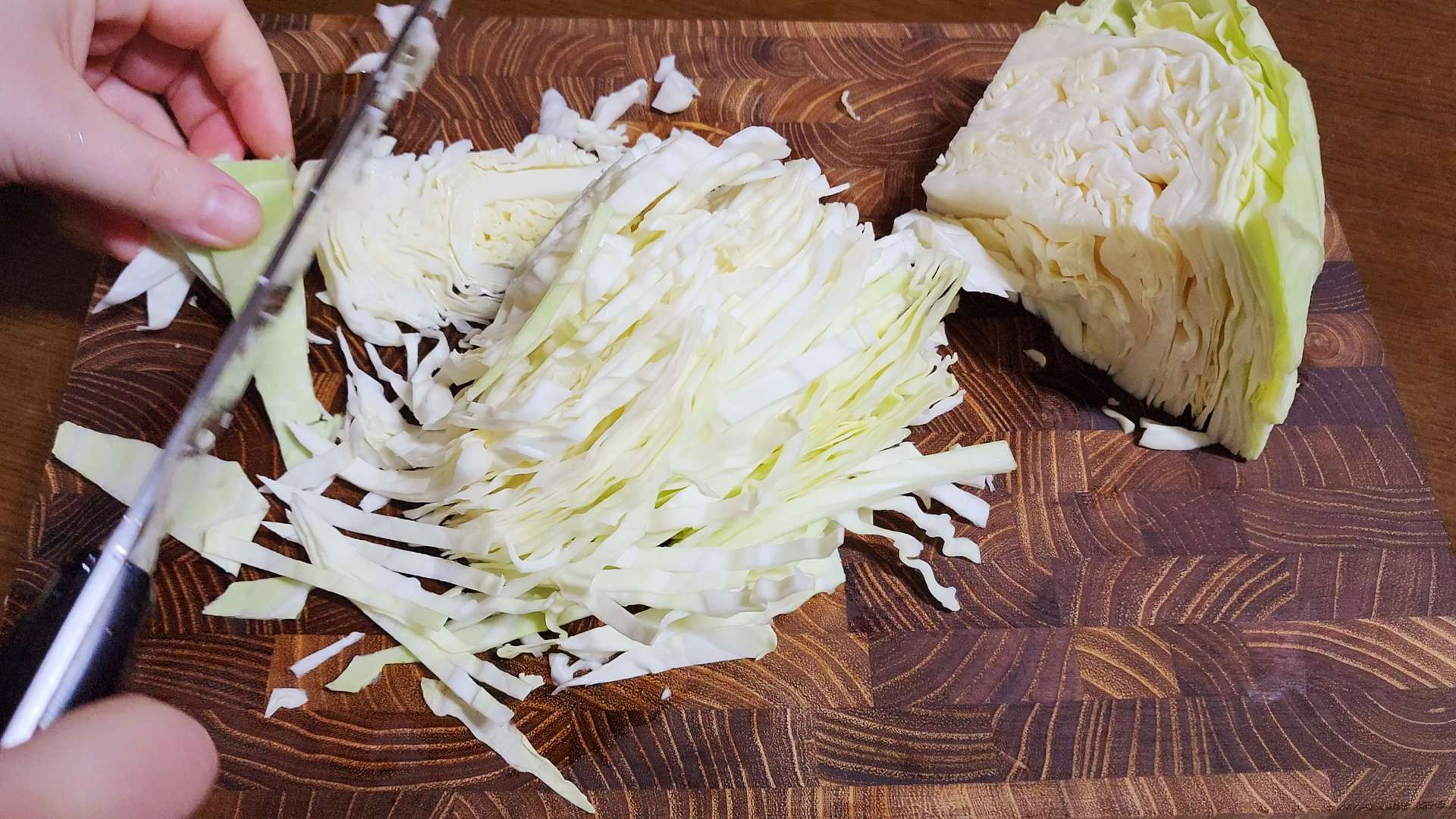 양배추의 심지를 잘라내고 얇게 채썰어줍니다.