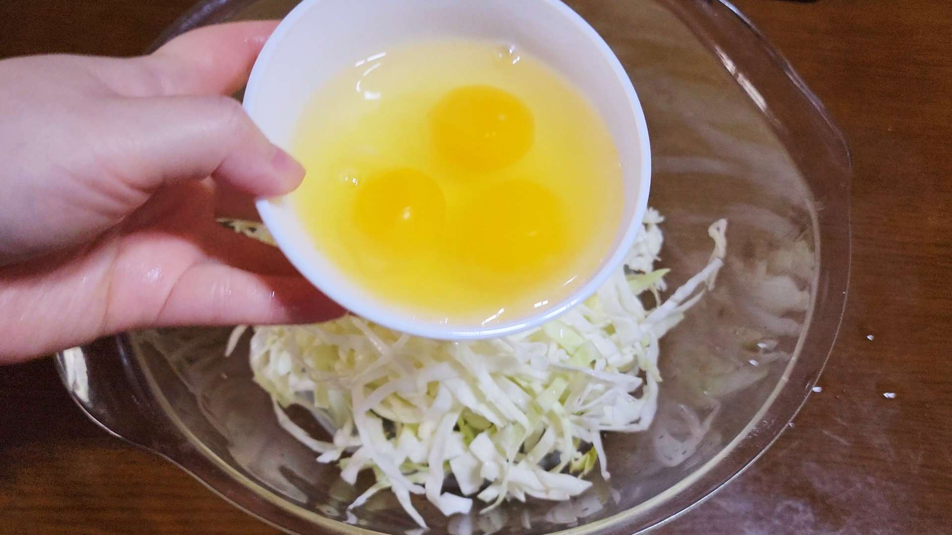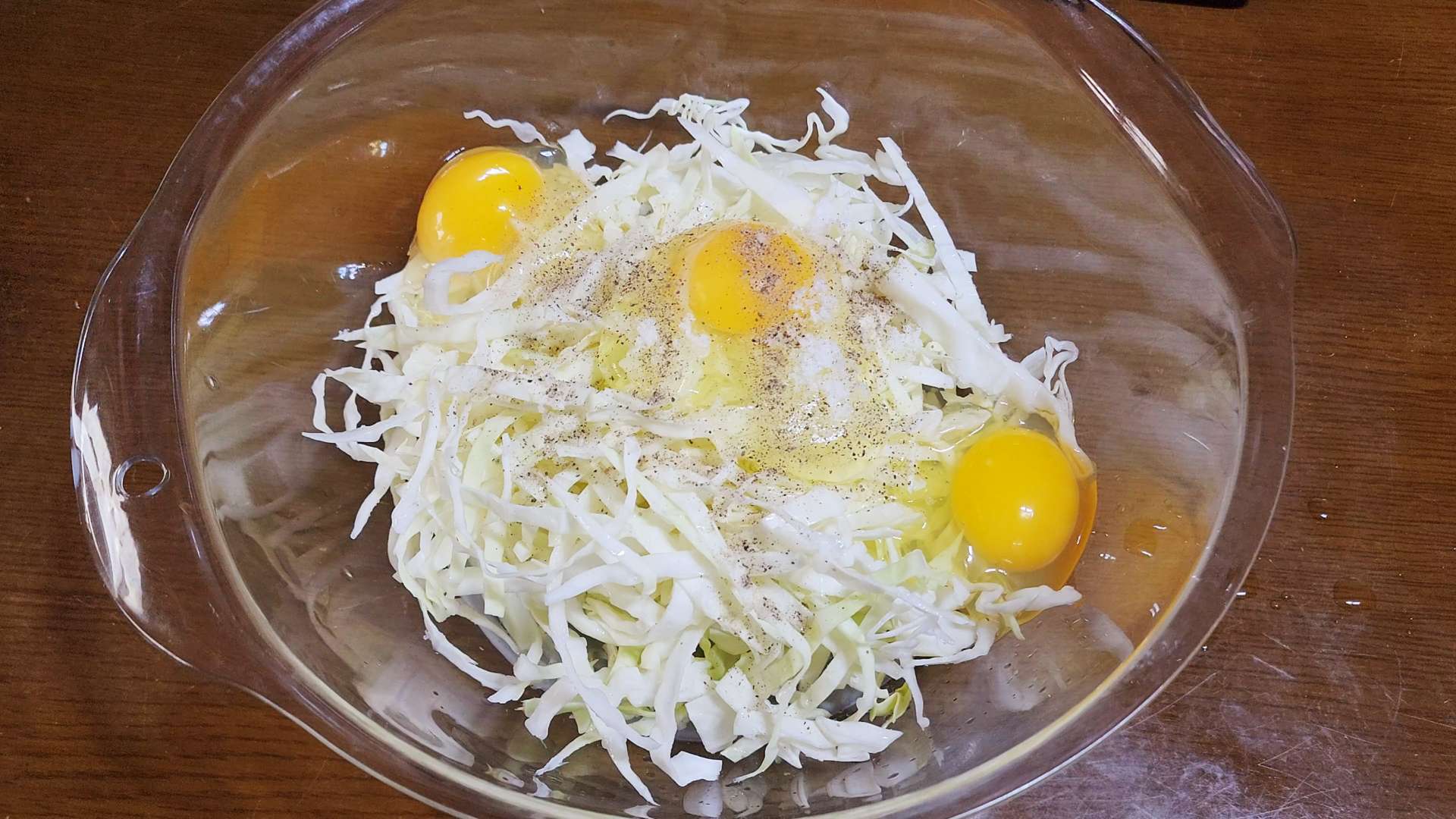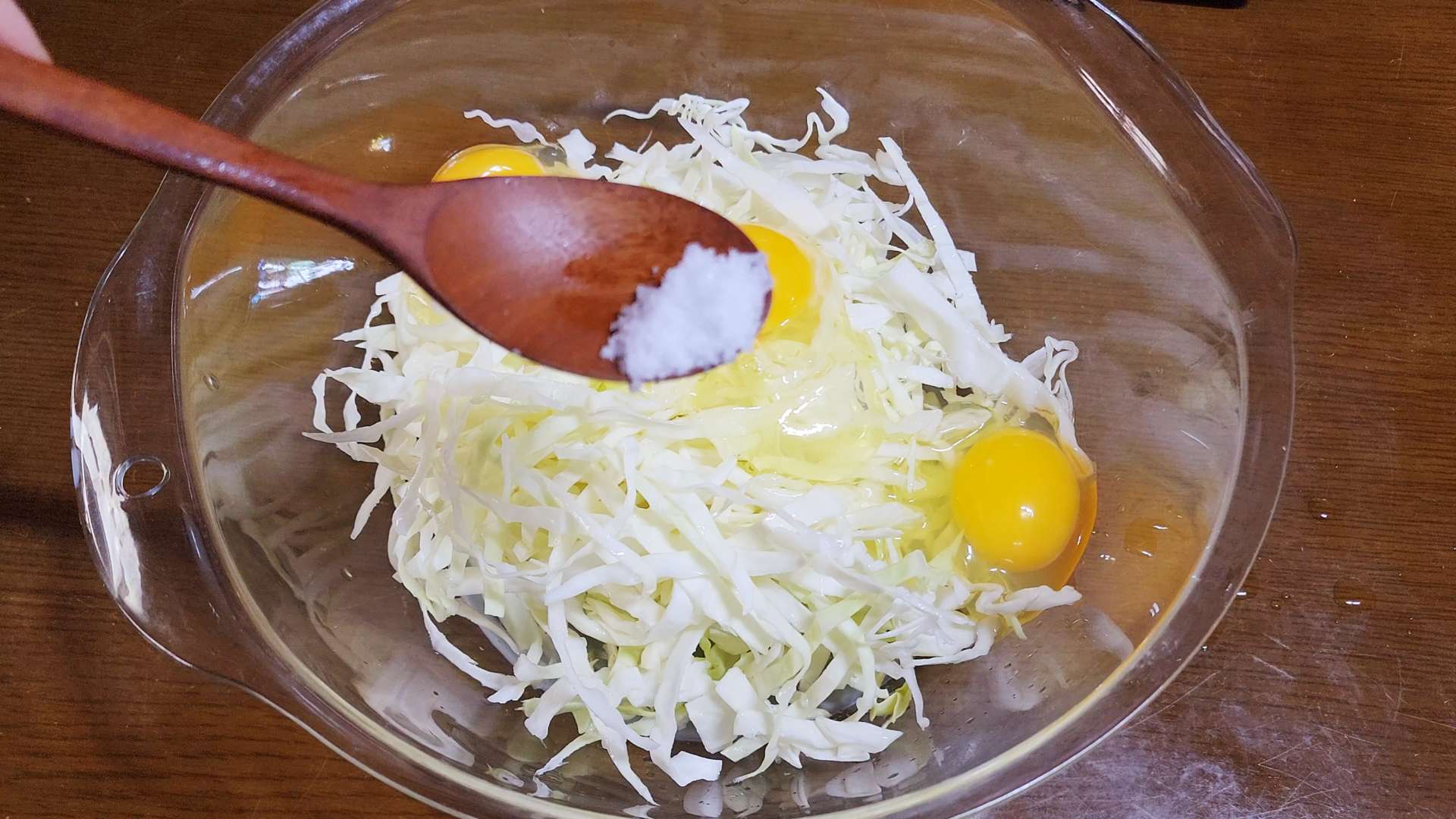 채 썬 양배추, 달걀 3개, 소금 1t, 후추, 당근 양파를 넣고 섞어줍니다.